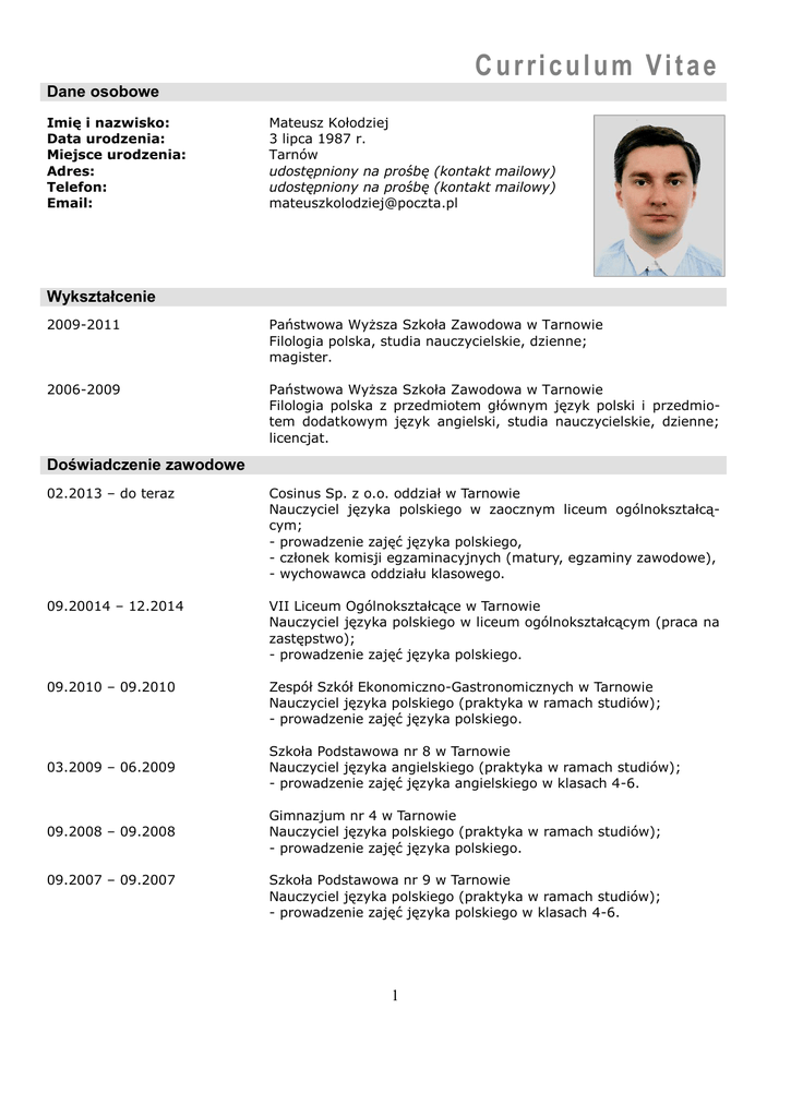 Curriculum Vitae Dane osobowe Imię i nazwisko: Data urodzenia: Miejsce urodzenia: Adres: Telefon: Email: Mateusz Kołodziej 3 lipca 1987 r. Tarnów udostępniony na prośbę (kontakt mailowy) udostępniony na prośbę (kontakt mailowy) [email protected] Wykształcenie 2009-2011 Państwowa Wyższa Szkoła Zawodowa w Tarnowie Filologia polska, studia nauczycielskie, dzienne; magister. 2006-2009 Państwowa Wyższa Szkoła Zawodowa w Tarnowie Filologia polska z przedmiotem głównym język polski i przedmiotem dodatkowym język angielski, studia nauczycielskie, dzienne; licencjat. Doświadczenie zawodowe 02.2013 – do teraz Cosinus Sp. z o.o. oddział w Tarnowie Nauczyciel języka polskiego w zaocznym liceum ogólnokształcącym; - prowadzenie zajęć języka polskiego, - członek komisji egzaminacyjnych (matury, egzaminy zawodowe), - wychowawca oddziału klasowego. 09.20014 – 12.2014 VII Liceum Ogólnokształcące w Tarnowie Nauczyciel języka polskiego w liceum ogólnokształcącym (praca na zastępstwo); - prowadzenie zajęć języka polskiego. 09.2010 – 09.2010 Zespół Szkół Ekonomiczno-Gastronomicznych w Tarnowie Nauczyciel języka polskiego (praktyka w ramach studiów); - prowadzenie zajęć języka polskiego. 03.2009 – 06.2009 Szkoła Podstawowa nr 8 w Tarnowie Nauczyciel języka angielskiego (praktyka w ramach studiów); - prowadzenie zajęć języka angielskiego w klasach 4-6. 09.2008 – 09.2008 Gimnazjum nr 4 w Tarnowie Nauczyciel języka polskiego (praktyka w ramach studiów); - prowadzenie zajęć języka polskiego. 09.2007 – 09.2007 Szkoła Podstawowa nr 9 w Tarnowie Nauczyciel języka polskiego (praktyka w ramach studiów); - prowadzenie zajęć języka polskiego w klasach 4-6. 1 Języki Język polski: Język angielski: ojczysty dobra znajomość w mowie i piśmie Umiejętności znajomość branży edukacyjnej praca z młodzieżą oraz osobami starszymi dobra obsługa komputera, znajomość systemu operacyjnego Windows znajomość pakietu Microsoft Office komunikatywność, praca w zespole, szybkie przyswajanie wiedzy, opanowanie twórcze myślenie i formułowanie wniosków Zainteresowania literatura polska po 1989 roku muzyka koszykówka żużel Publikacje książka „Utwór muzyczny jako środek dydaktyczny na lekcji języka polskiego” (wyd. Novae Res, Gdynia 2010, ISBN 978-83-7722-051-1 opowiadanie „Jeszcze kwadrans” opublikowane na stronie internetowej tygodnika „Przekrój” Informacje dodatkowe Przebyte kursy: szkolenie dotyczące prawa autorskiego w dydaktyce i codziennej pracy szkoły (szkolenie organizowane przez Fundację Legalna Kultura) kurs pierwszej pomocy Inne: korepetytor od 2005 roku autor blogu muzycznego axunarts.pl juror Tarnowskiego Przeglądu Muzycznego Szkół Ponadgimnazjalnych (2014, 2015) Wyrażam zgodę na przetwarzanie moich danych osobowych zawartych w przesłanym CV dla potrzeb niezbędnych w procesie rekrutacji, zgodnie z ustawą z dnia 29.08.1997 roku o Ochronie danych Osobowych (Dz.U.Nr. 133 poz.883). 2