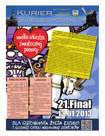 Numer 13, Styczeń 2013 ŚWIĘCIECHOWA - godz. 10. 30 – plaża w Gołanicach - kąpiel morsów w Jeziorze Krzyckim oraz pokaz ratownictwa OSP Święciechowa, - godz. 16. 00 – Zespół Szkół w Święciechowie (sala sportowa): - turniej sportowo-rekreacyjny czterech drużyn z udziałem dzieci, młodzieży, rodziców, radnych oraz sołtysów, - występ artystyczny zespołu szkolnego cheerleaders, - występ taneczny dzieci z klas I-III szkoły podstawowej, - konkurs wiedzy o gminie, - występ taneczny dzieci z Zespołu Pieśni i Tańca Marynia, - występ wokalny w wykonaniu uczennic, - licytacje WOŚP, - godz. 20. 00 – Światełko do Nieba na boisku szkolnym. W nie mocy. dzielę, 13 sty Bę cz pieniąd dzie to już 2 nia, zagra W 1. finał. ielka O ze na r atowan rkiestr T rów. a Świą ie życia ym razem c d z ie W nasz ci i god ała Polska z tecznej Poe n j ą g m o Święcie inie już piekę m bierać będz ie chowie o edyczn szefem d kilku tygodn Anna L ą senio ory id s Zespole ch, Elżbieta S ztabu jest Ma ziałają dwa s ztaby O ria Was zkudlarc Szkół w rk zak kiem K zy ie Święcie ultury. chowie k i Grażyna H , a jego człon stry. W arasim we wsp kami s Drugi s . ą: ó S łp z racy z S ta kami zo ztab funkcjo amorzą b działa przy nuje w stali: Be d o w L ym Ośro a ata Kry rina Tas stians - socicach, tak dzbaje że przy szef sz W jedn w oraz Anna ta s z b k u o i Małgo ym i dru Derda. le. Jego szy. Bę rzata K gim szta człondz ołodzie bie już jczyk, K w godz ie ich łącznie odebra inach p aczterdz n o iden rz ie pach i w wielu edpołudniowy stu jeden. Po tyfikatory dla ja w c in h wią się puszki olontari nych m przed k choć p uprzed iejsc ośc Od god arę złotych. R ach. Przyjmij iołami, na ulic e wszystkim m a z azem u iny 16. c y h ic , p h Szkół w rz życzliw ratować y skle00 Orkie Świę ie i mo s Dla ucz ciechowie, a tra grać będzie żemy czyjeś wrzućmy do ż o e y d w s cie i zdro tników godz. 1 sali gim dzianek wsp 5:0 wie na . Międz y innym ólnego grania 0 w Sali Wiejs stycznej Zesp . gółowe ołu k i s b ie ztaby p program ędą wy j w L a rz so s wszysc y dla O y imprez po tępy, wystawy ygotowały spo cicach. rkiestry dajemy , konku ro niesp poprze rsy, pra zp po onizację rowadzone p cują za darmo niżej. Powied licytacje. Szcz ro e. przepro z P g m ra o y c m z je ą y arty wszy o szcze, wad Nam w d udo że ypada za się społecz styczne, poka grania. zy, licyta stępnienia sa Do zob więc jedynie z nie. l cje – ca aczenia aprosić łą orga m w niedz ielę, 13 ieszkańców g miny do stycznia wspóln . ego LASOCICE - występ rodziców w repertuarze Kabaretu Moralnego Niepokoju pt."Wizyta ksiądza", - pokaz taneczny pt. "Jezioro łabędzie" w wykonaniu uczniów, - występy przedszkolaków, - występ chóru szkolnego Lasocice/Długie Stare, - taniec w maskach Gangnam style i inne, - występ Filipa Rozynka, - capoeira, czyli sztuki walki, - kącik dla dzieci przygotowany przez Fundację Centrum Aktywności Twórczej, - Jagoda Stachowiak i Daria Izydorczyk w repertuarze muzyki współczesnej, - Adrianna Łuczak w tańcu indyjskim. [2] KURIER ŚWIĘCIECHOWSKI Jarmark Świąteczny Tydzień przed Bożym Narodzeniem w Sali Wiejskiej w Święciechowie panowała już świąteczna atmosfera. Koło Gospodyń Wiejskich Włościanki zaprosiło mieszkańców na Jarmark Świąteczny pn. „Potrawy wigilijne i słodkości w naszej gminie”. Na przybyłych gości czekało sporo atrakcji. Swoje potrawy wystawiały Koła Gospodyń Wiejskich działające na terenie gminy. Wszystkie podlegały ocenie konkursowej. Jury pod uwagę wzięło nie tylko smak poszczególnych potraw i słodkości, ale także świąteczny wygląd stołu i ogólny wizerunek stoiska. Po burzliwych dyskusjach wyłoniono zwycięzców. Wioski uplasowały się w następującej kolejności: Gołanice, Długie Nowe, Strzyżewice, Święciechowa, Przybyszewo i Trzebiny. Po ocenie komisyjnej nastąpiła degustacja potraw przez przybyłych gości. Ponadto odbyła się sprzedaż stroików świątecznych przeprowadzona przez Zespół Szkół w Święciechowie oraz sprzedaż pierników zorganizowana przez KGW. Całości towarzyszył koncert miejscowych zespołów. W świąteczny klimat wprowadzały Zespoły Śpiewacze Wiola i Cecylia, Zespół Klawinuta z ogniska muzycznego w Święciechowie oraz duet Patrycja i Miłosz Tulewicz. Imprezę zorganizowano pod patronatem wójta gminy Marka Lorycha. W leszczyńskim ratuszu 15 grudnia zorganizowano obchody Dni Honorowego Krwiodawstwa. W spotkaniu wzięli udział wszyscy, którzy poprzez zaangażowanie w krwiodawstwo przyczyniają się do ratowania ludzkiego życia. Idea oddawania krwi staje się z roku na rok coraz bardziej popularna, a poszczególne akcje przynoszą coraz lepsze wyniki. Przybyłych gości przywitał Przemysław Idczak, który dziękował za dar krwi – dar prosto z serca. Przyznano dwie Odznaki Honorowe Polskiego Czerwonego Krzyża IV stopnia klubom honorowych krwiodawców. Trafiły one do Komendy Miejskiej Policji w Lesznie oraz Ochotniczej Straży Pożarnej w Niechłodzie. Wręczono również indywidualne Odznaki Honorowe na ręce: Mariusza Musielaka, Krzysztofa Mrozińskiego z Niechłodu i Krzysztofa Nowaka.Podczas uroczystości leszczyńscy włodarze wyróżnili także najbardziej aktywnych krwiodawców. W dowód uznania za najpiękniejszy dar humanitarny przyznano specjalne odznaki dla trzydziestu siedmiu osób, które oddały po 18, 12 i 6 litrów krwi. Ponadto osoby biorące udział w obchodach mogły wysłuchać koncertu młodzieży z Państwowej Szkoły Muzycznej w Lesznie. Wkrótce Dzień Babci i Dzień Dziadka. Z tej okazji wszystkim babciom i dziadkom życzymy spokoju, zdrowia i miłości najbliższych. Jesteśmy pewni, że w czasie ich święta żaden wnuk nie zapomni o laurce, kwiatku czy po prostu serdecznym uścisku. Bo taka pamięć jest dla dziadków najcenniejsza. Świadczy o tym, że są kochani, potrzebni i 