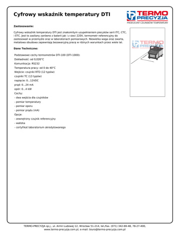 Cyfrowy wskaźnik temperatury DTI Zastosowanie: Cyfrowy wskaźnik temperatury DTI jest znakomitym uzupełnieniem piecyków serii ITC, CTC, i ETC. Jest to zasilany zarówno z baterii jak i z sieci 220V, termometr referencyjny do zastosowań w przemyśle oraz w laboratoriach pomiarowych. Niewielka waga oraz zwarta, metalowa obudowa zapewniają bezawaryjną pracę w różnych warunkach przez wiele lat. Dane Techniczne: Podstawowe cechy termometrów DTI-100 (DTI-1000): Dokładność: od 0,026°C Komunikacja: RS232 Temperatura pracy: od 0 do 40°C Wejście: czujniki RTD (12 typów) czujniki TC (13 typów) napięcie: 0...12VDC prąd: 0...24 mA opór: 0...4 kW Cechy: - dwa wejścia dla czujników - pomiar temperatury - pomiar oporu - pomiar prądu (mA) Opcje: - zewnętrzny czujnik referencyjny - walizka - certyfikat laboratorium akredytowanego TERMO-PRECYZJA sp.j., ul. Armii Ludowej 12, Wrocław 51-214, tel./fax. (071) 342-69-48, 78-27-400, www.termo-precyzja.com.pl, e-mail: [email protected]
