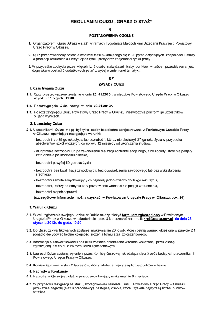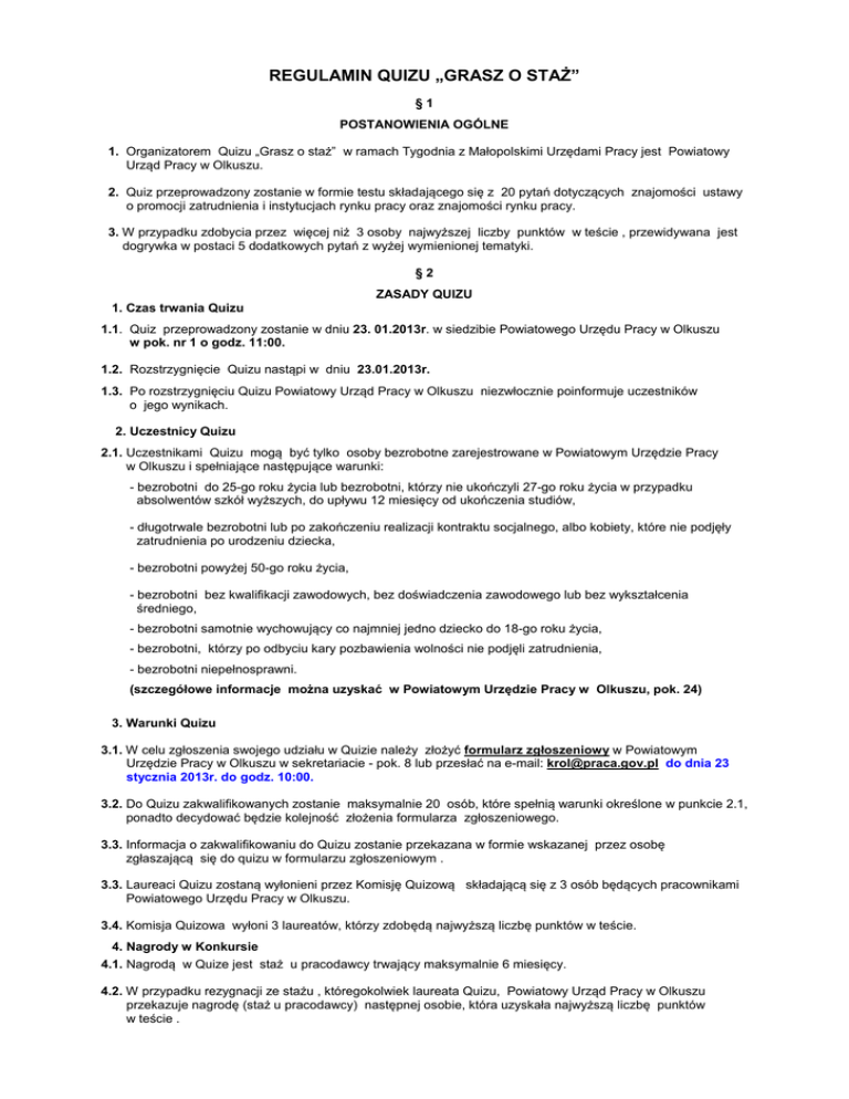 REGULAMIN QUIZU „GRASZ O STAŻ” §1 POSTANOWIENIA OGÓLNE 1. Organizatorem Quizu „Grasz o staż” w ramach Tygodnia z Małopolskimi Urzędami Pracy jest Powiatowy Urząd Pracy w Olkuszu. 2. Quiz przeprowadzony zostanie w formie testu składającego się z 20 pytań dotyczących znajomości ustawy o promocji zatrudnienia i instytucjach rynku pracy oraz znajomości rynku pracy. 3. W przypadku zdobycia przez więcej niż 3 osoby najwyższej liczby punktów w teście , przewidywana jest dogrywka w postaci 5 dodatkowych pytań z wyżej wymienionej tematyki. §2 ZASADY QUIZU 1. Czas trwania Quizu 1.1. Quiz przeprowadzony zostanie w dniu 23. 01.2013r. w siedzibie Powiatowego Urzędu Pracy w Olkuszu w pok. nr 1 o godz. 11:00. 1.2. Rozstrzygnięcie Quizu nastąpi w dniu 23.01.2013r. 1.3. Po rozstrzygnięciu Quizu Powiatowy Urząd Pracy w Olkuszu niezwłocznie poinformuje uczestników o jego wynikach. 2. Uczestnicy Quizu 2.1. Uczestnikami Quizu mogą być tylko osoby bezrobotne zarejestrowane w Powiatowym Urzędzie Pracy w Olkuszu i spełniające następujące warunki: - bezrobotni do 25-go roku życia lub bezrobotni, którzy nie ukończyli 27-go roku życia w przypadku absolwentów szkół wyższych, do upływu 12 miesięcy od ukończenia studiów, - długotrwale bezrobotni lub po zakończeniu realizacji kontraktu socjalnego, albo kobiety, które nie podjęły zatrudnienia po urodzeniu dziecka, - bezrobotni powyżej 50-go roku życia, - bezrobotni bez kwalifikacji zawodowych, bez doświadczenia zawodowego lub bez wykształcenia średniego, - bezrobotni samotnie wychowujący co najmniej jedno dziecko do 18-go roku życia, - bezrobotni, którzy po odbyciu kary pozbawienia wolności nie podjęli zatrudnienia, - bezrobotni niepełnosprawni. (szczegółowe informacje można uzyskać w Powiatowym Urzędzie Pracy w Olkuszu, pok. 24) 3. Warunki Quizu 3.1. W celu zgłoszenia swojego udziału w Quizie należy złożyć formularz zgłoszeniowy w Powiatowym Urzędzie Pracy w Olkuszu w sekretariacie - pok. 8 lub przesłać na e-mail: [email protected] do dnia 23 stycznia 2013r. do godz. 10:00. 3.2. Do Quizu zakwalifikowanych zostanie maksymalnie 20 osób, które spełnią warunki określone w punkcie 2.1, ponadto decydować będzie kolejność złożenia formularza zgłoszeniowego. 3.3. Informacja o zakwalifikowaniu do Quizu zostanie przekazana w formie wskazanej przez osobę zgłaszającą się do quizu w formularzu zgłoszeniowym . 3.3. Laureaci Quizu zostaną wyłonieni przez Komisję Quizową składającą się z 3 osób będących pracownikami Powiatowego Urzędu Pracy w Olkuszu. 3.4. Komisja Quizowa wyłoni 3 laureatów, którzy zdobędą najwyższą liczbę punktów w teście. 4. Nagrody w Konkursie 4.1. Nagrodą w Quize jest staż u pracodawcy trwający maksymalnie 6 miesięcy. 4.2. W przypadku rezygnacji ze stażu , któregokolwiek laureata Quizu, Powiatowy Urząd Pracy w Olkuszu przekazuje nagrodę (staż u pracodawcy) następnej osobie, która uzyskała najwyższą liczbę punktów w teście .
