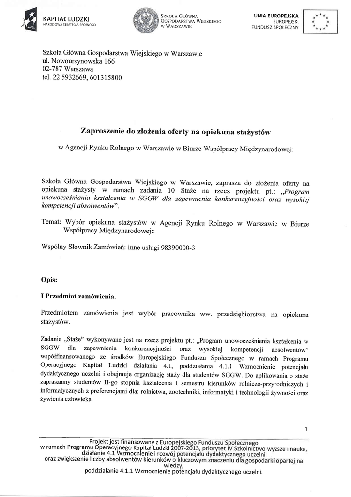 KAPITA( LUDZKI NARODOWA StRAtt(,tA SPOlNoicl (it:.0r.vNn SzKotr,A GOSPODARSTwa Wlrrsrlrco \\r WARSZA$r]]l UNIAEUROPEJSKA ET,IROPEJSKI I.UNDUSZ SPOI.ECZNY SzkolaGl6wnaGosprodarstwa Wiejskiegow Warsizawie ul. Nowoursynowsker 166 02-787Warszawa tel.22 5932669. 601315800 Zapr<>szeniedo zloLenia oferty na opiekuna staiyst6w w AgencjiRynkuRolnegow warszawiew Biurzewsp6lpracyMigdzynarodowej: Szkola Gl6wna Gospodarstwa Wiejskiego w Warszawie, zaprasza do zloZenia oferty na opiekuna staZysty w ramach zadania 10 Staze na tzecz projektu pt.: ,,Program unowoczeiniania ksztalcenia w SGGW dla zapewnienia konkurencyjnofci oraz wysokiej kompetencji obsolw ent6w" . Temat:Wyb6r opiekunasta2yst6ww Agencji Rynku Rolnego w Warszawiew Biurze Wsp6lpracyMigdzynarodowej :: Wsp6lnySlownik Zam6wieit:inne uslugi98390000-3 Opis: I Przedmiot zam6wienia. Przedmiotem zam6wienia jest wyb6r pracownika ww. przedsiEbiorstwa na opiekuna staZyst6w. Zadanie,,Staze"wykonywanejest na rzecz projektupt.: ,,Programunowoczesnienia ksztalceniaw SGGW dla zapewnienia konkurenoyjnoSciota.z wysokiej kompetencji absolwent6w,' wsp6lfinansowanego it'e Srodk6w EuropejskiegoFunduszuSpolecznegow ramach programu OperacyjnegoKapitalf Ludzki dziaNania4.1, poddziatania4.I.1 Wzmocnienie potencjalu dydaktycznego uczelni i obejmuje organizacjgstaLydla student6wSGGW.Do aplikowaniao staLe zapraszamystudent6wII-go stopnia ksztalceniaI semestrukierunk6w rolniczo-przyrodniczych i informatycznych z pref'erencjami dla: rolnictwa, zootechniki,informatyki i technologiiirywno1cioraz zywieniaczlowieka. t :@ w ramachProgramuOperdcyjnego Kapital'Ludzki i dziafanie 4.i. Wzmocnienie i rozw6 orazzwiqkszenie liczbyabsolwent6wkierunk6wr poddzialanie 4.L.Lwr.o.n i"#l"pote ncjatudydaktycznegouczeIni, KAPITA( LUDZKI NAirot)0wASIRAtLOtASPOINOSCI (il.0wNA Sz-K0i,A GOSPODARSTwA WIII.ISKIEGo W WARSZA$;II]] U N I AE U R O F E J S K A E(JROPEJSKI FUNDUSZ SPOLECZNY Stazedla 16os6bodbywadsi9bgdqprzeztrzyrniesiqce (od 01 lipca}}l}r. do 30 wrzesnia2012r.)w nastgpuj reprezentuj 4cychj ednostkach r 6Lne branhe: 4cych l.Brania informatyczrai obslugirolnictwa: - ARR w Warszawie,Iliuro Teleinformatvki. - ARR w Warszawie,Biuro Wsp6lpracyMigdzynarodowej, 2. Brania przemyslurolno-spoZywczego : - AgrosNovaSp.z o.o.w tr-owiczu, - OSMN,owiczwtr-owiczu 3 . Br an2,aprodukcji rol nej : - GospodarstwoNasiennoRolne,,Biovinas', Sp. zo.o.w Chodowie, - Hodowla RoSlin StrzelceSp. zo.o. w Strzelcach, - OSrodekHodowli ZatodowejOsigciny Sp. z o.o. w Osigcinach, - Rolniczy ZakNadDoSwiadczalny SGGW w Zelaznej, W ka2dej z jednostek na stahubgdzie przebywalo dwrich stazyst6w, ktorzy b9d4 go realizowali we wsp6lpracy z opiekunem stazyst6w z ramienia danesozakladu. rkuna Stazu w ARR w Biurze Wsp6lpracy od przystqpieniaPolski do Unii Europejskiej Inicza i zajmuje siE: wyplacaniem Srodk6w mechanizm6w WpR i krajowych, wydaje eneficj ent6w mechanizmow administrowanych ptzez ARR, prowa<Izi dzialalnoS1 kontroln4 w zakresie potwierdzenia uprawnieri do wyplaconych Srodk6w finansowych, przekazuje Komisji Europejskiej informaii" doty"rq"" RR, informuje uczestnik6w mechanizm6w o w odniesieniu do reahzowanvch przez ARR rynarodowejodpowiada za wspolpracpAgencji rtnerami z krajow UE oraz kraj6w trzecich. rodci z agencjami pLatniczymi UE, sluzbami rodo'weprogramy pomocowe, w tym poprzez ucjami kraj6w trzecich, m.rn. z plac6wkami RpwkrajachtrzecicrrBiuro*,ill,il"lli",ffi;xih.K;fi:fi Tt,il:#H,ff:::: x,ffi uczestnictwem ARR w procesie decyzyjnym rJF, oruz zapewnieniem udziaNuAgencji w pracachnarzeczprzygotowamai sprawowaniaprzezPolskE przewodnictwaw RadzieUE. Do zadartwybranegoOpiekunabgdzienaleinNo migdzyinnymi: - propozycjaprogramprzebiegustazui przedstawienie gr:kierownictwuprojektu, - nadz6rmerytorycztrynad staZystami w celu zralizowaniazaplanowanego programu, - sprawdzanie, weryfikowaniei autoryzowanie comiesigcznych sprawozdafr stazyst6w. - udziatw spotkaniupanelowymw sGGW po zakonczeniu stazu. Opiekun sta2yst6wz tamienia zakladubqdzie wsp6lpracowal z dwoma stazystami przez okres trzechwakacyjnych rnLie siEcy ( 1.07-30.0g.2012). Projektjestfinansowany z Europeffi.€oFundLtszu w ramachProgra.mu. a.mu. u operacyjnego Operdryjnego Ope racyjnegoKapital Kapital'Lud Ludzki zki2007_ )OOl-Zdtg.priorytet oriorvte iV Szkolnictwo wyzszei nauka, dzialanie 4.1_ Wzmocnienie i roz.w6j rozw6ipotencjalu oot dyd'a ktycznego uczelni orazzwiqkszenie Lv+v, l,r rvr y tE L t v J4\vil ilLLW(J ticzby absorwenr6w kierunk6w nKowo 6iiJ;,o,ilft"rh;;;;;i..;';ir k l u c ; l o w v mz n a c z e n i ud l a clTp;;Lrri s o s n n d : i opartejna poddziatanie 4.1'.rwr r o. niu,Hitjotl6nc.ia lu dydaktycznego uczeIni. KAPITA( LUDZKI NAROD0WA SIRAtIC,lASPOJNOSCI UNIAEUROFEJSKA EL,l ROPEJS KI FUNDUSZ SPOT,ECZNY SzK0t,AGt.riwirrr GoSPODARSTWA WIEJsKlEcio W WAHSZA$ITI]: II. Opiekunowiestaiyst6w(warunki obligatoryjne) Opis sposobudokonywaniaoceny spelnianiawarunk6w udzialu w konkursie na wyb6r opiekunastazysty: Lp r :2 + WarunkiubieganiasiEo rolq opiekunastaZysty i Sporoboceny ', zgodadyrektorra przedsiqbiorstwa i spelnia/ nie spelnia : CY zwykazanymdoSwiadczeniem,zawodowym , Spelnia/ nie spelnia , :' staZu i Prlnozycjaprogramu Spelnia/ nie spelnia Dokumenty potwierdzaj4ce spelnieniewarunk6w udzialu w postppowaniu: - pisemna zgoda dyrektora przedsigbiorstwa dla pracownika ubiegajecegosiE o bycie Opiekunem sta2yst6w(w g zahqczone go wzoru), - CY zwykazarrym 5-cio letnim doSwiadczeniem zawodoymw wersji papierowej, ' wykaz praktyk lub staZy (minimum dwa), w kt6ryc-h dany piacownik - iiandydat na opiekuna stazyst6wsprawowal opiekE/nadz6r. - Propozycjaprograrniustazu Musi byd to osoba do$wiadczonamerytorycznie w danej dziedzinie produkcji jak i posiada6 doSwiadczeniew zarzqdzaniu zespolami ludzi i organizacji pracy * bpiekun "uldudrie. stazyst6wmusi by6 osob4 decyzyjnqi pracuj4cq na kierowniczym stanowisku. Oferowanacena uslugi (wynagrodzeniebrutto zatrr-y miesi4ce) nie moze przel<roczy6 kwoty: 6 000,00zl III. Termin pelnienia roli opiekuna staiyst6w: DatarozpoczEcia0