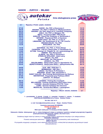 SANOK - ZURYCH - MILANO linia obsługiwana przez 5,7 07:30 08:30 08:35 09:00 09:30 09:45 10:15 10:45 11:15 12:00 12:30 14:30 14:40 15:00 15:15 15:30 16:15 16:45 18:00 19:15 20:00 20:45 04:00 04:30 05:15 05:35 06:15 07:00 07:30 08:15 10:00 10:30 11:00 12:00 Wyjazdy z Polski: piątek, niedziela SANOK - Dw. PKP, ul.Dworcowa 4 KROSNO - Dw. PKS ul. Naftowa st. Międzynarodowe KROSNO - Dw. PKP, wjazd od ul. Lniarskiej i Kolejowej JASŁO - Dw. PKP, ul. Metzgera 106 BIECZ - Przystanek MZK / PKS Rynek GORLICE - Dawny Dw. Kolejowy, ul. Bardiowska 4 GRYBÓW - Przystanek PKS, ul.Topolowa NOWY SĄCZ - Dw. PKS, st. 13 lub 14 LIMANOWA - Dw. Autobusowy st. Nr. 1 BT LimaTur MSZANA DOLNA - Dw. PKS MYŚLENICE - Dw. PKS ------------------------------------KATOWICE - Dw. PKS, ul. Piotra Skargi CHORZÓW - LDS S.A. Stacja paliw, ul. Racławicka 32 BYTOM - Parking C.H. 'Plejada' Al. J.N. Jeziorańskiego 25 ZABRZE - Plac Warszawski GLIWICE - Dw. PKS ul. Pionierów 8 STRZELCE OPOLSKIE - Hotel Leśny OPOLE - Dw. PKS WROCŁAW - Dw. PKS peron 5 LEGNICA - Dw. PKS BOLESŁAWIEC - Stacja paliw Lotos ul. Zgorzelecka 16 JĘDRZYCHOWICE - Stacja paliw SHELL, Jędrzychowice 98b ------------------------------------ULM - HBF / ZOB Stan. 5 MEMMINGEN - HBF Stan. 1 LINDAU - Karl Baver Pl./Parkplatz 3 BREGENZ - Busbf. / Hbf. stanowisko C SANKT GALLEN - Bus Parking/ Bahnhofstrasse bei Rathaus WINTERTHUR - Przystanek przy Parkhaus ARCH ZURYCH - Pl. Sihlquai ------------------------------------LUCERNA - Parking Bus Inselipark BELLINZONA - Parking autobusowy obok hotelu Union LUGANO - Dworzec Kolejowy FFS PTE. Tresa COMO - Dworzec Kolejowy San Giovanni MEDIOLAN - Terminal Bus Milano - Lampugnano -----------------------------------------Wyjazdy z Włoch: wtorek, niedziela 13:15 12:30 12:25 12:00 11:45 11:30 11:00 10:30 10:00 09:30 09:00 07:00 06:50 06:30 06:15 06:00 05:15 04:30 03:00 02:00 01:15 00:15 17:30 16:45 16:00 15:30 14:30 13:30 12:30 11:30 10:00 09:30 08:45 08:00 2,7 1 – poniedziałek, 2- wtorek, 3 środa, 4 – czwartek, 5-piątek, 6 – sobota , 7- niedziela CENTRALNA REZERWACJA w Polsce Autokar Polska Tel. 032 / 222 14 71 e- mail [email protected] Skype : Autokar Polska Centralna rezerwacja GG 8885284 WAŻNE INFORMACJE BILET OPEN Bilet open ważny jest 12 miesięcy od daty wyjazdu. Datowanie biletów dokonywane jest w miarę dostępnych miejsc w autokarze i powinno nastąpić przynajmniej 2 tygodnie przed planowaną datą powrotu. Opłata: 20 zł lub 5 euro. NADBAGAŻ Dodatkowy bagaż maże być zabrany w miarę wolnego miejsca, każdorazowo decyduje o tym załoga autobusu. PRZEWÓZ ZWIERZĄT Przewóz zwierząt jest zabroniony – wyjątek stanowią psy przewodnicy osób niewidomych. ZWROT BILETU W przypadku rezygnacji z przejazdu, zwrot należności dokonuje kasa, w której bilet był zakupiony wg poniższych zasad: bilet jednostronny : powyżej 14 dni przed wyjazdem - potrącenie 10% wartości biletu, od 14 dni do 3 dni przed wyjazdem - potrącenie 25% wartości biletu, od 3 dni do 1 dnia przed wyjazdem - potrącenie 50% wartości biletu, w dniu wyjazdu, przed godziną odjazdu - potrącenie 90 % wartości biletu, bilet dwustronny lub Open : w przypadku zwrotu biletu dwustronnego mają zastosowanie zasady jak w przypadku biletu jednostronnego, przy czym pod uwagę brana jest tylko data wyjazdu, bilet dwustronny - zwrot powrotu : zwrot dla klienta to różnica ceny biletu dwukierunkowego i jednokierunkowego minus wartość potrącenia zależna od daty powrotu wg zasad jak przy bilecie jednostronnym, bilet dwustronny Open - zwrot powrotu : zwrot dla klienta to różnica ceny biletu dwukierunkowego i jednokierunkowego minus 10 % wartości tej kwoty. Nie wystawia się duplikatów biletów i nie zwraca się należności za bilet zagubiony. Przy zwrotach biletów zakupionych przez moduł Euroticket www Oferent biletu / Autokar Polska /pobiera opłatę manipulacyjną w wysokości 10 % wartości biletu zgodnie z Regulaminem korzystania z modułu Euroticket www. Osoby nieletnie winny posiadać upoważnienie do przewozu osoby nieletniej /druk na stronie www.autokarpolska .com.pl w dziale dla agentów / Uwaga: Pasażer proszony jest o stawienie się 15 min przed planowanym odjazdem autokaru.