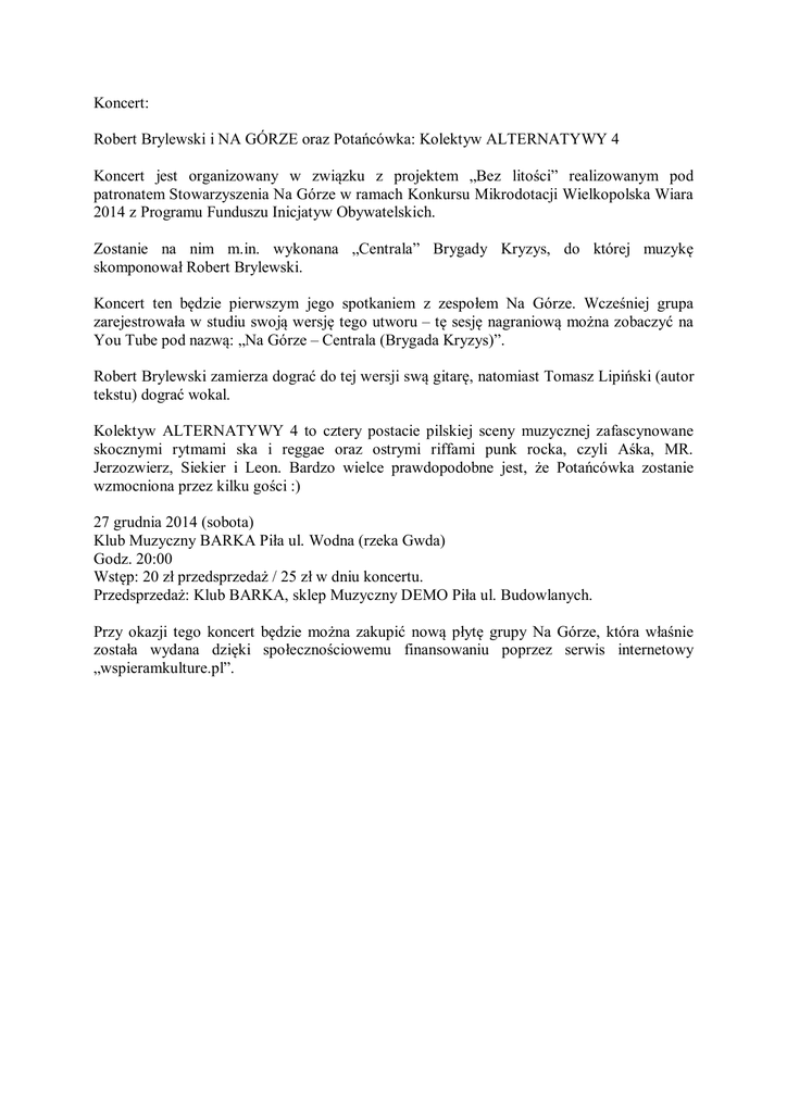 Koncert: Robert Brylewski i NA GÓRZE oraz Potańcówka: Kolektyw ALTERNATYWY 4 Koncert jest organizowany w związku z projektem „Bez litości” realizowanym pod patronatem Stowarzyszenia Na Górze w ramach Konkursu Mikrodotacji Wielkopolska Wiara 2014 z Programu Funduszu Inicjatyw Obywatelskich. Zostanie na nim m.in. wykonana „Centrala” Brygady Kryzys, do której muzykę skomponował Robert Brylewski. Koncert ten będzie pierwszym jego spotkaniem z zespołem Na Górze. Wcześniej grupa zarejestrowała w studiu swoją wersję tego utworu – tę sesję nagraniową można zobaczyć na You Tube pod nazwą: „Na Górze – Centrala (Brygada Kryzys)”. Robert Brylewski zamierza dograć do tej wersji swą gitarę, natomiast Tomasz Lipiński (autor tekstu) dograć wokal. Kolektyw ALTERNATYWY 4 to cztery postacie pilskiej sceny muzycznej zafascynowane skocznymi rytmami ska i reggae oraz ostrymi riffami punk rocka, czyli Aśka, MR. Jerzozwierz, Siekier i Leon. Bardzo wielce prawdopodobne jest, że Potańcówka zostanie wzmocniona przez kilku gości :) 27 grudnia 2014 (sobota) Klub Muzyczny BARKA Piła ul. Wodna (rzeka Gwda) Godz. 20:00 Wstęp: 20 zł przedsprzedaż / 25 zł w dniu koncertu. Przedsprzedaż: Klub BARKA, sklep Muzyczny DEMO Piła ul. Budowlanych. Przy okazji tego koncert będzie można zakupić nową płytę grupy Na Górze, która właśnie została wydana dzięki społecznościowemu finansowaniu poprzez serwis internetowy „wspieramkulture.pl”.