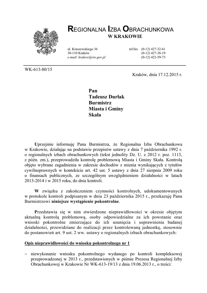 REGIONALNA IZBA OBRACHUNKOWA W KRAKOWIE ul. Kraszewskiego 36 30-110 Kraków e-mail: [email protected] tel/fax (0-12) 427-32-61 (0-12) 427-38-19 (0-12) 422-59-73 WK-613-80/15 Kraków, dnia 17.12.2015 r. Pan Tadeusz Durłak Burmistrz Miasta i Gminy Skała Uprzejmie informuję Pana Burmistrza, że Regionalna Izba Obrachunkowa w Krakowie, działając na podstawie przepisów ustawy z dnia 7 października 1992 r. o regionalnych izbach obrachunkowych (tekst jednolity Dz. U. z 2012 r. poz. 1113, z późn. zm.), przeprowadziła kontrolę problemową Miasta i Gminy Skała. Kontrolą objęto wybrane zagadnienia w zakresie dochodów z mienia wynikających z tytułów cywilnoprawnych w kontekście art. 42 ust. 5 ustawy z dnia 27 sierpnia 2009 roku o finansach publicznych, ze szczególnym uwzględnieniem działalności w latach 2013-2014 i w 2015 roku, do dnia kontroli. W związku z zakończeniem czynności kontrolnych, udokumentowanych w protokole kontroli podpisanym w dniu 23 października 2015 r., przekazuję Panu Burmistrzowi niniejsze wystąpienie pokontrolne. Przedstawia się w nim stwierdzone nieprawidłowości w okresie objętym aktualną kontrolą problemową, osoby odpowiedzialne za ich powstanie oraz wnioski pokontrolne zmierzające do ich usunięcia i usprawnienia badanej działalności, przewidziane do realizacji przez kontrolowaną jednostkę, stosownie do postanowień art. 9 ust. 2 ww. ustawy o regionalnych izbach obrachunkowych: Opis nieprawidłowości do wniosku pokontrolnego nr 1 niewykonanie wniosku pokontrolnego wydanego po kontroli kompleksowej przeprowadzonej w 2013 r., przedstawionych w piśmie Prezesa Regionalnej Izby Obrachunkowej w Krakowie Nr WK-613-19/13 z dnia 19.06.2013 r., o treści: „Przy sprzedaży nieruchomości w drodze przetargu pisemnego nieograniczonego, wyznaczanie dodatkowych warunków, które winni spełniać uczestnicy przetargu, a dzięki którym oferty, poza ceną, mogłyby być weryfikowane, zgodnie z art. 40 ust. 2 ustawy z dnia 21 sierpnia 1997 r. o gospodarce nieruchomościami oraz § 16 pkt 5, § 17 ust. 2 pkt 5 i § 21 rozporządzenia Rady Ministrów z dnia 14 września 2004 r. w sprawie sposobu i trybu przeprowadzania przetargów oraz rokowań na zbycie nieruchomości.” Osoba odpowiedzialna za powstanie nieprawidłowości: Burmistrz Miasta i Gminy. Powyższa nieprawidłowość dotycząca niewykonania wniosku pokontrolnego została razem z innymi nieprawidłowościami stwierdzonymi w trakcie niniejszej kontroli problemowej, opisana szczegółowo w dalszej części wystąpienia pokontrolnego. Wniosek pokontrolny nr 1 – Konsekwentne realizowanie wniosków pokontrolnych wydawanych przez Regionalną Izbę Obrachunkową w Krakowie, mających na celu usunięcie w sposób trwały, nieprawidłowości stwierdzonych w czasie ostatniej i poprzedniej kontroli. Opis nieprawidłowości do wniosku pokontrolnego nr 2 nieprzestrzeganie przepisów ustawy z dnia 21 sierpnia 1997 r. o gospodarce nieruchomościami przy prowadzeniu postępowania sprzedaży nieruchomości położonej w obrębie Skała - miasto, nr ewid. działek: 2557/3 o pow. 1154 m2 i 2575/4 o pow. 2173 m2, poprzez: brak zawarcia w wykazie nieruchomości przeznaczonych do sprzedaży informacji o terminie do złożenia wniosku przez osoby, którym przysługuje pierwszeństwo w nabyciu nieruchomości na podstawie art. 34 ust. 1 pkt 1 i pkt 2 ustawy, co stanowiło nieprzestrzeganie przepisu art. 35. ust. 2 pkt 12 ustawy, niepodanie do publicznej wiadomości w prasie lokalnej informacji o wywieszeniu wykazu nieruchomości przeznaczonych do sprzedaży, co stanowiło niedopełnienie obowiązku wynikającego z art. 35 ust. 1 ustawy. Analogiczna nieprawidłowość wystąpiła przy postępowaniu na zbycie nieruchomości w Minodze, nr ewid. działek 344/1 o pow. 0,0663 ha, 346/1 o pow. 0,3533 ha, 346/3 o pow. 0,2660 ha. Osoby odpowiedzialne za powstanie nieprawidłowości: Inspektor Referatu Geodezji, Rolnictwa i Ochrony Środowiska oraz Burmistrz Miasta i Gminy. dokonanie wyboru trybu przetargu nieograniczonego jako „pisemnego”, w przypadku gdy Gmina Skała nie określiła innych warunków oprócz ceny, 2 które byłyby brane pod uwagę przy ocenie ofert, co nie spełniało wymogów art. 40 ust. 2 ustawy, podanie w dniu 04.03.2014 r. do publicznej wiadomości ogłoszenia o pisemnym przetargu nieograniczonym bez zachowania terminu określonego przepisem art. 38 ust. 2 ustawy. Ogłoszenie o przetargu podaje się bowiem do publicznej wiadomości nie wcześniej niż po upływie terminów, o których mowa w art. 34 ust. 1 pkt 1 i 2 ustawy, tj. 6 tygodni od dnia publikacji wykazu nieruchomości przeznaczonych do sprzedaży, przekazanie nabywcy pismem z dnia 23.04.2014 r. informacji o terminie zawarcia umowy w dniu 30.04.2014 r. Zatem okres pomiędzy datą zawiadomienia a terminem zawarcia aktu notarialnego był krótszy niż 7 dni, co jest wymagane przepisem art. 41 ust. 1 ustawy. Osoba odpowiedzialna za powstanie nieprawidłowości: Burmistrz Miasta i Gminy Skała. Wniosek pokontrolny nr 2 – Przestrzeganie przepisów ustawy z dnia 21 sierpnia 1997 r. o gospodarce nieruchomościami (tekst jednolity Dz. U. z 2014 r., poz. 518, z późn. zm.), zwłaszcza w zakresie obowiązków przy publikacji wykazów nieruchomości przeznaczonych do sprzedaży, terminów ogłaszania przetargów na zbycie nieruchomości, wyboru właściwej formy przetargu nieograniczonego oraz informowania nabywców o terminie zawarcia umowy sprzedaży. Opis nieprawidłowości do wniosku pokontrolnego nr 3 nieprzestrzeganie przepisów rozporządzenia Rady Ministrów z dnia 14 września 2004 r. w sprawie sposobu i trybu przeprowadzania przetargów oraz rokowań na zbycie nieruchomości przy prowadzeniu postępowania sprzedaży nieruchomości położonej w obrębie Skała - miasto, nr ewid. działek: 2557/3 o pow. 1154 m2 i 2575/4 o pow. 2173 m2, poprzez: brak zawarcia w ogłoszeniu o przetargu informacji o terminie i miejscu, w którym można b