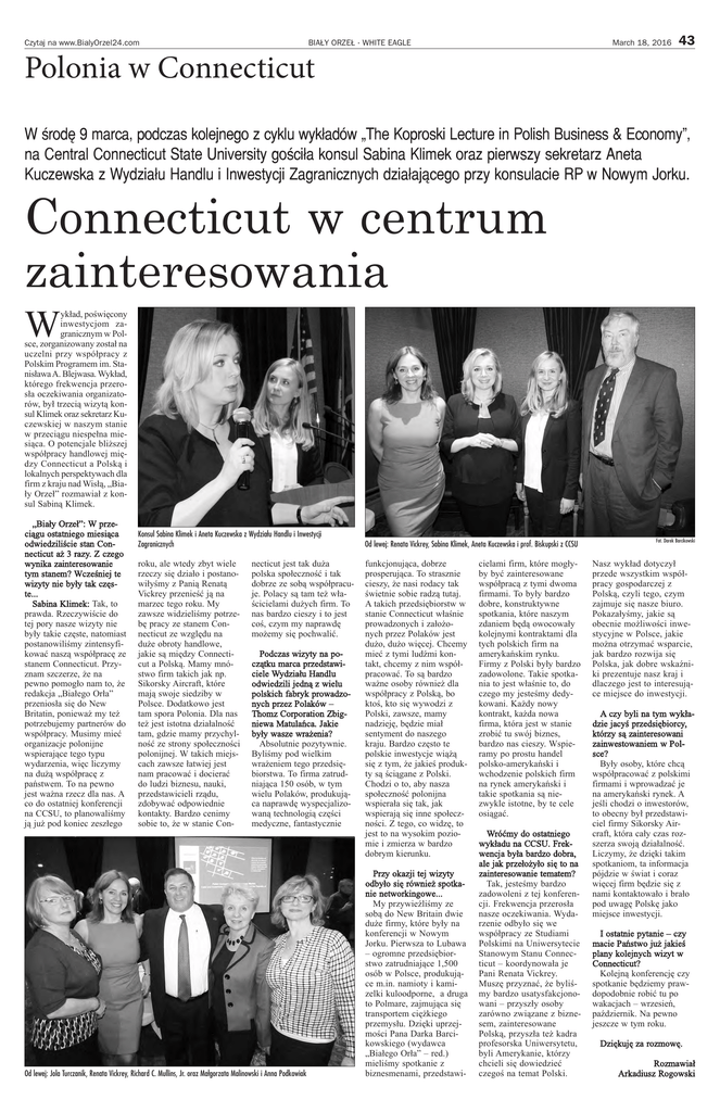 BIAŁY ORZEŁ . WHITE EAGLE Czytaj na www.BialyOrzel24.com March 18, 2016 43 Polonia w Connecticut w środę 9 marca, podczas kolejnego z cyklu wykładów „The koproski lecture in Polish Business & economy”, na central connecticut state University gościła konsul sabina klimek oraz pierwszy sekretarz aneta kuczewska z wydziału Handlu i inwestycji zagranicznych działającego przy konsulacie rP w Nowym Jorku. Connecticut w centrum zainteresowania W ykład, poświęcony inwestycjom zagranicznym w Polsce, zorganizowany został na uczelni przy współpracy z Polskim Programem im. Stanisława A. Blejwasa. Wykład, którego frekwencja przerosła oczekiwania organizatorów, był trzecią wizytą konsul Klimek oraz sekretarz Kuczewskiej w naszym stanie w przeciągu niespełna miesiąca. O potencjale bliższej współpracy handlowej między Connecticut a Polską i lokalnych perspektywach dla firm z kraju nad Wisłą, „Biały Orzeł” rozmawiał z konsul Sabiną Klimek. „Biały Orzeł”: W przeciągu ostatniego miesiąca odwiedziliście stan Connecticut aż 3 razy. Z czego wynika zainteresowanie tym stanem? Wcześniej te wizyty nie były tak częste... Sabina Klimek: Tak, to prawda. Rzeczywiście do tej pory nasze wizyty nie były takie częste, natomiast postanowiliśmy zintensyfikować naszą współpracę ze stanem Connecticut. Przyznam szczerze, że na pewno pomogło nam to, że redakcja „Białego Orła” przeniosła się do New Britatin, ponieważ my też potrzebujemy partnerów do współpracy. Musimy mieć organizacje polonijne wspierające tego typu wydarzenia, więc liczymy na dużą współpracę z państwem. To na pewno jest ważna rzecz dla nas. A co do ostatniej konferencji na CCSU, to planowaliśmy ją już pod koniec zeszłego Konsul Sabina Klimek i Aneta Kuczewska z Wydziału Handlu i Inwestycji Zagranicznych roku, ale wtedy zbyt wiele rzeczy się działo i postanowiłyśmy z Panią Renatą Vickrey przenieść ją na marzec tego roku. My zawsze widzieliśmy potrzebę pracy ze stanem Connecticut ze względu na duże obroty handlowe, jakie są między Connecticut a Polską. Mamy mnóstwo firm takich jak np. Sikorsky Aircraft, które mają swoje siedziby w Polsce. Dodatkowo jest tam spora Polonia. Dla nas też jest istotna działalność tam, gdzie mamy przychylność ze strony społeczności polonijnej. W takich miejscach zawsze łatwiej jest nam pracować i docierać do ludzi biznesu, nauki, przedstawicieli rządu, zdobywać odpowiednie kontakty. Bardzo cenimy sobie to, że w stanie Con- necticut jest tak duża polska społeczność i tak dobrze ze sobą współpracuje. Polacy są tam też właścicielami dużych firm. To nas bardzo cieszy i to jest coś, czym my naprawdę możemy się pochwalić. Podczas wizyty na początku marca przedstawiciele Wydziału Handlu odwiedzili jedną z wielu polskich fabryk prowadzonych przez Polaków – Thomz Corporation Zbigniewa Matulańca. Jakie były wasze wrażenia? Absolutnie pozytywnie. Byliśmy pod wielkim wrażeniem tego przedsiębiorstwa. To firma zatrudniająca 150 osób, w tym wielu Polaków, produkująca naprawdę wyspecjalizowaną technologią części medyczne, fantastycznie Od lewej: Jola Turczanik, Renata Vickrey, Richard C. Mullins, Jr. oraz Małgorzata Malinowski i Anna Podkowiak Od lewej: Renata Vickrey, Sabina Klimek, Aneta Kuczewska i prof. Biskupski z CCSU funkcjonująca, dobrze prosperująca. To strasznie cieszy, że nasi rodacy tak świetnie sobie radzą tutaj. A takich przedsiębiorstw w stanie Connecticut właśnie prowadzonych i założonych przez Polaków jest dużo, dużo więcej. Chcemy mieć z tymi ludźmi kontakt, chcemy z nim współpracować. To są bardzo ważne osoby również dla współpracy z Polską, bo ktoś, kto się wywodzi z Polski, zawsze, mamy nadzieję, będzie miał sentyment do naszego kraju. Bardzo często te polskie inwestycje wiążą się z tym, że jakieś produkty są ściągane z Polski. Chodzi o to, aby nasza społeczność polonijna wspierała się tak, jak wspierają się inne społeczności. Z tego, co widzę, to jest to na wysokim poziomie i zmierza w bardzo dobrym kierunku. Przy okazji tej wizyty odbyło się również spotkanie networkingowe... My przywieźliśmy ze sobą do New Britain dwie duże firmy, które były na konferencji w Nowym Jorku. Pierwsza to Lubawa – ogromne przedsiębiorstwo zatrudniające 1,500 osób w Polsce, produkujące m.in. namioty i kamizelki kuloodporne, a druga to Polmare, zajmująca się transportem ciężkiego przemysłu. Dzięki uprzejmości Pana Darka Barcikowskiego (wydawca „Białego Orła” – red.) mieliśmy spotkanie z biznesmenami, przedstawi- cielami firm, które mogłyby być zainteresowane współpracą z tymi dwoma firmami. To były bardzo dobre, konstruktywne spotkania, które naszym zdaniem będą owocowały kolejnymi kontraktami dla tych polskich firm na amerykańskim rynku. Firmy z Polski były bardzo zadowolone. Takie spotkania to jest właśnie to, do czego my jesteśmy dedykowani. Każdy nowy kontrakt, każda nowa firma, która jest w stanie zrobić tu swój biznes, bardzo nas cieszy. Wspieramy po prostu handel polsko-amerykański i wchodzenie polskich firm na rynek amerykański i takie spotkania są niezwykle istotne, by te cele osiągać. Wróćmy do ostatniego wykładu na CCSU. Frekwencja była bardzo dobra, ale jak przełożyło się to na zainteresowanie tematem? Tak, jesteśmy bardzo zadowoleni z tej konferencji. Frekwencja przerosła nasze oczekiwania. Wydarzenie odbyło się we współpracy ze Studiami Polskimi na Uniwersytecie Stanowym Stanu Connecticut – koordynowała je Pani Renata Vickrey. Muszę przyznać, że byliśmy bardzo usatysfakcjonowani – przyszły osoby zarówno związane z biznesem, zainteresowane Polską, przyszła też kadra profesorska Uniwersytetu, byli Amerykanie, którzy chcieli się dowiedzieć czegoś na temat Polski. Fot. Darek Barcikowski Nasz wykład dotyczył przede wszystkim wspó