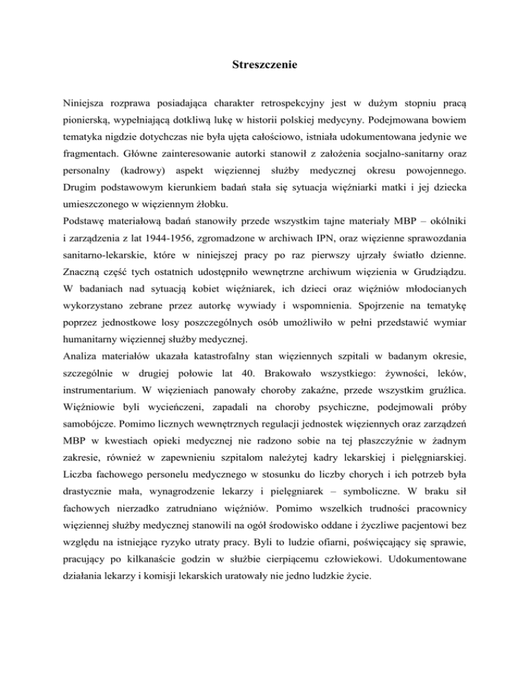 Streszczenie Niniejsza rozprawa posiadająca charakter retrospekcyjny jest w dużym stopniu pracą pionierską, wypełniającą dotkliwą lukę w historii polskiej medycyny. Podejmowana bowiem tematyka nigdzie dotychczas nie była ujęta całościowo, istniała udokumentowana jedynie we fragmentach. Główne zainteresowanie autorki stanowił z założenia socjalno-sanitarny oraz personalny (kadrowy) aspekt więziennej służby medycznej okresu powojennego. Drugim podstawowym kierunkiem badań stała się sytuacja więźniarki matki i jej dziecka umieszczonego w więziennym żłobku. Podstawę materiałową badań stanowiły przede wszystkim tajne materiały MBP ‒ okólniki i zarządzenia z lat 1944-1956, zgromadzone w archiwach IPN, oraz więzienne sprawozdania sanitarno-lekarskie, które w niniejszej pracy po raz pierwszy ujrzały światło dzienne. Znaczną część tych ostatnich udostępniło wewnętrzne archiwum więzienia w Grudziądzu. W badaniach nad sytuacją kobiet więźniarek, ich dzieci oraz więźniów młodocianych wykorzystano zebrane przez autorkę wywiady i wspomnienia. Spojrzenie na tematykę poprzez jednostkowe losy poszczególnych osób umożliwiło w pełni przedstawić wymiar humanitarny więziennej służby medycznej. Analiza materiałów ukazała katastrofalny stan więziennych szpitali w badanym okresie, szczególnie w drugiej połowie lat 40. Brakowało wszystkiego: żywności, leków, instrumentarium. W więzieniach panowały choroby zakaźne, przede wszystkim gruźlica. Więźniowie byli wycieńczeni, zapadali na choroby psychiczne, podejmowali próby samobójcze. Pomimo licznych wewnętrznych regulacji jednostek więziennych oraz zarządzeń MBP w kwestiach opieki medycznej nie radzono sobie na tej płaszczyźnie w żadnym zakresie, również w zapewnieniu szpitalom należytej kadry lekarskiej i pielęgniarskiej. Liczba fachowego personelu medycznego w stosunku do liczby chorych i ich potrzeb była drastycznie mała, wynagrodzenie lekarzy i pielęgniarek ‒ symboliczne. W braku sił fachowych nierzadko zatrudniano więźniów. Pomimo wszelkich trudności pracownicy więziennej służby medycznej stanowili na ogół środowisko oddane i życzliwe pacjentowi bez względu na istniejące ryzyko utraty pracy. Byli to ludzie ofiarni, poświęcający się sprawie, pracujący po kilkanaście godzin w służbie cierpiącemu człowiekowi. Udokumentowane działania lekarzy i komisji lekarskich uratowały nie jedno ludzkie życie. Summary This retrospective thesis is to a high degree a pioneering work, filling a gap in the history of Polish medicine. The subject has never been described in full, any documentation only existed in fragments. The main interest of the author has been by definition the social-sanitary and personal aspect of the prison medical service of the post-war period. The other main direction of research has been the situation of the prisoner mother and her child in the prison nursery. The material basis of the research has been the classified material of the Ministry of Public Security – circulars and bylaws from the 1944-1956 period – gathered in the archives of the Institute of National Remembrance, as well as sanitary and medical prison reports that have been analysed for the first time in this work. Most of the latter have been obtained from the internal archive of the prison in Grudziądz. In the study of the situation of women prisoners, their children and underage prisoners the author has used interviews and memories that she collected herself. The perspective of individual witnesses has made it possible to fully present the human dimension of the prison medical service. The data analysis has shown the disastrous state of the prison hospitals over the investigated time period, especially in the second half of the 1940s. There was a shortage of everything: food, medicine, instruments. Prisons were infected with contagious diseases, mainly tuberculosis. Prisoners were exhausted, suffered from mental illnesses, some tried to commit suicide. In spite of a number of internal regulations and Ministry bylaws concerning medical service the problems could not be coped with in any aspect, including human resources. The number of professional doctors and nurses in relation to the number of prisoners and their needs was disastrously small, their wages – absurdly low. Due to the lack of professionals, prisoners were often employed. Despite all the difficulties the prison medical personnel was devoted and benevolent, assisting the patients regardless of the risk of losing their job. The doctors and nurses were devoted to their case, working long hours in the service of suffering men and women. The documented actions of doctors and medical comissions saved many a human life.