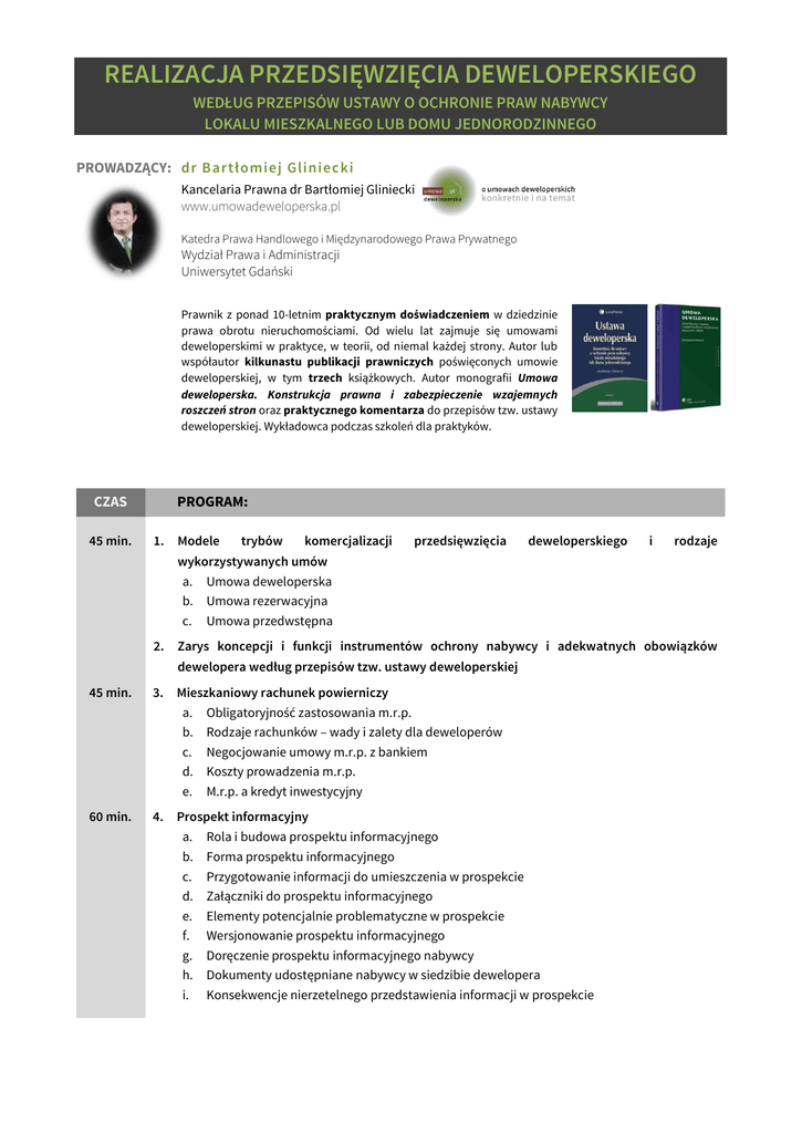 REALIZACJA PRZEDSIĘWZIĘCIA DEWELOPERSKIEGO WEDŁUG PRZEPISÓW USTAWY O OCHRONIE PRAW NABYWCY LOKALU MIESZKALNEGO LUB DOMU JEDNORODZINNEGO PROWADZĄCY: dr Bartłomiej Gliniec ki Kancelaria Prawna dr Bartłomiej Gliniecki www.umowadeweloperska.pl Katedra Prawa Handlowego i Międzynarodowego Prawa Prywatnego Wydział Prawa i Administracji Uniwersytet Gdański Prawnik z ponad 10-letnim praktycznym doświadczeniem w dziedzinie prawa obrotu nieruchomościami. Od wielu lat zajmuje się umowami deweloperskimi w praktyce, w teorii, od niemal każdej strony. Autor lub współautor kilkunastu publikacji prawniczych poświęconych umowie deweloperskiej, w tym trzech książkowych. Autor monografii Umowa deweloperska. Konstrukcja prawna i zabezpieczenie wzajemnych roszczeń stron oraz praktycznego komentarza do przepisów tzw. ustawy deweloperskiej. Wykładowca podczas szkoleń dla praktyków. CZAS 45 min. PROGRAM: 1. Modele trybów komercjalizacji przedsięwzięcia deweloperskiego i rodzaje wykorzystywanych umów a. Umowa deweloperska b. Umowa rezerwacyjna c. Umowa przedwstępna 2. Zarys koncepcji i funkcji instrumentów ochrony nabywcy i adekwatnych obowiązków dewelopera według przepisów tzw. ustawy deweloperskiej 45 min. 3. Mieszkaniowy rachunek powierniczy a. Obligatoryjność zastosowania m.r.p. b. Rodzaje rachunków – wady i zalety dla deweloperów c. Negocjowanie umowy m.r.p. z bankiem d. Koszty prowadzenia m.r.p. e. M.r.p. a kredyt inwestycyjny 60 min. 4. Prospekt informacyjny a. Rola i budowa prospektu informacyjnego b. Forma prospektu informacyjnego c. Przygotowanie informacji do umieszczenia w prospekcie d. Załączniki do prospektu informacyjnego e. Elementy potencjalnie problematyczne w prospekcie f. Wersjonowanie prospektu informacyjnego g. Doręczenie prospektu informacyjnego nabywcy h. Dokumenty udostępniane nabywcy w siedzibie dewelopera i. Konsekwencje nierzetelnego przedstawienia informacji w prospekcie 60 min. 5. Kształtowanie treści i zawarcie umowy deweloperskiej a. Główne obszary ryzyka dewelopera w związku z zawarciem umowy deweloperskiej b. Forma umowy, wniosek wieczystoksięgowy i podział kosztów zawarcia umowy c. Podstawowe i dodatkowe elementy treści d. Powierzchnia przedmiotu umowy e. Dopuszczalność zmiany ceny f. Kary umowne g. Typowe niedozwolone postanowienia umowne 45 min. 6. Odstąpienie od umowy deweloperskiej a. Możliwości odstąpienia od umowy przez nabywcę – ustawowe i dodatkowe b. Możliwości odstąpienia od umowy przez dewelopera c. Skutki odstąpienia od umowy d. Bank i m.r.p. w przypadku odstąpienia od umowy e. Wykreślenie roszczenia z księgi wieczystej 45 min. 7. Odbiór nieruchomości a. Znaczenie odbioru b. Procedura odbioru według przepisów tzw. ustawy deweloperskiej c. Określenie terminu odbioru i konsekwencje jego niedochowania 8. Odpowiedzialność dewelopera za wady nieruchomości a. Odpowiedzialność z tytułu rękojmi i z tytułu gwarancji b. Zasady odpowiedzialności z tytułu rękojmi c. Okres odpowiedzialności dewelopera 9. Współpraca z prawnikiem obsługującym realizację inwestycji i notariuszem ŁĄCZNIE 5 godzin (300 min.)