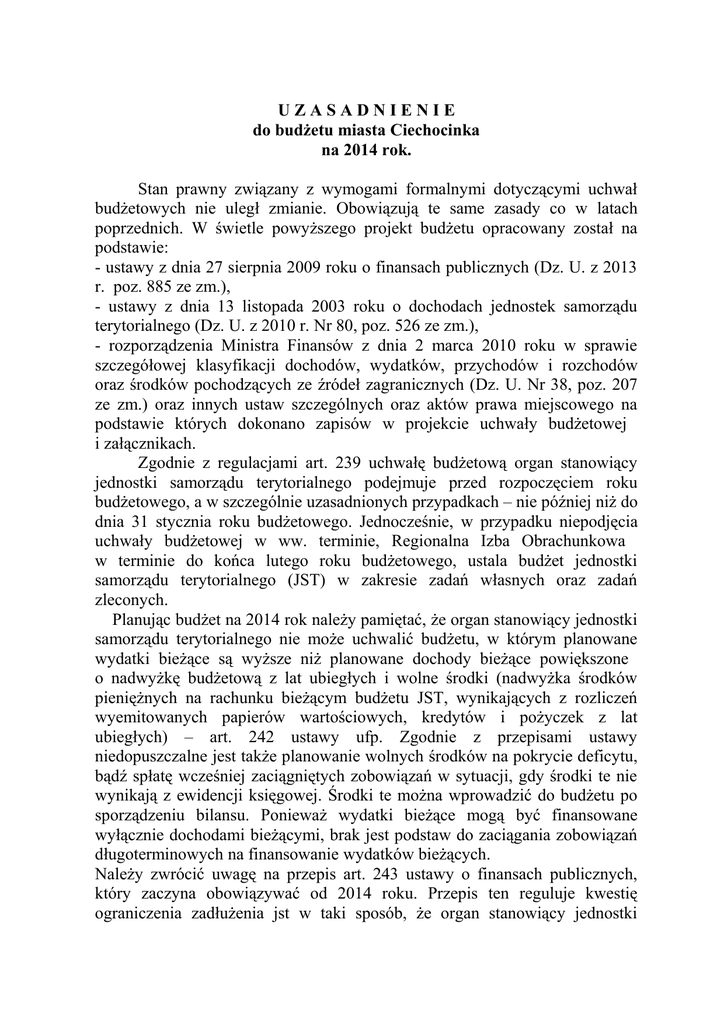 UZASADNIENIE do budżetu miasta Ciechocinka na 2014 rok. Stan prawny związany z wymogami formalnymi dotyczącymi uchwał budżetowych nie uległ zmianie. Obowiązują te same zasady co w latach poprzednich. W świetle powyższego projekt budżetu opracowany został na podstawie: - ustawy z dnia 27 sierpnia 2009 roku o finansach publicznych (Dz. U. z 2013 r. poz. 885 ze zm.), - ustawy z dnia 13 listopada 2003 roku o dochodach jednostek samorządu terytorialnego (Dz. U. z 2010 r. Nr 80, poz. 526 ze zm.), - rozporządzenia Ministra Finansów z dnia 2 marca 2010 roku w sprawie szczegółowej klasyfikacji dochodów, wydatków, przychodów i rozchodów oraz środków pochodzących ze źródeł zagranicznych (Dz. U. Nr 38, poz. 207 ze zm.) oraz innych ustaw szczególnych oraz aktów prawa miejscowego na podstawie których dokonano zapisów w projekcie uchwały budżetowej i załącznikach. Zgodnie z regulacjami art. 239 uchwałę budżetową organ stanowiący jednostki samorządu terytorialnego podejmuje przed rozpoczęciem roku budżetowego, a w szczególnie uzasadnionych przypadkach – nie później niż do dnia 31 stycznia roku budżetowego. Jednocześnie, w przypadku niepodjęcia uchwały budżetowej w ww. terminie, Regionalna Izba Obrachunkowa w terminie do końca lutego roku budżetowego, ustala budżet jednostki samorządu terytorialnego (JST) w zakresie zadań własnych oraz zadań zleconych. Planując budżet na 2014 rok należy pamiętać, że organ stanowiący jednostki samorządu terytorialnego nie może uchwalić budżetu, w którym planowane wydatki bieżące są wyższe niż planowane dochody bieżące powiększone o nadwyżkę budżetową z lat ubiegłych i wolne środki (nadwyżka środków pieniężnych na rachunku bieżącym budżetu JST, wynikających z rozliczeń wyemitowanych papierów wartościowych, kredytów i pożyczek z lat ubiegłych) – art. 242 ustawy ufp. Zgodnie z przepisami ustawy niedopuszczalne jest także planowanie wolnych środków na pokrycie deficytu, bądź spłatę wcześniej zaciągniętych zobowiązań w sytuacji, gdy środki te nie wynikają z ewidencji księgowej. Środki te można wprowadzić do budżetu po sporządzeniu bilansu. Ponieważ wydatki bieżące mogą być finansowane wyłącznie dochodami bieżącymi, brak jest podstaw do zaciągania zobowiązań długoterminowych na finansowanie wydatków bieżących. Należy zwrócić uwagę na przepis art. 243 ustawy o finansach publicznych, który zaczyna obowiązywać od 2014 roku. Przepis ten reguluje kwestię ograniczenia zadłużenia jst w taki sposób, że organ stanowiący jednostki 2 samorządu terytorialnego nie może uchwalić budżetu, którego realizacja spowoduje, że w roku budżetowym oraz w każdym roku następującym po roku budżetowym relacja łącznej kwoty przypadających w danym roku budżetowym spłat rat kredytów i pożyczek, wykupów papierów wartościowych czy potencjalnych spłat kwot wynikających z udzielonych poręczeń oraz gwarancji do planowanych dochodów ogółem budżetu przekroczy średnią arytmetyczną z obliczonych dla ostatnich trzech lat relacji jej dochodów bieżących powiększonych o dochody ze sprzedaży majątku oraz pomniejszonych o wydatki bieżące, do dochodów ogółem. Do obliczania tych relacji wprowadzony został algorytm, który obrazuje relacje, o których mowa powyżej. Przy konstruowaniu projektu należy zwracać także uwagę na konieczność realnego planowania zarówno dochodów, jak i wydatków budżetowych, szczególnie dochodów ze sprzedaży majątku i wydatków majątkowych. Planowanie dochodów ze sprzedaży majątku powinno odbywać się z uwzględnieniem istniejących na rynku możliwości zbycia zarówno budynków, jak i gruntów. Planowane dochody budżetowe z tego tytułu nie mogą stanowić środków dla zrównoważenia budżetu lub osiągnięcia korzystniejszego wskaźnika zadłużenia. Należy je traktować jako znaczące źródło finansowania wydatków majątkowych. Zasada ostrożnego planowania dotyczy także środków pochodzących z UE, które należy ujmować w budżecie tylko w przypadku możliwości ich pozyskania. Bezpieczne planowanie dotyczy również wydatków majątkowych, ponieważ ich wartość w sposób istotny oddziałuje na wysokość planowanego deficytu, a w ślad za tym na źródła jego finansowania, co w konsekwencji rzutuje na wysokość zadłużenia samorządu. Dla przypomnienia zamian w ustawie o finansach publicznych informuję, że: - w uchwale budżetowej nie zamieszcza się upoważnienia dotyczącego zaciągania zobowiązań na finansowanie wieloletnich programów inwestycyjnych oraz zobowiązań z tytułu umów, których realizacja w roku następnym jest niezbędna dla zapewnienia ciągłości działania jednostki i termin zapłaty upływa w roku następnym. Upoważnienia dotyczące powyższego zakresu mogą być zawarte w uchwale w sprawie Wieloletniej Prognozy Finansowej (WPF) – art. 228 ufp; - do projektów uchwał budżetowych nie dołącza się prognozy długu, która jest częścią WPF – art. 227 ust. 2 ufp; - do projektów uchwał budżetowych nie dołącza się również informacji o stanie mienia komunalnego, która jest przedstawiana wraz ze sprawozdaniem rocznym z wykonania budżetu – art. 267 ust. 1 pkt. 3 ufp; - do projektu budżetu powinno być dołączone uzasadnienie oraz materiały, które organ stanowiący wskazał w uchwale dotyczącej procedury uchwalania budżetu – art. 238 ust. 2 ufp.; 3 - nowa ustawa o finansach publicznych dopuszcza upoważnienie dla organu wykonawczego do dokonywania zmian w planie wydatków majątkowych, co należało do wyłącznej kompetencji organu stanowiącego. Na podstawie art. 233 ustawy z dnia 27 sierpnia 2009 r. o finansach publicznych (Dz.U. z 2013 r. poz. 885 ze zm.) inicjatywa w sprawie sporządzenia projektu uchwały budżetowej przysługuje wyłącznie zarządowi jednostki samorządu terytorialnego (wójtowi, burmistrzowi, 
