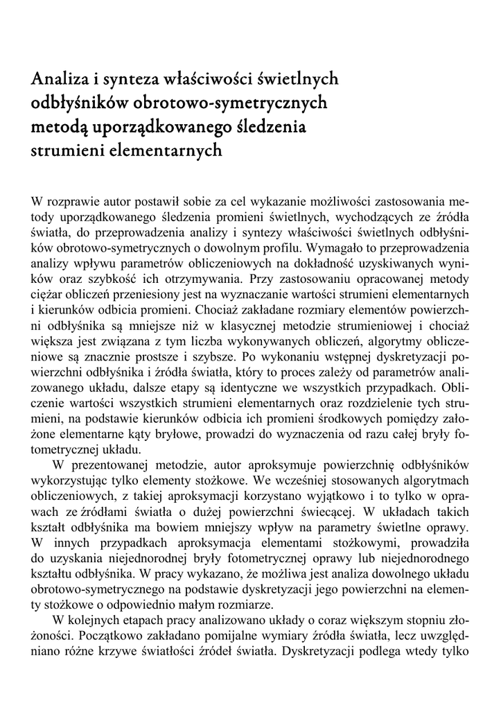 Analiza i synteza właściwości świetlnych odbłyśników obrotowoobrotowo-symetrycznych metodą uporządkowanego śledzenia strumieni elementarnych W rozprawie autor postawił sobie za cel wykazanie możliwości zastosowania metody uporządkowanego śledzenia promieni świetlnych, wychodzących ze źródła światła, do przeprowadzenia analizy i syntezy właściwości świetlnych odbłyśników obrotowo-symetrycznych o dowolnym profilu. Wymagało to przeprowadzenia analizy wpływu parametrów obliczeniowych na dokładność uzyskiwanych wyników oraz szybkość ich otrzymywania. Przy zastosowaniu opracowanej metody ciężar obliczeń przeniesiony jest na wyznaczanie wartości strumieni elementarnych i kierunków odbicia promieni. Chociaż zakładane rozmiary elementów powierzchni odbłyśnika są mniejsze niż w klasycznej metodzie strumieniowej i chociaż większa jest związana z tym liczba wykonywanych obliczeń, algorytmy obliczeniowe są znacznie prostsze i szybsze. Po wykonaniu wstępnej dyskretyzacji powierzchni odbłyśnika i źródła światła, który to proces zależy od parametrów analizowanego układu, dalsze etapy są identyczne we wszystkich przypadkach. Obliczenie wartości wszystkich strumieni elementarnych oraz rozdzielenie tych strumieni, na podstawie kierunków odbicia ich promieni środkowych pomiędzy założone elementarne kąty bryłowe, prowadzi do wyznaczenia od razu całej bryły fotometrycznej układu. W prezentowanej metodzie, autor aproksymuje powierzchnię odbłyśników wykorzystując tylko elementy stożkowe. We wcześniej stosowanych algorytmach obliczeniowych, z takiej aproksymacji korzystano wyjątkowo i to tylko w oprawach ze źródłami światła o dużej powierzchni świecącej. W układach takich kształt odbłyśnika ma bowiem mniejszy wpływ na parametry świetlne oprawy. W innych przypadkach aproksymacja elementami stożkowymi, prowadziła do uzyskania niejednorodnej bryły fotometrycznej oprawy lub niejednorodnego kształtu odbłyśnika. W pracy wykazano, że możliwa jest analiza dowolnego układu obrotowo-symetrycznego na podstawie dyskretyzacji jego powierzchni na elementy stożkowe o odpowiednio małym rozmiarze. W kolejnych etapach pracy analizowano układy o coraz większym stopniu złożoności. Początkowo zakładano pomijalne wymiary źródła światła, lecz uwzględniano różne krzywe światłości źródeł światła. Dyskretyzacji podlega wtedy tylko powierzchnia odbłyśnika, gdyż promienie, z którymi związane są elementarne strumienie świetlne, wysyłane są z jednego punktu. Następnie przeanalizowano układy z odbłyśnikami o powierzchni o odbiciu kierunkowo-rozproszonym z rozpraszaniem w ograniczonym kącie. W końcowym etapie uwzględniono w obliczeniach rzeczywiste wymiary źródeł światła: kołowych, walcowych i kulistych. W wyniku badań stwierdzono również, że obliczenia układów bardziej złożonych można, w określonych przypadkach, zastępować trwającymi krócej obliczeniami układów prostszych. Odbłyśniki o odbiciu kierunkowo-rozproszonym i małym kącie rozpraszania mogą być rozpatrywane jako zwierciadlane. Rzeczywiste źródło światła może natomiast być zastąpione punktowym, gdy jego wymiary są odpowiednio małe w porównaniu z wymiarami odbłyśnika. Wnioski z przeprowadzonych analiz wykorzystano podczas syntezy kształtów obrotowo-symetrycznych odbłyśników, realizujących krzywą światłości zapewniającą normatywną równomierność oświetlenia. Proponowana syntetyczna metoda wyznaczania kształtu odbłyśnika, w najogólniejszym zarysie, polega na porównywaniu strumienia świetlnego wysyłanego przez poszczególne elementy stożkowe odbłyśnika ze strumieniem świetlnym wymaganym do zrealizowania założonego celu oświetleniowego. Praktyczna część pracy dotyczyła metodologii projektowania opraw oświetlenia ogólnego z diodami świecącymi LED o dużej mocy, które to zagadnienie pozostaje obecnie w centrum zainteresowania konstruktorów. Zaprojektowana oprawa o odbłyśniku zwierciadlanym spełniała wszystkie wymagania normatywne. Praktycznie postanowiono jednak wykonać odbłyśniki z powierzchnią o odbiciu kierunkowo-rozproszonym. Wymagania normatywne dotyczące ograniczenia luminancji mówią bowiem o średniej wartości luminancji oprawy. Obawiano się zatem, że miejscowe odbicia zwierciadlane mogą powodować olśnienie obserwatorów. Wykonano modele odbłyśników o odbiciu kierunkowo-rozproszonym, o trzech różnych stopniach rozproszenia. Wyniki pomiarowe układów modelowych potwierdziły zarówno wystarczającą dokładność analiz prowadzonych z wykorzystaniem metody uporządkowanego śledzenia promieni, jak i przydatność prezentowanej metody w praktyce projektowej. Analysis and synthesis of lighting properties of rotationallyrotationally-symmetric reflectors using the method of ordered tracing of elementary luminous fluxes The main goal of this thesis was to prove the potential application of the method of ordered tracing of elementary luminous fluxes, originating from a light source, for conducting analysis and synthesis of lighting properties of rotationallysymmetric reflectors with arbitrary profiles. This process required conducting a series of analysis on the influence of numeric parameters on the precision of obtained results and their computation speed. In the elaborated method, the main weight of necessary calculations is related with determination of values of individual elementary luminous fluxed and reflection directions for individual rays. Despite the smaller assumed dimensions of the reflector surface (when compared with the classical method) and an increased number of calculations resulting from this fact, the calculation algorithms turned out to be much simpler and quicker. Once the initial digitization (the process which depends on the parameters of the examined system) of the reflector surface and the light source is done, the