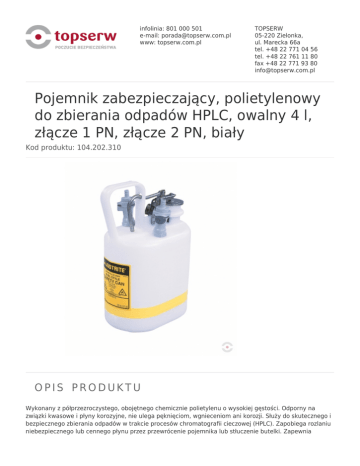 infolinia: 801 000 501 e-mail: [email protected] www: topserw.com.pl TOPSERW 05-220 Zielonka, ul. Marecka 66a tel. +48 22 771 04 56 tel. +48 22 761 11 80 fax +48 22 771 93 80 [email protected] Pojemnik zabezpieczający, polietylenowy do zbierania odpadów HPLC, owalny 4 l, złącze 1 PN, złącze 2 PN, biały Kod produktu: 104.202.310 OPIS PRODUKTU Wykonany z półprzezroczystego, obojętnego chemicznie polietylenu o wysokiej gęstości. Odporny na związki kwasowe i płyny korozyjne, nie ulega pęknięciom, wgnieceniom ani korozji. Służy do skutecznego i bezpiecznego zbierania odpadów w trakcie procesów chromatografii cieczowej (HPLC). Zapobiega rozlaniu niebezpiecznego lub cennego płynu przez przewrócenie pojemnika lub stłuczenie butelki. Zapewnia mniejsze ryzyko wyciekania płynów przy odłączaniu od instalacji w celu odstawienia płynu do utylizacji. Chroni laboratorium i personel przed wpływem niebezpiecznych par i odpadów. Specjalne złącza z zaworami odcinającymi ułatwiają odłączenie pojemnika od systemu bez konieczności odłączania całych przewodów prowadzących do urządzenia. Podłączanie i odłączanie odbywa się przy zamkniętym zaworze, dzięki czemu nie ma ryzyka uwolnienia par lub rozlania rozpuszczalnika. Odłączenie przewodu jest proste i bezpieczne, a pojemnik w trakcie transportu do miejsca odbierania odpadów jest całkowicie szczelny. Przezroczysty pojemnik pozwala na szybkie sprawdzenie poziomu płynu. Otwór wlewowy wyposażony w odcinacz płomienia ze stali nierdzewnej, który w niezawodny sposób odprowadza ciepło i zapobiega zapłonowi zawartości pojemnika. Posiada mechanizm automatycznego wypuszczania nadmiaru par przy nadciśnieniu od 0,2 do 0,35 bara. Kontrolę nieprzyjemnych zapachów zapewnia filtr koalescencyjnowęglowy, wychwytujący 99% cząstek par cieczy. Filtr podłączany jest bezpośrednio do złącza uwalniania par. Oprzyrządowanie z polipropylenu PN (szybkozłączki) z uszczelkami EPDM, gwarantuje dobrą odporność chemiczną. Owalny kształt pojemnik ułatwia lepsze wykorzystanie powierzchni magazynowej. Spełnia wymagania przepisów OSHA, NFPA, EPA. Posiada certyfikat FM Global. Pojemność 4 l, wymiary wymiary S*D*W 117 x 194 x 324 mm, złącze 1 do odbioru płynu polipropylen, uszczelka EPDM, złącze 2 do spustu par polipropylen, uszczelka EPDM, kolor biały. DANE TECHNICZNE Pojemność 4l Przeznaczenie HPLC Kolor Biały Materiał Polietylen Kolor Biały AKCESORIA Zaciski mocujące HPLC do twardych wężyków (1/16") z tulejkami (6) 104.206.823 Rozgałęziacz polipropylenowy HPLC, złącze buforowe SN 104.206.815 Rozgałęziacz polipropylenowy HPLC z szybkozłączem PN 104.206.814 Rozgałęziacz polipropylenowy HPLC z szybkozłączem SN 104.206.813