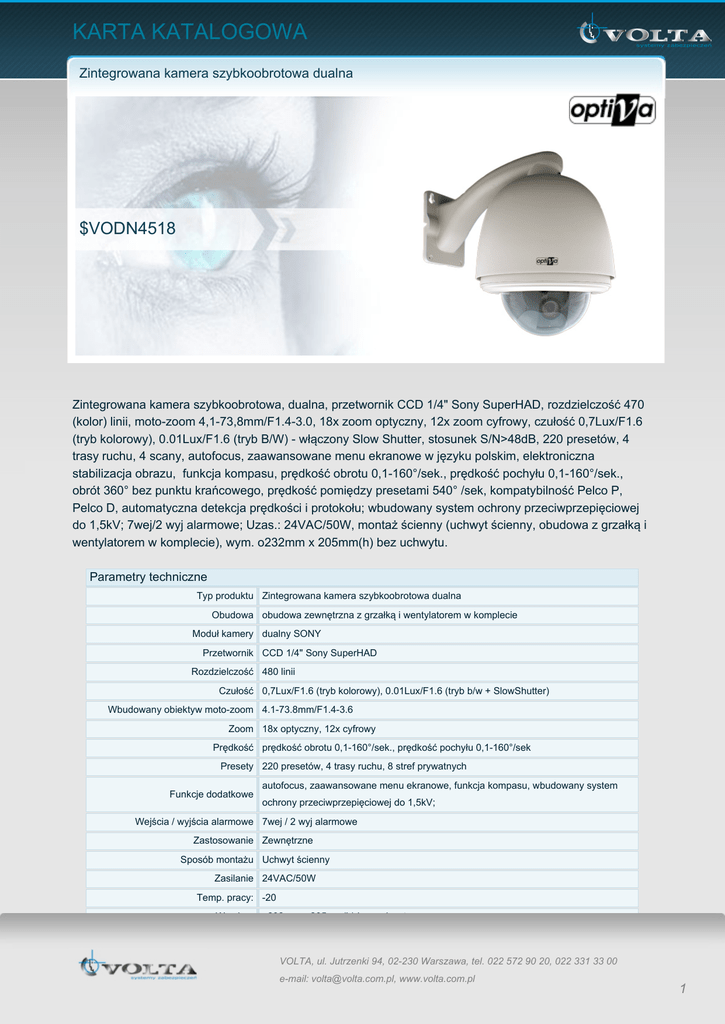 KARTA KATALOGOWA Zintegrowana kamera szybkoobrotowa dualna $VODN4518 Zintegrowana kamera szybkoobrotowa, dualna, przetwornik CCD 1/4" Sony SuperHAD, rozdzielczość 470 (kolor) linii, moto-zoom 4,1-73,8mm/F1.4-3.0, 18x zoom optyczny, 12x zoom cyfrowy, czułość 0,7Lux/F1.6 (tryb kolorowy), 0.01Lux/F1.6 (tryb B/W) - włączony Slow Shutter, stosunek S/N>48dB, 220 presetów, 4 trasy ruchu, 4 scany, autofocus, zaawansowane menu ekranowe w języku polskim, elektroniczna stabilizacja obrazu, funkcja kompasu, prędkość obrotu 0,1-160°/sek., prędkość pochyłu 0,1-160°/sek., obrót 360° bez punktu krańcowego, prędkość pomiędzy presetami 540° /sek, kompatybilność Pelco P, Pelco D, automatyczna detekcja prędkości i protokołu; wbudowany system ochrony przeciwprzepięciowej do 1,5kV; 7wej/2 wyj alarmowe; Uzas.: 24VAC/50W, montaż ścienny (uchwyt ścienny, obudowa z grzałką i wentylatorem w komplecie), wym. o232mm x 205mm(h) bez uchwytu. Parametry techniczne Typ produktu Zintegrowana kamera szybkoobrotowa dualna Obudowa obudowa zewnętrzna z grzałką i wentylatorem w komplecie Moduł kamery dualny SONY Przetwornik CCD 1/4" Sony SuperHAD Rozdzielczość 480 linii Czułość 0,7Lux/F1.6 (tryb kolorowy), 0.01Lux/F1.6 (tryb b/w + SlowShutter) Wbudowany obiektyw moto-zoom 4.1-73.8mm/F1.4-3.6 Zoom 18x optyczny, 12x cyfrowy Prędkość prędkość obrotu 0,1-160°/sek., prędkość pochyłu 0,1-160°/sek Presety 220 presetów, 4 trasy ruchu, 8 stref prywatnych Funkcje dodatkowe autofocus, zaawansowane menu ekranowe, funkcja kompasu, wbudowany system ochrony przeciwprzepięciowej do 1,5kV; Wejścia / wyjścia alarmowe 7wej / 2 wyj alarmowe Zastosowanie Zewnętrzne Sposób montażu Uchwyt ścienny Zasilanie 24VAC/50W Temp. pracy: -20 Wymiary o232mm x 205mm(h) bez uchwytu VOLTA, ul. Jutrzenki 94, 02-230 Warszawa, tel. 022 572 90 20, 022 331 33 00 e-mail: [email protected], www.volta.com.pl 1