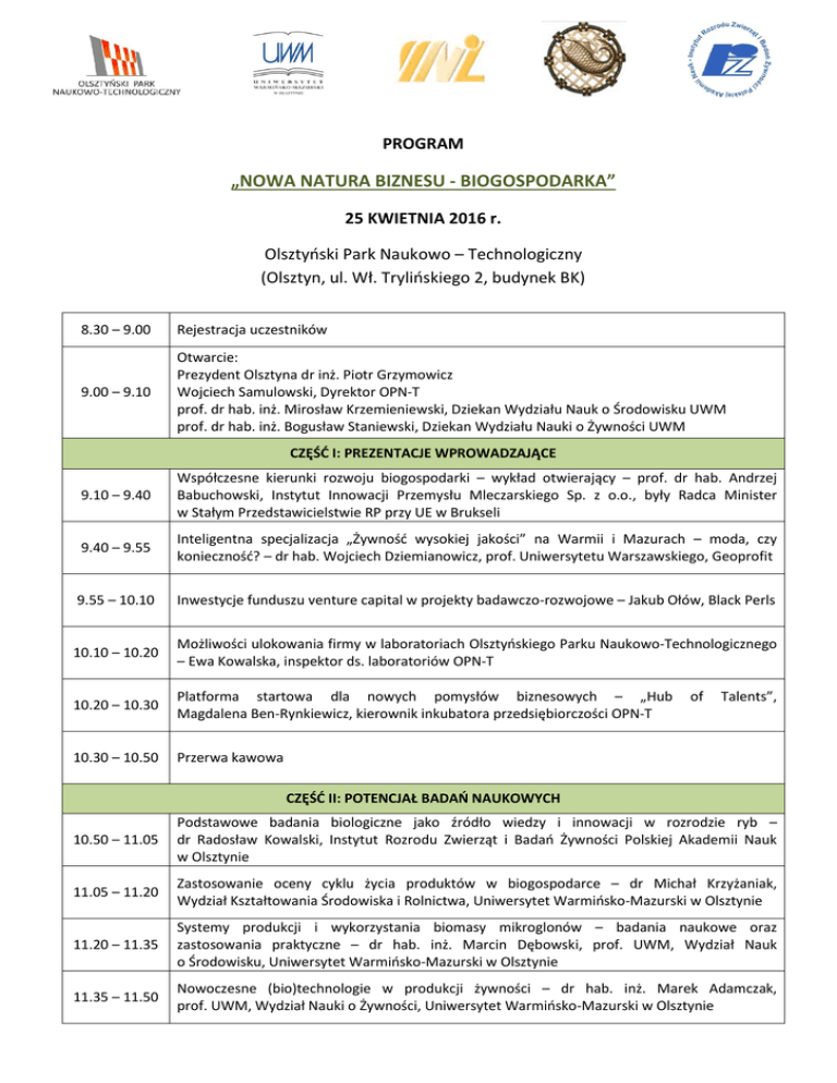 PROGRAM „NOWA NATURA BIZNESU - BIOGOSPODARKA” 25 KWIETNIA 2016 r. Olsztyński Park Naukowo – Technologiczny (Olsztyn, ul. Wł. Trylińskiego 2, budynek BK) 8.30 – 9.00 Rejestracja uczestników 9.00 – 9.10 Otwarcie: Prezydent Olsztyna dr inż. Piotr Grzymowicz Wojciech Samulowski, Dyrektor OPN-T prof. dr hab. inż. Mirosław Krzemieniewski, Dziekan Wydziału Nauk o Środowisku UWM prof. dr hab. inż. Bogusław Staniewski, Dziekan Wydziału Nauki o Żywności UWM CZĘŚĆ I: PREZENTACJE WPROWADZAJĄCE 9.10 – 9.40 Współczesne kierunki rozwoju biogospodarki – wykład otwierający – prof. dr hab. Andrzej Babuchowski, Instytut Innowacji Przemysłu Mleczarskiego Sp. z o.o., były Radca Minister w Stałym Przedstawicielstwie RP przy UE w Brukseli 9.40 – 9.55 Inteligentna specjalizacja „Żywność wysokiej jakości” na Warmii i Mazurach – moda, czy konieczność? – dr hab. Wojciech Dziemianowicz, prof. Uniwersytetu Warszawskiego, Geoprofit 9.55 – 10.10 Inwestycje funduszu venture capital w projekty badawczo-rozwojowe – Jakub Ołów, Black Perls 10.10 – 10.20 Możliwości ulokowania firmy w laboratoriach Olsztyńskiego Parku Naukowo-Technologicznego – Ewa Kowalska, inspektor ds. laboratoriów OPN-T 10.20 – 10.30 Platforma startowa dla nowych pomysłów biznesowych – „Hub Magdalena Ben-Rynkiewicz, kierownik inkubatora przedsiębiorczości OPN-T 10.30 – 10.50 Przerwa kawowa of Talents”, CZĘŚĆ II: POTENCJAŁ BADAŃ NAUKOWYCH 10.50 – 11.05 Podstawowe badania biologiczne jako źródło wiedzy i innowacji w rozrodzie ryb – dr Radosław Kowalski, Instytut Rozrodu Zwierząt i Badań Żywności Polskiej Akademii Nauk w Olsztynie 11.05 – 11.20 Zastosowanie oceny cyklu życia produktów w biogospodarce – dr Michał Krzyżaniak, Wydział Kształtowania Środowiska i Rolnictwa, Uniwersytet Warmińsko-Mazurski w Olsztynie 11.20 – 11.35 Systemy produkcji i wykorzystania biomasy mikroglonów – badania naukowe oraz zastosowania praktyczne – dr hab. inż. Marcin Dębowski, prof. UWM, Wydział Nauk o Środowisku, Uniwersytet Warmińsko-Mazurski w Olsztynie 11.35 – 11.50 Nowoczesne (bio)technologie w produkcji żywności – dr hab. inż. Marek Adamczak, prof. UWM, Wydział Nauki o Żywności, Uniwersytet Warmińsko-Mazurski w Olsztynie CZĘŚĆ III: DOŚWIADCZENI PRZEDSIĘBIORCY 11.50 – 12.10 Spółdzielnia Mleczarska „Mlekpol” w Grajewie – Edmund Borawski, Prezes Zarządu 12.10 – 12.30 Tewes Bis Sp. z o.o. – Janusz Skowroński, Prezes Zarządu 12.30 – 12.50 Zakład Wodociągów i Kanalizacji Sp. z o.o. w Mikołajkach – dr inż. Jarosław Pesta, Prezes Zarządu CZĘŚĆ IV: MŁODZI PRZEDSIĘBIORCY OPN-T 12.50 – 13.00 Kimika Laboratories Sp. z o.o. – Paweł Matyszkiel, Prezes Zarządu 13.00 – 13.10 MK Natural Cosmetics – Marzena Kaszubska, Właściciel 13.20 – 13.30 Exon Centrum Diagnostyki Molekularnej – dr Alicja Stachura, Właściciel 13.30 – 14.00 Poczęstunek