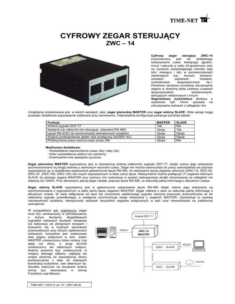 CYFROWY ZEGAR STERUJĄCY ZWC – 14 Cyfrowy zegar sterujący ZWC-14 przeznaczony jest do dokładnego wskazywania czasu bieżącego (godzin, minut i sekund) w cyklu 24-godzinnym oraz na życzenie zamawiającego również daty (dni, miesięcy i lat), w pomieszczeniach zamkniętych (np.: biurach, bankach, szkołach, szpitalach, hotelach, rozdzielniach, dyspozytorniach itp.). Panelowa obudowa umożliwia wbudowanie zegara w dowolną płytę czołową urządzeń dyspozytorskich, szkoleniowych, sterujących reklamowych i innych. Segmentowy wyświetlacz diodowy o wysokości cyfr 14mm pozwala na odczytywanie wskazań z odległości 4m. Urządzenie produkowane jest w dwóch wersjach, jako: zegar pierwotny MASTER oraz zegar wtórny SLAVE. Obie wersje mogą posiadać dodatkowe wyposażenie wybierane przy zamówieniu. Odpowiednie konfiguracje pokazuje poniższa tabela: Funkcja Antena sygnału DCF-77 Nadajnik lub odbiornik linii sterującej (standard RS-485) Łącze RS-232C do synchronizacji zewnętrznych urządzeń Wyjście przekaźnikowe (jeden styk przełączny 2A/250V AC) Podtrzymanie pracy wzorca czasu przez 24h MASTER Tak Opcja Opcja Opcja Opcja SLAVE Nie Tak Opcja Opcja Nie Możliwości dodatkowe: - Wyświetlanie naprzemienne czasu (8s) i daty (2s) - Kolor wyświetlacza zielony lub czerwony - Ewentualnie inne specjalne życzenia Zegar pierwotny MASTER wyposażony jest w zewnętrzną antenę (odbiornik) sygnału DCF-77, dzięki czemu jego wskazania synchronizowane są drogą radiową z atomowym wzorcem czasu. Zegar ten można wykorzystać do pracy samodzielnej lub poprzez wyposażenie go w dodatkowe separowane galwanicznie łącze RS-485, do sterowania siecią zegarów wtórnych (ZWC-14, ZWC-45, ZWC-57, ZWC-100, ZWC-125) lub innych wyposażonych w takie samo łącze. Maksymalnie można podłączyć 31 zegarów wtórnych SLAVE do jednego zegara MASTER przy pomocy linii wykonanej w postaci jednoparowej skrętki ekranowanej na odległość nie większą niż 1200m. Przy sterowaniu siecią zegar nadaje, poprzez łącze RS-485, co sekundę pełną informację o aktualnym czasie. Zegar wtórny SLAVE wyposażony jest w galwanicznie separowane łącze RS-485 dzięki czemu jego wskazania są synchronizowane z wyposażonym w takie samo łącze zegarem MASTER. Zegar odbiera z sieci co sekundę pełną informację o aktualnym czasie. W razie odłączenia od sieci lub otrzymania zakłóconego sygnału zaczyna pracować autonomicznie aż do odebrania sygnału prawidłowego, a następnie synchronizuje swoje wskazania z zegarem MASTER. Gwarantuje to wysoką niezawodność działania, identyczność wskazań wszystkich zegarów połączonych w sieć oraz niewrażliwość na zakłócenia zewnętrzne. W przypadkach gdy pojedynczy zegar musi być umieszczony w pomieszczeniu o dużym tłumieniu długofalowych sygnałów radiowych (budynki metalowe lub betonowe ze zbrojonymi stropami i ścianami) lub w trudnych warunkach przemysłowych przy silnych zakłóceniach radiowych, korzystnie jest zastosować dwa zegary połączone w sieć. Jeden MASTER umieszczony blisko anteny (nie dalej niż 20m), a drugi SLAVE umieszczony we właściwym miejscu. Antena powinna być umieszczona w miejscu dobrego odbioru: najlepiej we wnęce okiennej od wewnętrznej strony pomieszczenia z dala od stalowych konstrukcji budynków, ram okiennych itp. Strzałka widoczna na obudowie anteny winna być skierowana w stronę Frankfurtu nad Menem. TIME-NET / ZWC14 ver. 01 / 2001-06-29 Łącze RS232c pozwala na przekazywanie wskazywanego czasu i daty do zewnętrznych urządzeń głównie w celu synchronizacji czasu w sieciach komputerowych lub pojedynczych komputerach. W instrukcji obsługi zegara zamieszczony jest opis protokołu transmisji umożliwiający użytkownikowi wykorzystanie łącza we własnych aplikacjach. Na życzenie zamawiającego może być dostarczone oprogramowanie pracujące w środowisku DOS lub WINDOWS 3.x/95/NT. Wyjście przekaźnikowe (przełączny styk 2A/250V) może służyć do synchronizacji czasu w urządzeniach przemysłowych. Dotychczasowe wersje oprogramowania tego wyjścia umożliwiają: • generowanie impulsów o czasie trwania od 50ms do 65000ms pojawiających się z początkiem każdego kwadransa lub raz na dobę o godzinie 12:00 albo o godzinie 00:00 • generowanie ośmiu impulsów o czasie trwania od 1 do 90s w ciągu doby programowanych przez użytkownika z rozdzielczością minuty indywidualnie dla każdego dnia tygodnia • generowanie impulsów sygnału czasu (rozgłośnie radiowe) w postaci pięciu impulsów czterech długich trwających 0.2s generowanych na początku każdej 56,57,58 i 59 sekundy oraz jednego krótkiego, trwającego 0.08s, wskazującego dokładnie każdą pełną godzinę. Podtrzymanie pracy wzorca czasu przez 24h występuje opcjonalnie w wersji Master. Po zaniku zasilania podstawowego podtrzymywana jest jedynie praca wzorca bez możliwości wyświetlania czasu, nadawania informacji o czasie lub odbierania czasu z anteny. DANE TECHNICZNE ZEGARA - Zasilanie podstawowe - Zasilanie rezerwowe - Pobór mocy w obecności zasilania podstawowego - Czas pracy przy przerwie w zasilaniu - Czas ładowania akumulatorów - Automatyczne odłączenie akumulatorów: - Wielkość znaków - Widoczność wskazań - Dokładność wskazań w całym zakresie temperatur: - przy pracy z anteną DCF-77 220V±10% , 50Hz±2% wewnętrzny akumulator 4,8V 0,6Ah <5W ≥24 godziny min. 48h przy Uakum. około 4.2V 14x8mm 4m - przy pracy bez anteny - Obciążalność wyjścia przekaźnikowego - Obudowa: tablicowa - Wymiary zegara - Wymiary okna tablicy - Masa - Stopień ochrony obudowy - Warunki klimatyczne użytkowania: ±2,5x10-5 ( ±2s / 24h ) 2A/250V AC (obciążenie rezystancyjne) samogasnący noryl UL 94 V-0 96x48x120mm 91x44mm 550g IP 40 - zakres temperatur - zakres ciśnień - wilgotność - dopuszczalna szybkość zmian temperatury - nasłonecznienie - wentylacja równa dokładności wzorca atomowego +5oC÷+40oC 8