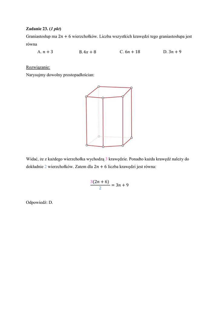 Zadanie 23. (1 pkt) Graniastosłup ma 2 6 wierzchołków. Liczba wszystkich krawędzi tego graniastosłupa jest równa A. 3 B. 4 8 C. 6 18 D. 3 9 Rozwiązanie: Narysujmy dowolny prostopadłościan: Widać, że z każdego wierzchołka wychodzą 3 krawędzie. Ponadto każda krawędź należy do dokładnie 2 wierzchołków. Zatem dla 2 6 liczba krawędzi jest równa: 32 6 3 9 2 Odpowiedź: D.