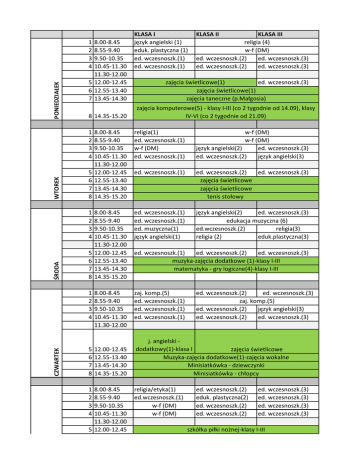 PONIEDZIAŁEK 1 2 3 4 8.00-8.45 8.55-9.40 9.50-10.35 10.45-11.30 11.30-12.00 5 12.00-12.45 6 12.55-13.40 7 13.45-14.30 8 14.35-15.20 WTOREK 1 2 3 4 ŚRODA CZWARTEK KLASA II KLASA III religia (4) w-f (DM) ed. wczesnoszk.(2) ed. wczesnoszk.(3) ed. wczesnoszk.(2) ed. wczesnoszk.(3) zajęcia świetlicowe(1) ed. wczesnoszk.(3) zajęcia świetlicowe(1) zajęcia taneczne (p.Małgosia) zajęcia komputerowe(5) - klasy I-III (co 2 tygodnie od 14.09), klasy IV-VI (co 2 tygodnie od 21.09) 8.00-8.45 8.55-9.40 9.50-10.35 10.45-11.30 11.30-12.00 12.00-12.45 12.55-13.40 13.45-14.30 14.35-15.20 religia(1) ed. wczesnoszk.(1) w-f (DM) ed. wczesnoszk.(1) w-f (DM) w-f (DM) język angielski(2) ed. wczesnoszk.(3) ed. wczesnoszk.(2) język angielski(3) ed. wczesnoszk.(1) ed. wczesnoszk.(2) ed. wczesnoszk.(3) zajęcia świetlicowe zajęcia świetlicowe tenis stołowy 8.00-8.45 8.55-9.40 9.50-10.35 10.45-11.30 11.30-12.00 12.00-12.45 12.55-13.40 13.45-14.30 14.35-15.20 ed. wczesnoszk.(1) ed. wczesnoszk.(1) ed. muzyczna(1) język angielski(1) język angielski(2) ed. wczesnoszk.(3) edukacja muzyczna (6) ed.wczesnoszk.(2) religia(3) religia (2) eduk.plastyczna(3) 1 2 3 4 8.00-8.45 8.55-9.40 9.50-10.35 10.45-11.30 11.30-12.00 zaj. komp.(5) ed. wczesnoszk.(1) ed. wczesnoszk.(1) ed. wczesnoszk.(1) 5 6 7 8 12.00-12.45 12.55-13.40 13.45-14.30 14.35-15.20 5 6 7 8 1 2 3 4 5 6 7 8 1 2 3 4 8.00-8.45 8.55-9.40 9.50-10.35 10.45-11.30 11.30-12.00 5 12.00-12.45 PIĄTEK KLASA I język angielski (1) eduk. plastyczna (1) ed. wczesnoszk.(1) ed. wczesnoszk.(1) ed. wczesnoszk.(1) ed. wczesnoszk.(2) ed. wczesnoszk.(3) muzyka-zajęcia dodatkowe (1)-klasy I-III matematyka - gry logiczne(4)-klasy I-III ed. wczesnoszk.(2) ed. wczesnoszk.(3) zaj. komp.(5) ed. wczesnoszk.(2) język angielski(3) ed. wczesnoszk.(2) ed. wczesnoszk.(3) j. angielski dodatkowy(1)-klasa I zajęcia świetlicowe Muzyka-zajęcia dodatkowe(1)-zajęcia wokalne Minisiatkówka - dziewczynki Minisiatkówka - chłopcy religia/etyka(1) ed.wczesnoszk.(1) w-f (DM) w-f (DM) ed. wczesnoszk.(2) eduk. plastyczna(2) ed. wczesnoszk.(2) ed. wczesnoszk.(2) ed. wczesnoszk.(3) ed. wczesnoszk.(3) ed. wczesnoszk.(3) ed. wczesnoszk.(3) szkółka piłki nożnej-klasy I-III PIĄTEK 6 12.55-13.40 7 13.45-14.30 8 14.35-15.20 nauka rysunku(1)-klasy I-III taniec - klasy I-III