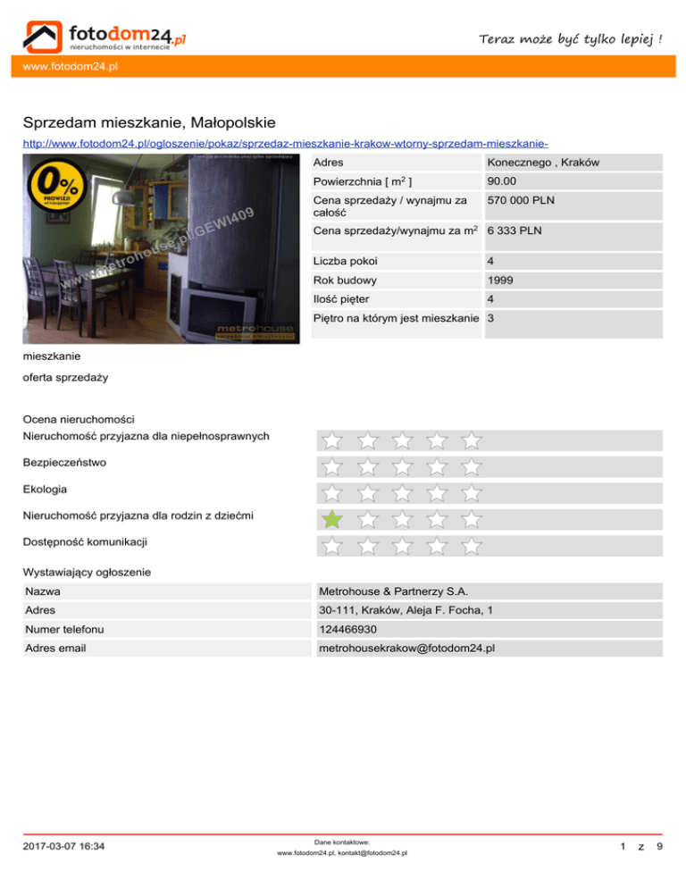 Teraz może być tylko lepiej ! www.fotodom24.pl Sprzedam mieszkanie, Małopolskie http://www.fotodom24.pl/ogloszenie/pokaz/sprzedaz-mieszkanie-krakow-wtorny-sprzedam-mieszkanieAdres Konecznego , Kraków Powierzchnia [ m2 ] 90.00 Cena sprzedaży / wynajmu za całość 570 000 PLN Cena sprzedaży/wynajmu za m2 6 333 PLN Liczba pokoi 4 Rok budowy 1999 Ilość pięter 4 Piętro na którym jest mieszkanie 3 mieszkanie oferta sprzedaży Ocena nieruchomości Nieruchomość przyjazna dla niepełnosprawnych Bezpieczeństwo Ekologia Nieruchomość przyjazna dla rodzin z dziećmi Dostępność komunikacji Wystawiający ogłoszenie Nazwa Metrohouse & Partnerzy S.A. Adres 30-111, Kraków, Aleja F. Focha, 1 Numer telefonu 124466930 Adres email [email protected] 2017-03-07 16:34 Dane kontaktowe: www.fotodom24.pl, [email protected] 1 z 9 Teraz może być tylko lepiej ! www.fotodom24.pl Lokalizacja Adres Województwo małopolskie Powiat Kraków Miejscowość Kraków Dzielnica Kraków Ulica Konecznego 2017-03-07 16:34 Dane kontaktowe: www.fotodom24.pl, [email protected] 2 z 9 Teraz może być tylko lepiej ! www.fotodom24.pl Parametry Media Internet (stałe łącze) TAK Dane szczegółowe Powierzchnia całkowita [ m2 ] 90 Wysokość pomieszczeń [cm] 285 Liczba pokoi 4 Liczba pięter 4 Piętro 3 Rok budowy 1999 Balkon TAK Taras NIE Piwnica NIE Liczba poziomów jeden poziom 2017-03-07 16:34 Dane kontaktowe: www.fotodom24.pl, [email protected] 3 z 9 Teraz może być tylko lepiej ! www.fotodom24.pl Udogodnienia Bezpieczeństwo Ochrona na osiedlu TAK Dla rodziń z dziećmi Pomieszczenie na wózki 2017-03-07 16:34 TAK Dane kontaktowe: www.fotodom24.pl, [email protected] 4 z 9 Teraz może być tylko lepiej ! www.fotodom24.pl Opłaty Cena sprzedaży 570 000 PLN Cena sprzedazy Cena sprzedaży / m2 6 333 PLN Średnie koszty eksploatacji Media m-c 2017-03-07 16:34 0 Dane kontaktowe: www.fotodom24.pl, [email protected] 5 z 9 Teraz może być tylko lepiej ! www.fotodom24.pl Opis Przestronne, dwupoziomowe mieszkanie, umiejscowione na Prądniku Białym. Mieszkanie jest wykończone w podwyższonym standardzie, utrzymane w dobrym stanie, nie wymaga wkładu finansowego, gotowe do zamieszkania bez wymaganego remontu. W pobliżu bloku znajdują się liczne miejsca postojowe. Istnieje możliwość dokupienia garażu oraz miejsca w piwnicy. Cena do negocjacji. Główne atuty nieruchomości: doskonała komunikacja z centrum, w pełni wykończony lokal , zabudowa kuchni i sprzęt w cenie. Nieruchomość złożona z: przedpokój 15,4 m.kw, pokój 8 m.kw, pokój 16,6 m.kw, kuchnia otwarta z oknem 9,4 m.kw, pomieszczenie 1,3 m.kw, wc 1,4 m.kw, przedpokój 3,1 m.kw, pokój 9,2 m.kw, pokój 9 m.kw, łazienka 6,1 m.kw, garderoba 2,2 m.kw. W skład nieruchomości wchodzą też: balkon, miejsce parkingowe. Ogrzewanie miejskie. Własność własność. Nie pobieramy prowizji od Kupującego! W Metrohouse płacisz tylko właścicielowi nieruchomości uzgodnioną z nim cenę, bez żadnych dodatkowych opłat. Kupując nieruchomość przez Metrohouse dodatkowo objęty będziesz bezpłatnym ubezpieczeniem przy zakupie nieruchomości. Każda osoba, która dokona zakupu mieszkania za pośrednictwem Metrohouse otrzyma od nas świadczenia usług assistance na okres 12 miesięcy. Ubezpieczenie Mieszkanie z Gwarancją dla klientów Metrohouse jest realizowane przez 2017-03-07 16:34 Dane kontaktowe: www.fotodom24.pl, [email protected] 6 z 9 Teraz może być tylko lepiej ! www.fotodom24.pl Galeria 2017-03-07 16:34 Dane kontaktowe: www.fotodom24.pl, [email protected] 7 z 9 Teraz może być tylko lepiej ! www.fotodom24.pl Notatki 2017-03-07 16:34 Dane kontaktowe: www.fotodom24.pl, [email protected] 8 z 9 Teraz może być tylko lepiej ! www.fotodom24.pl 2017-03-07 16:34 Dane kontaktowe: www.fotodom24.pl, [email protected] 9 z 9