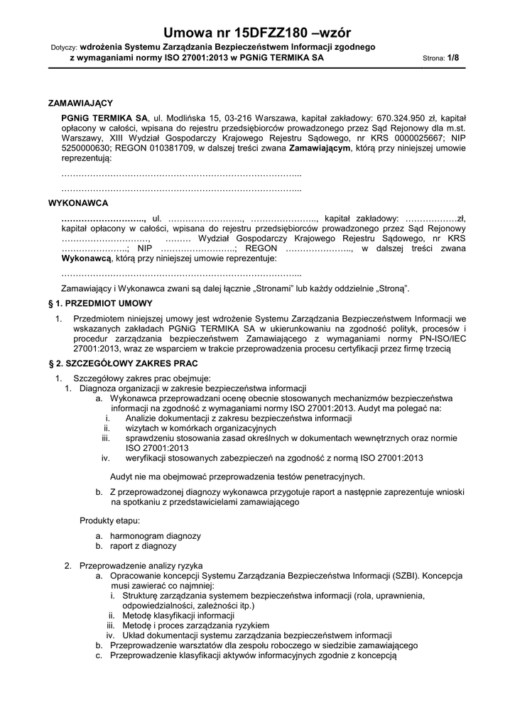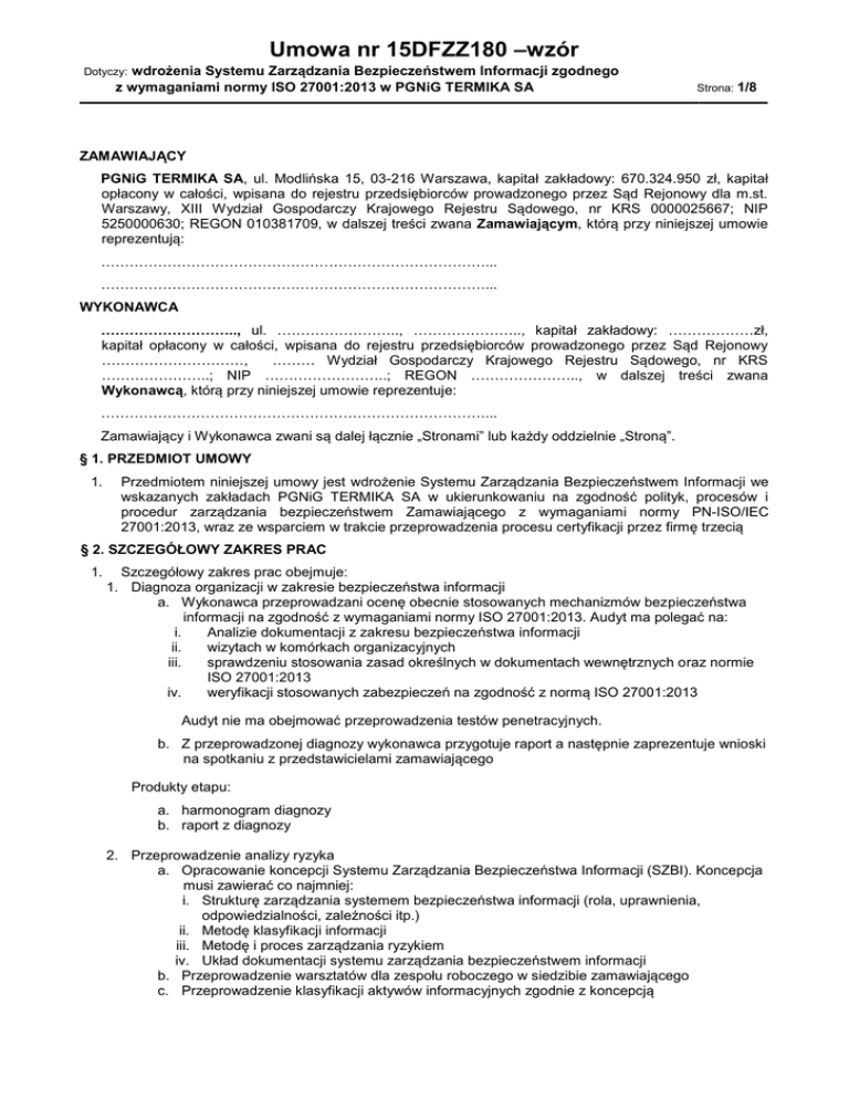 Umowa nr 15DFZZ180 –wzór wdrożenia Systemu Zarządzania Bezpieczeństwem Informacji zgodnego z wymaganiami normy ISO 27001:2013 w PGNiG TERMIKA SA Dotyczy: Strona: 1/8 ZAMAWIAJĄCY PGNiG TERMIKA SA, ul. Modlińska 15, 03-216 Warszawa, kapitał zakładowy: 670.324.950 zł, kapitał opłacony w całości, wpisana do rejestru przedsiębiorców prowadzonego przez Sąd Rejonowy dla m.st. Warszawy, XIII Wydział Gospodarczy Krajowego Rejestru Sądowego, nr KRS 0000025667; NIP 5250000630; REGON 010381709, w dalszej treści zwana Zamawiającym, którą przy niniejszej umowie reprezentują: ………………………………………………………………………... ………………………………………………………………………... WYKONAWCA ……………………….., ul. …………………….., ………………….., kapitał zakładowy: ………………zł, kapitał opłacony w całości, wpisana do rejestru przedsiębiorców prowadzonego przez Sąd Rejonowy …………………………, ……… Wydział Gospodarczy Krajowego Rejestru Sądowego, nr KRS …………………..; NIP ……………………..; REGON ………………….., w dalszej treści zwana Wykonawcą, którą przy niniejszej umowie reprezentuje: ………………………………………………………………………... Zamawiający i Wykonawca zwani są dalej łącznie „Stronami” lub każdy oddzielnie „Stroną”. § 1. PRZEDMIOT UMOWY 1. Przedmiotem niniejszej umowy jest wdrożenie Systemu Zarządzania Bezpieczeństwem Informacji we wskazanych zakładach PGNiG TERMIKA SA w ukierunkowaniu na zgodność polityk, procesów i procedur zarządzania bezpieczeństwem Zamawiającego z wymaganiami normy PN-ISO/IEC 27001:2013, wraz ze wsparciem w trakcie przeprowadzenia procesu certyfikacji przez firmę trzecią § 2. SZCZEGÓŁOWY ZAKRES PRAC 1. Szczegółowy zakres prac obejmuje: 1. Diagnoza organizacji w zakresie bezpieczeństwa informacji a. Wykonawca przeprowadzani ocenę obecnie stosowanych mechanizmów bezpieczeństwa informacji na zgodność z wymaganiami normy ISO 27001:2013. Audyt ma polegać na: i. Analizie dokumentacji z zakresu bezpieczeństwa informacji ii. wizytach w komórkach organizacyjnych iii. sprawdzeniu stosowania zasad określnych w dokumentach wewnętrznych oraz normie ISO 27001:2013 iv. weryfikacji stosowanych zabezpieczeń na zgodność z normą ISO 27001:2013 Audyt nie ma obejmować przeprowadzenia testów penetracyjnych. b. Z przeprowadzonej diagnozy wykonawca przygotuje raport a następnie zaprezentuje wnioski na spotkaniu z przedstawicielami zamawiającego Produkty etapu: a. harmonogram diagnozy b. raport z diagnozy 2. Przeprowadzenie analizy ryzyka a. Opracowanie koncepcji Systemu Zarządzania Bezpieczeństwa Informacji (SZBI). Koncepcja musi zawierać co najmniej: i. Strukturę zarządzania systemem bezpieczeństwa informacji (rola, uprawnienia, odpowiedzialności, zależności itp.) ii. Metodę klasyfikacji informacji iii. Metodę i proces zarządzania ryzykiem iv. Układ dokumentacji systemu zarządzania bezpieczeństwem informacji b. Przeprowadzenie warsztatów dla zespołu roboczego w siedzibie zamawiającego c. Przeprowadzenie klasyfikacji aktywów informacyjnych zgodnie z koncepcją Umowa nr 15DFZZ180 –wzór wdrożenia Systemu Zarządzania Bezpieczeństwem Informacji zgodnego z wymaganiami normy ISO 27001:2013 w PGNiG TERMIKA SA Dotyczy: Strona: 2/8 d. Przeprowadzenie analizy ryzyka utraty bezpieczeństwa informacji zgodnie z koncepcją (SZBI) – wykonawca przeprowadzi analizę ryzyka podczas wspólnych spotkań z wyznaczonymi pracownikami zamawiającego. Nie dopuszcza się przeprowadzenia analizy ryzyka poprzez rozesłanie ankiet i zebranie wyników. Zamawiający wymaga aby maksymalna ilość prac była zrealizowana przez Wykonawcę. Sposób przeprowadzenia analizy ryzyka będzie uzgodniony w koncepcji SZBI oraz zaakceptowany przez Zamawiającego. Produkty etapu a. Koncepcja SZBI b. Materiały na szkolenie c. Dokument klasyfikacji aktywów d. Raport z analizy ryzyka 3. Przygotowanie planu postępowania z ryzykiem a. Wykonawca na podstawie wyników analizy ryzyka zaproponuje działania mające na celu obniżenie ryzyka utraty bezpieczeństwa informacji b. Wykonawca zaprezentuję propozycję plany minimalizacji ryzyka przed przedstawicielami Zamawiającego c. Wykonawca przygotuje ostateczną wersję dokumentu plan postępowania z ryzykiem Produkty etapu a. Plan postępowania z ryzykiem 4. Opracowanie dokumentacji SZBI a. Na podstawie koncepcji oraz zapisów planu postępowania z ryzykiem Wykonawca opracuje we współpracy z Zamawiającym dokumentację. b. Dokumentacja powinna zostać opracowana podczas wspólnych warsztatów w których uczestniczą przedstawiciele Wykonawcy oraz Zamawiającego c. Po przeprowadzonych warsztatach Wykonawca przygotuje projekty dokumentów i przesyła je Zamawiającemu do akceptacji d. W ramach opracowanej dokumentacji Wykonawca w uzgodnieniu z Zamawiającym opracuje mierniki do zabezpieczeń wraz ze sposobem, czasookresem i odpowiedzialnościami w zakresie ich monitorowania e. Zamawiający ma prawo zgłaszać uwagi do przedstawionych dokumentów f. Opracowana dokumentacja musi uwzględniać specyfikę Zamawiającego, aktualne dokumenty funkcjonujące u Zamawiającego i być przygotowane w szablonach Zamawiającego. Produkty etapu a. Dokumentacja SZBI wraz z miernikami stosowanych zabezpieczeń 5. Budowanie świadomości pracowników a. Wykonawca przygotuje propozycję programu budowania świadomości pracowników b. Wykonawca będzie zobligowany do wykonania co najmniej następujących prac: i. Opracowania materiału dla pracowników dotyczącego wdrożonego SZBI ii. Przygotowania szkolenia e-learningowego oraz udostępnienia szkolenia na własnej platformie e-learningowej Produkty etapu a. Program budowania świadomości pracowników b. Udostępniona gra e-learningowa 6. Przeprowadzenie audytów wew