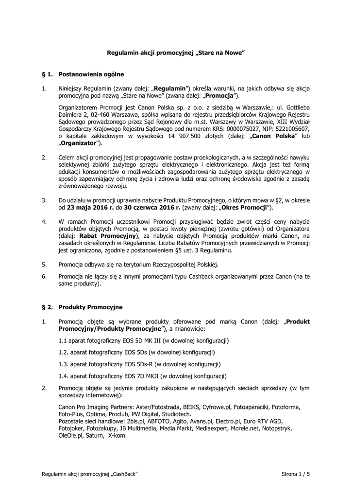 Regulamin akcji promocyjnej „Stare na Nowe” § 1. Postanowienia ogólne 1. Niniejszy Regulamin (zwany dalej: „Regulamin”) określa warunki, na jakich odbywa się akcja promocyjna pod nazwą „Stare na Nowe” (zwana dalej: „Promocja”). Organizatorem Promocji jest Canon Polska sp. z o.o. z siedzibą w Warszawie,: ul. Gottlieba Daimlera 2, 02-460 Warszawa, spółka wpisana do rejestru przedsiębiorców Krajowego Rejestru Sądowego prowadzonego przez Sąd Rejonowy dla m.st. Warszawy w Warszawie, XIII Wydział Gospodarczy Krajowego Rejestru Sądowego pod numerem KRS: 0000075027, NIP: 5221005607, o kapitale zakładowym w wysokości 14 907 500 złotych (dalej: „Canon Polska” lub „Organizator”). 2. Celem akcji promocyjnej jest propagowanie postaw proekologicznych, a w szczególności nawyku selektywnej zbiórki zużytego sprzętu elektrycznego i elektronicznego. Akcja jest też formą edukacji konsumentów o możliwościach zagospodarowania zużytego sprzętu elektrycznego w sposób zapewniający ochronę życia i zdrowia ludzi oraz ochronę środowiska zgodnie z zasadą zrównoważonego rozwoju. 3. Do udziału w promocji uprawnia nabycie Produktu Promocyjnego, o którym mowa w §2, w okresie od 23 maja 2016 r. do 30 czerwca 2016 r. (zwany dalej: „Okres Promocji”). 4. W ramach Promocji uczestnikowi Promocji przysługiwać będzie zwrot części ceny nabycia produktów objętych Promocją, w postaci kwoty pieniężnej (zwrotu gotówki) od Organizatora (dalej: Rabat Promocyjny), za nabycie objętych Promocją produktów marki Canon, na zasadach określonych w Regulaminie. Liczba Rabatów Promocyjnych przewidzianych w Promocji jest ograniczona, zgodnie z postanowieniem §5 ust. 3 Regulaminu. 5. Promocja odbywa się na terytorium Rzeczypospolitej Polskiej. 6. Promocja nie łączy się z innymi promocjami typu Cashback organizowanymi przez Canon (na te same produkty). § 2. Produkty Promocyjne 1. Promocją objęte są wybrane produkty oferowane pod marką Canon (dalej: „Produkt Promocyjny/Produkty Promocyjne”), a mianowicie: 1.1 aparat fotograficzny EOS 5D MK III (w dowolnej konfiguracji) 1.2. aparat fotograficzny EOS 5Ds (w dowolnej konfiguracji) 1.3. aparat fotograficzny EOS 5Ds-R (w dowolnej konfiguracji) 1.4. aparat fotograficzny EOS 7D MKII (w dowolnej konfiguracji) 2. Promocją objęte są jedynie produkty zakupione w następujących sieciach sprzedaży (w tym sprzedaży internetowej): Canon Pro Imaging Partners: Aster/Fotostrada, BEIKS, Cyfrowe.pl, Fotoaparaciki, Fotoforma, Foto-Plus, Optima, Proclub, PW Digital, Studiotech. Pozostałe sieci handlowe: 2bis.pl, ABFOTO, Agito, Avans.pl, Electro.pl, Euro RTV AGD, Fotojoker, Fotozakupy, JB Multimedia, Media Markt, Mediaexpert, Morele.net, Notopstryk, OleOle.pl, Saturn, X-kom. Regulamin akcji promocyjnej „CashBack” Strona 1 / 5 3. Promocją objęte są wyłącznie Produkty Promocyjne fabrycznie nowe, nabyte w punktach sprzedaży detalicznej na terenie Rzeczypospolitej Polskiej, w tym nabyte w ramach sprzedaży na odległość prowadzonej przez przedsiębiorców posiadających miejsce zamieszkania albo siedzibę w Rzeczypospolitej Polskiej (np. w sklepach internetowych). Do udziału w Promocji nie uprawnia nabycie Produktu Premiowanego poza granicami Rzeczypospolitej Polskiej lub od osoby fizycznej, która nie prowadzi działalności gospodarczej. Promocją nie są objęte Produkty Promocyjne pochodzące ze sprzedaży wtórnej (komisowej lub podobnej). 4. Organizator informuje, że Promocja obejmuje produkty marki Canon, które zostały wprowadzone do obrotu w Rzeczypospolitej Polskiej przez Canon Polska lub autoryzowanych dystrybutorów Canon Polska na terenie Rzeczypospolitej Polskiej w tym zgodnie z postanowieniami § 2 pkt 2 i 3 Regulaminu. 5. Promocją objęte są produkty zakupione w oryginalnych opakowaniach, na których znajduje się numer EAN i numer seryjny produktu. Nie są objęte promocją produkty pochodzące z rozpakowania oryginalnych zestawów (białe pudełka) oraz przepakowane przez sprzedawców do własnych opakowań. 6. Uczestnik promocji może zgłosić nabycie i uzyskać w całym Okresie Promocji Rabat Promocyjny za maksymalnie 1 sztukę każdego Produktu Promocyjnego. Zgłoszenie więcej niż 1 sztuki każdego Produktu Promocyjnego nie uprawnia do otrzymania więcej niż jednego Rabatu Promocyjnego za dany produkt. 7. W przypadku zakupu fabrycznie zapakowanego zestawu produktów (body + obiektyw/-y), Rabat Promocyjny można otrzymać wyłącznie za produkt główny (body), nawet jeśli obiektyw będący składnikiem zestawu jest na liście produktów objętych promocją. § 3. Uczestnictwo w Promocji 1. Uczestnikiem Promocji (dalej: „Uczestnik/Uczestnicy”) może być: 1.1. 1.2. 2. każda osoba fizyczna, posiadająca pełną zdolność do czynności prawnych, która w Okresie Promocji nabyła Produkt Promocyjny, jako konsument w rozumieniu art. 221 Kodeksu cywilnego; albo przedsiębiorca, bez względu na formę organizacyjno-prawną (w tym osoba fizyczna prowadząca działalność gospodarczą, osoba prawna albo jednostka organizacyjna nieposiadająca osobowości prawnej, której ustawa przyznaje zdolność prawną), posiadający miejsce zamieszkania albo siedzibę w Rzeczypospolitej Polskiej, który w Okresie Promocji nabył Produkt Promocyjny. Warunkiem udziału w Promocji jest spełnienie przez Uczestnika łącznie następujących warunków: 2.1. 2.2. 2.3. 2.4. 2.5. zachowanie oryginalnego dowodu zakupu Produktu Promocyjnego (Produktów Promocyjnych), nabytego (nabytych) w Okresie Promocji, w postaci otrzymanego od sprzedawcy paragonu fiskalnego lub wystawionej przez sprzedawcę faktury VAT (dalej: „Dowód Zakupu”), wycięcie oryginalnego kodu kreskowego oraz numeru seryjnego Produktu Promocyjnego (Produktów Promocyjnych), pochodzącego (pochodzących) z opakowania zakupionego Produktu Promocyjnego (Produktów Promocyjnych) i przesłanie skanu lub zdjęcia (w kolorze) wyciętego ko