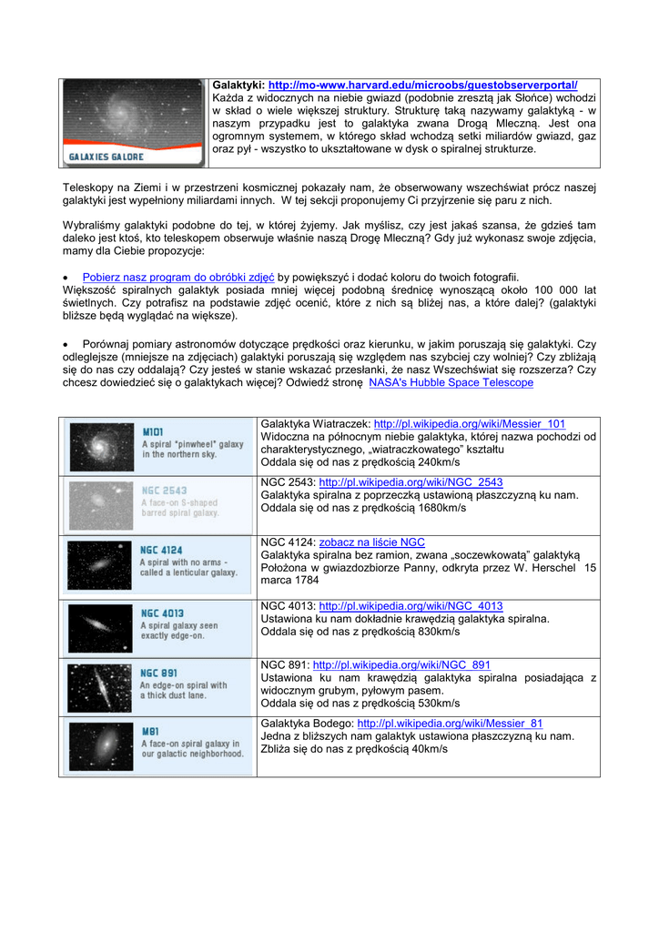 Galaktyki: http://mo-www.harvard.edu/microobs/guestobserverportal/ Każda z widocznych na niebie gwiazd (podobnie zresztą jak Słońce) wchodzi w skład o wiele większej struktury. Strukturę taką nazywamy galaktyką - w naszym przypadku jest to galaktyka zwana Drogą Mleczną. Jest ona ogromnym systemem, w którego skład wchodzą setki miliardów gwiazd, gaz oraz pył - wszystko to ukształtowane w dysk o spiralnej strukturze. Teleskopy na Ziemi i w przestrzeni kosmicznej pokazały nam, że obserwowany wszechświat prócz naszej galaktyki jest wypełniony miliardami innych. W tej sekcji proponujemy Ci przyjrzenie się paru z nich. Wybraliśmy galaktyki podobne do tej, w której żyjemy. Jak myślisz, czy jest jakaś szansa, że gdzieś tam daleko jest ktoś, kto teleskopem obserwuje właśnie naszą Drogę Mleczną? Gdy już wykonasz swoje zdjęcia, mamy dla Ciebie propozycje: • Pobierz nasz program do obróbki zdjęć by powiększyć i dodać koloru do twoich fotografii. Większość spiralnych galaktyk posiada mniej więcej podobną średnicę wynoszącą około 100 000 lat świetlnych. Czy potrafisz na podstawie zdjęć ocenić, które z nich są bliżej nas, a które dalej? (galaktyki bliższe będą wyglądać na większe). • Porównaj pomiary astronomów dotyczące prędkości oraz kierunku, w jakim poruszają się galaktyki. Czy odleglejsze (mniejsze na zdjęciach) galaktyki poruszają się względem nas szybciej czy wolniej? Czy zbliżają się do nas czy oddalają? Czy jesteś w stanie wskazać przesłanki, że nasz Wszechświat się rozszerza? Czy chcesz dowiedzieć się o galaktykach więcej? Odwiedź stronę NASA's Hubble Space Telescope Galaktyka Wiatraczek: http://pl.wikipedia.org/wiki/Messier_101 Widoczna na północnym niebie galaktyka, której nazwa pochodzi od charakterystycznego, „wiatraczkowatego” kształtu Oddala się od nas z prędkością 240km/s NGC 2543: http://pl.wikipedia.org/wiki/NGC_2543 Galaktyka spiralna z poprzeczką ustawioną płaszczyzną ku nam. Oddala się od nas z prędkością 1680km/s NGC 4124: zobacz na liście NGC Galaktyka spiralna bez ramion, zwana „soczewkowatą” galaktyką Położona w gwiazdozbiorze Panny, odkryta przez W. Herschel 15 marca 1784 NGC 4013: http://pl.wikipedia.org/wiki/NGC_4013 Ustawiona ku nam dokładnie krawędzią galaktyka spiralna. Oddala się od nas z prędkością 830km/s NGC 891: http://pl.wikipedia.org/wiki/NGC_891 Ustawiona ku nam krawędzią galaktyka spiralna posiadająca z widocznym grubym, pyłowym pasem. Oddala się od nas z prędkością 530km/s Galaktyka Bodego: http://pl.wikipedia.org/wiki/Messier_81 Jedna z bliższych nam galaktyk ustawiona płaszczyzną ku nam. Zbliża się do nas z prędkością 40km/s