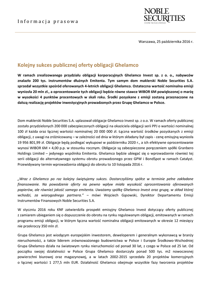 Informacja prasowa Warszawa, 25 października 2016 r. Kolejny sukces publicznej oferty obligacji Ghelamco W ramach zrealizowanego przydziału obligacji korporacyjnych Ghelamco Invest sp. z o. o., nabywców znalazło 200 tys. instrumentów dłużnych Emitenta. Tym samym dom maklerski Noble Securities S.A. sprzedał wszystkie spośród oferowanych 4-letnich obligacji Ghelamco. Ostateczna wartość nominalna emisji wyniosła 20 mln zł., a oprocentowanie tych obligacji będzie równe stawce WIBOR 6M powiększonej o marżę w wysokości 4 punktów procentowych w skali roku. Środki pozyskane z emisji zostaną przeznaczone na dalszą realizację projektów inwestycyjnych prowadzonych przez Grupę Ghelamco w Polsce. Dom maklerski Noble Securities S.A. uplasował obligacje Ghelamco Invest sp. z o.o. W ramach oferty publicznej zostało przydzielonych 200 000 zabezpieczonych obligacji na okaziciela obligacji serii PPJ o wartości nominalnej 100 zł każda oraz łącznej wartości nominalnej 20 000 000 zł. Łączna wartość środków pozyskanych z emisji obligacji, z uwagi na zróżnicowaną – w zależności od dnia w którym składany był zapis - cenę emisyjną wyniosła 19 956 801,99 zł. Obligacje będą podlegać wykupowi w październiku 2020 r., a ich efektywne oprocentowanie wynosi WIBOR 6M + 4,00 p.p. w stosunku rocznym. Obligacje są zabezpieczone poręczeniem spółki Granbero Holdings Limited – jedynego wspólnika Emitenta. Ghelamco będzie ubiegać się o wprowadzenie również tej serii obligacji do alternatywnego systemu obrotu prowadzonego przez GPW i BondSpot w ramach Catalyst. Przewidywany termin wprowadzenia obligacji do obrotu to 10 listopada 2016 r. „Wraz z Ghelamco po raz kolejny świętujemy sukces. Dostarczyliśmy spółce w terminie pełne zakładane finansowanie. Na powodzenie oferty na pewno wpływ miała wysokość oprocentowania oferowanych papierów, ale również jakość samego emitenta. Uważamy spółkę Ghelamco Invest oraz grupę, w skład której wchodzi, za wiarygodnego partnera.” – mówi Wojciech Gąsowski, Dyrektor Departamentu Emisji Instrumentów Finansowych Noble Securities S.A. W styczniu 2016 roku KNF zatwierdziła prospekt emisyjny Ghelamco Invest dotyczący oferty publicznej z zamiarem ubieganiem się o dopuszczenie do obrotu na rynku regulowanym obligacji, emitowanych w ramach programu emisji obligacji, w którym łączna wartość nominalna obligacji emitowanych w okresie 12 miesięcy nie przekroczy 350 mln zł. Grupa Ghelamco jest wiodącym europejskim inwestorem, deweloperem i generalnym wykonawcą w branży nieruchomości, a także liderem zrównoważonego budownictwa w Polsce i Europie Środkowo-Wschodniej Grupa Ghelamco działa na światowym rynku nieruchomości od ponad 30 lat, z czego w Polsce od 25 lat. Od początku swojej działalności w Polsce Grupa Ghelamco dostarczyła ponad 500 tys. m2 nowoczesnej powierzchni biurowej oraz magazynowej, a w latach 2002-2015 sprzedała 20 projektów komercyjnych o łącznej wartości 1 277,5 mln EUR. Działalność Ghelamco obejmuje wszystkie fazy tworzenia projektów Informacja prasowa deweloperskich, począwszy od zakupu gruntów poprzez planowanie i koordynację budowy aż po komercjalizację i sprzedaż inwestycji. Dom maklerski Noble Securities S.A. jest jednym z liderów rynku obligacji korporacyjnych. W 2015 roku Noble Securities przeprowadził 52 emisje obligacji korporacyjnych pozyskując dla emitentów blisko 1 mld zł. Informacje dodatkowe: Dom maklerski Noble Securities S.A. od ponad 22 lat aktywnie uczestniczy na rynku kapitałowym oferując inwestowanie w akcje, obligacje, inne papiery wartościowe oraz produkty niebrokerskie. Broker, jako aktywny uczestnik rynku corporate finance, od 2010 r., pozyskał dla klientów w drodze publicznych i niepublicznych emisji akcji i obligacji ponad 8 mld zł. Oferta Noble Securities S.A. obejmuje również inwestowanie na platformie forexowej Noble Markets, dającej możliwość lokowania środków w instrumenty finansowe oparte o waluty, towary, akcje spółek zagranicznych oraz indeksy giełdowe z całego świata. Noble Securities S.A. jest także wiodącym uczestnikiem rynków organizowanych przez Towarową Giełdę Energii S.A. (dalej: TGE). Oferta inwestycyjna Noble Securities S.A. dostępna jest zarówno poprzez Internet, jak i w 18 Punktach Obsługi Klienta zlokalizowanych w całej Polsce. W 2015 r. Noble Securities S.A. został nagrodzony przez Giełdę Papierów Wartościowych w Warszawie S.A. (dalej: GPW) dwoma statuetkami „Lider Rynku 2014”. Pierwsza nagroda jest uhonorowaniem aktywności na rynku Catalyst i została przyznana za największą liczbę serii obligacji korporacyjnych wprowadzonych do obrotu na tym rynku w 2014 r. Drugie wyróżnienie dotyczy pionierskiej postawy Noble Securities S.A. w zakresie dystrybucji danych giełdowych, gdyż jako dom maklerski udostępnia swoim klientom dane rzeczywiste nie tylko z GPW, ale również z TGE i BondSpot. Natomiast w 2016 r. Zespół Analiz Rynkowych Noble Securities otrzymał wyróżnienie przyznane przez gazetę giełdy Parkiet za zajęcie drugiego miejsca w rywalizacji portfeli fundamentalnych. Więcej informacji Natalia Franczak | Dyrektor Departamentu Marketingu i Public Relations Tel: 785 990 124| [email protected] Noble Securities S.A. 01-208 Warszawa, ul Przyokopowa 33 Budynek Wola Center, Klatka A, piętro 7 tel.: 22 244 13 03 www.noblesecurities.pl