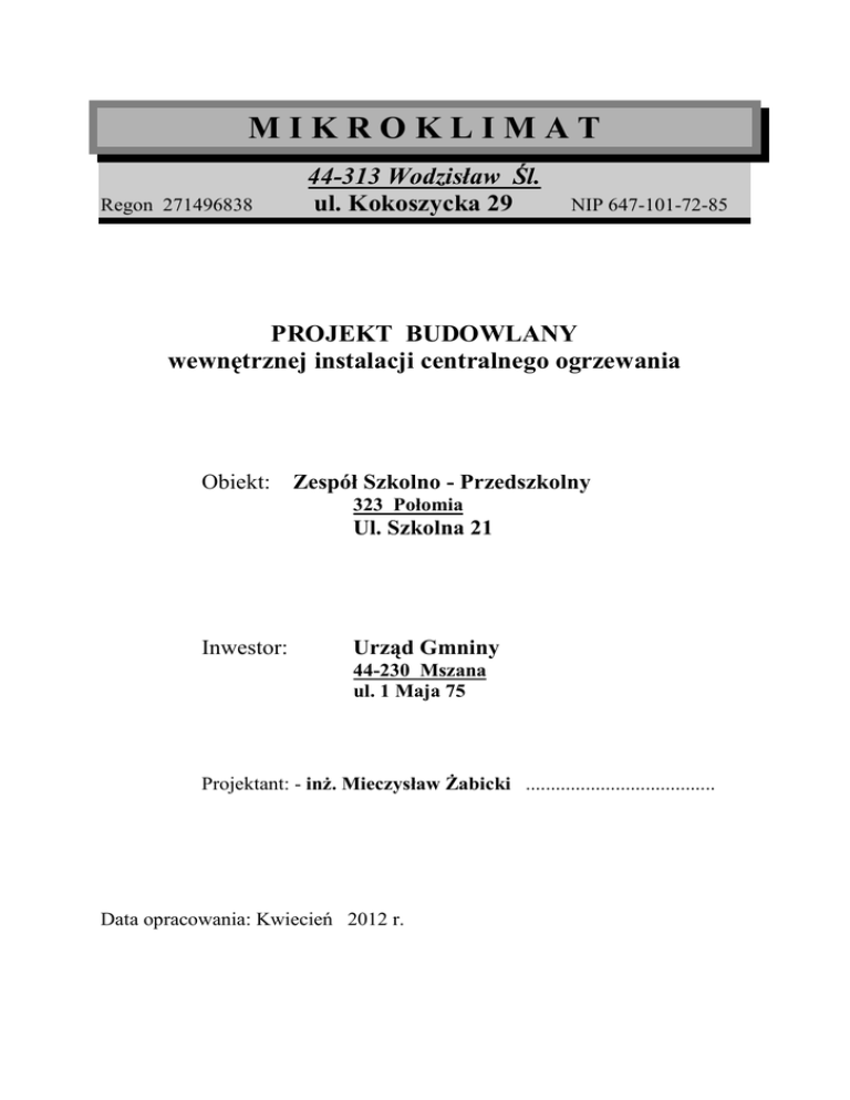 MIKROKLIMAT Regon 271496838 44-313 Wodzisław Śl. ul. Kokoszycka 29 NIP 647-101-72-85 PROJEKT BUDOWLANY wewnętrznej instalacji centralnego ogrzewania Obiekt: Zespół Szkolno - Przedszkolny 323 Połomia Ul. Szkolna 21 Inwestor: Urząd Gmniny 44-230 Mszana ul. 1 Maja 75 Projektant: - inŜ. Mieczysław śabicki ...................................... Data opracowania: Kwiecień 2012 r. Zawartość opracowania I. Opis techniczny 1. Temat opracowania 2. Podstawa opracowania 3. Zakres opracowania 4. Instalacja centralnego ogrzewania 5. Kotłownia 6. Przygotowanie c.w.u. 7. Uwagi 8. Załączniki - Obliczenia hydrauliczne - Zestawienie zaworów i armatury - Zestawienie grzejników - Zestawienie izolacji - Zestawienie rur - Dobór naczynia przeponowego Reflex N500 – inst. c.o. - Dobór zaworu bezpieczeństwa SYR – kocioł c.o. - Dobór naczynia przeponowego Reflex N80 – kocioł. c.w.u. - Dobór zaworu bezpieczeństwa SYR – kocioł c.w.u. - Dobór naczynia przeponowego Refix DT5 200 – podgrz. c.w.u. - Dobór zaworu bezpieczeństwa SYR – podgrzewacze c.w.u. - Dobór promienników wodnych 2 x 8 m i 2 x 7 m - Mocowanie promienników wodnych II. Informacja BiOZ III.Część rysunkowa 1. 2. 3. 4. 5. 6. 7. 8. 9. 10. 11. 12. 13. 14. 15. 16. 17. Segment Segment Segment Segment Segment Segment A,B – poz. 0,00 A,B – poz. 3,60 A,B – poz. 7,20 D - poz. 0,00 C, D, E – poz. 3,60 C, D, E, I – poz. 6,30 F, G, H – poz. 4,50 Segment C, D, E – poz. 9,30 Segment C, D, E – poz. 12,90 Segment F, G – poz. 0,90 Segment G, H – poz. 8,10 Rozwinięcie – Cz. 1 Rozwinięcie – Cz. 2 Rozwinięcie – Cz. 3 Rozwinięcie – Cz. 4 Rzut kotłowni Schemat technologiczny kotłowni gazowej Schemat technologiczny przygotowania c.w.u. OŚWIADCZENIE Zgodnie z Art.20, pkt. 4 ustawy Prawo budowlane z dnia 7 lipca 1994r. ( z późniejszymi zmianami ) oświadczam, Ŝe projekt budowlanymode3rnizacji instalacji centralnego ogrzewania w Zespole Szkolno – Przedszkolnym w Połomi sporządzony został zgodnie z obowiązującymi przepisami oraz zasadami wiedzy technicznej. PROJEKTANT: inŜ. Mieczysław śabicki upr. nr 577/90 OPIS TECHNICZNY 1. Temat i zakres opracowania Tematem opracowania jest projekt budowlany wewnętrznej instalacji centralnego ogrzewania i kotłowni gazowej dla Zespołu Szkolno – Przedszkolnego w Połomi przy ul. Szkolna 21. 2. Podstawa opracowania Projekt opracowano na podstawie : • Projektu instalacji c.o. – TEKTOPROJEKT – 1986 r. • Aktualizacja PTJ kotłowni – Biuro Projektów Krystian Stangel – 1993 r. • Adaptacja części pomieszczeń Szkoły Podstawowej w Połomi na przedszkole – CENTRBUD 2010 r. • Inwentaryzacji architektoniczne na potrzeby projektowanej instalacji. • Norm i katalogów technicznych 3. Zakres opracowania Opracowanie obejmuje: • projekt instalacji centralnego ogrzewania • projekt kotłowni gazowej c.o. • projekt kotłowni gazowej dla potrzeb c.w.u. 4. Instalacja centralnego ogrzewania. Przedmiotem projektu jest modernizacja kompleksowa wewnętrznej instalacji centralnego ogrzewania. Nie przewiduje się termomodernizacji budynku dlatego teŜ straty ciepła w budynku pozostają na tym samym poziomie i do obliczeń hydraulicznych przyjęto w wysokości określonej w opracowaniu projektowym TEKTOPROJEKT Zgodnie z Ŝyczeniem Inwestora modernizacji podlega cała instalacja c.o. w budynku Zespołu Szkolno - Przedszkolnego. Modernizacja polega na wymianie wszystkich istniejących grzejników członowych i z rur oŜebrowanych i zamontowanie w ich miejsce grzejników płytowych. Ponadto wszystkie grzejniki wyposaŜone będą w zawory termostatyczne. W ramach wykonywanych czynności projektowych określono nastawy wstępne których wartości zawarte zostały w części rysunkowej ( rozwinięcia ). W pomieszczeniu Auli zastosowano sufitowe promienniki ciepła zasilane wodą. Pomieszczenie to było ogrzewane niedostatecznie. Ze względu na jego wysokość – ciepło do niego dostarczane migrowało pod dach wobec czego na poziomie przebywania ludzi temperatura powietrza była o wiele niŜsza od oczekiwanej. Projektowane promienniki przystosowane SA konstrukcyjnie do ogrzewania wysokich pomieszczeń. Cztery promienniki umieszczone będą pod sufitem na specjalnych systemowych zawiesiach. Regulacja mocy odbywać się będzie zaworami regulacyjnymi wchodzącymi w skład kompletu promiennika. W pomieszczeniach przedszkola wymianie nie podlegają istniejące grzejniki płytowe. Uwzględniono je w obliczeniach hydraulicznych. W całym kompleksie zespołu szkolnego zastosowano grzejniki typu INTEGRA typu VK zasilane od dołu fabrycznie wyposaŜone w zawór. Zestaw przyłączeniowy grzejnika wyposaŜony jest w zawory kulowe umoŜliwiające demontaŜ pojedynczego grzejnika bez konieczności opróŜniania całej instalacji. Ze względu na zły stan techniczny wymianie podlega cała instalacja zbudowana z rur stalowych – spawanych. Do obliczeń przyjęto system rur miedzianych i rur TECE. Większość poziomów w budynku prowadzona jest w kanałach podłogowych o stosunkowo małym przekroju. Po zdemontowaniu istniejącego rurarzu wykonawca moŜe zaproponować wykonanie poziomów o równowaŜnych średnicach z rur PE ( PP ) zgrzewanych lub ze stali nierdzewnej łączonych zaciskowo. Sposób montaŜu złączek zaciskanych naleŜy wykonać zgodnie z zaleceniami producenta stosując odpowiednie narzędzia. Podejścia pod grzejniki wykonać zgodnie z zastosowanym systemem. Poziomy prowadzone w kanałach zaizolować ciepłochronnie warstwą pianki poliuretanowej grubości równej średnicy wewnętrznej rury ( zgodnie z zał. 2 Rozporządzenia Ministra Infrastruktury z dnia 12.04.2002 r w sprawie warunków technicznych jakim powinny odpowiadać budynki i ich usytuowanie z późn. zmianami ). Projektowane piony wykonać z rur miedzianych i ( lub ) rur TECE. Średnice pionów określono na rozwinięciach. Grzejniki podokienne naleŜy zabudować w osi okna. Odpowietrze