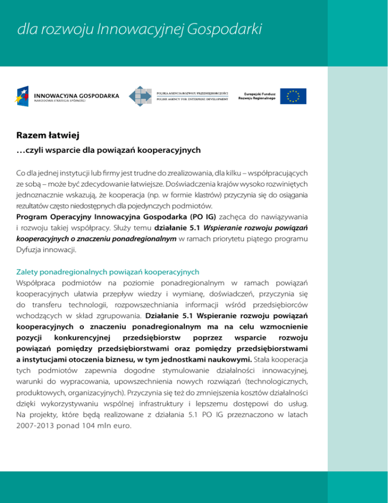 dla rozwoju Innowacyjnej Gospodarki Razem łatwiej …czyli wsparcie dla powiązań kooperacyjnych Co dla jednej instytucji lub firmy jest trudne do zrealizowania, dla kilku – współpracujących ze sobą – może być zdecydowanie łatwiejsze. Doświadczenia krajów wysoko rozwiniętych jednoznacznie wskazują, że kooperacja (np. w formie klastrów) przyczynia się do osiągania rezultatów często niedostępnych dla pojedynczych podmiotów. Program Operacyjny Innowacyjna Gospodarka (PO IG) zachęca do nawiązywania i rozwoju takiej współpracy. Służy temu działanie 5.1 Wspieranie rozwoju powiązań kooperacyjnych o znaczeniu ponadregionalnym w ramach priorytetu piątego programu Dyfuzja innowacji. Zalety ponadregionalnych powiązań kooperacyjnych Współpraca podmiotów na poziomie ponadregionalnym w ramach powiązań kooperacyjnych ułatwia przepływ wiedzy i wymianę, doświadczeń, przyczynia się do transferu technologii, rozpowszechniania informacji wśród przedsiębiorców wchodzących w skład zgrupowania. Działanie 5.1 Wspieranie rozwoju powiązań kooperacyjnych o znaczeniu ponadregionalnym ma na celu wzmocnienie pozycji konkurencyjnej przedsiębiorstw poprzez wsparcie rozwoju powiązań pomiędzy przedsiębiorstwami oraz pomiędzy przedsiębiorstwami a instytucjami otoczenia biznesu, w tym jednostkami naukowymi. Stała kooperacja tych podmiotów zapewnia dogodne stymulowanie działalności innowacyjnej, warunki do wypracowania, upowszechnienia nowych rozwiązań (technologicznych, produktowych, organizacyjnych). Przyczynia się też do zmniejszenia kosztów działalności dzięki wykorzystywaniu wspólnej infrastruktury i lepszemu dostępowi do usług. Na projekty, które będą realizowane z działania 5.1 PO IG przeznaczono w latach 2007-2013 ponad 104 mln euro. Typy realizowanych projektów W ramach działania 5.1 PO IG będą realizowane projekty obejmujące: 1) zakup środków trwałych i wartości niematerialnych i prawnych związanych z nową inwestycją, 2) doradztwo z zakresu opracowywania planów rozwoju i ekspansji powiązania, 3) udział w krajowych i międzynarodowych spotkaniach w celu wymiany doświadczeń, 4) zakup ogólnodostępnej infrastruktury badawczej, 5) inwestycje w infrastrukturę sieci szerokopasmowych, 6) zarządzanie ogólnodostępnym zapleczem technicznym powiązania, 7) działania promocyjne w celu pozyskania nowych przedsiębiorstw do udziału w powiązaniu, 8) organizację programów szkoleniowych, warsztatów i konferencji. Poziom dofinansowania Maksymalna kwota wsparcia na jeden projekt rozwoju powiązania kooperacyjnego wynosi: 1) na cześć inwestycyjną 20 mln zł, 2) na część szkoleniową (związaną z realizacją inwestycji) 1 mln zł, 3) na koszty operacyjne i administracyjne 5 % całkowitych wydatków kwalifikujących się do objęcia wsparciem, 4) na część doradczą 400 tys. zł: • dla koordynatora w zakresie opracowania planu rozwoju i ekspansji powiązania kooperacyjnego, • dla uczestników powiązania kooperacyjnego innych niż koordynator powiązania kooperacyjnego, przy czym usługi te muszą być związane z realizacją projektu i nie mogą stanowić elementu stałej lub okresowej działalności uczestnika powiązania kooperacyjnego lub być związane z bieżącymi wydatkami operacyjnymi tego uczestnika. Szczegółowe informacje dotyczące programów europejskich realizowanych przez Polską Agencję Rozwoju Przedsiębiorczości można uzyskać w Informatorium pod numerami telefonów: 022 432 89 91, 022 432 89 92, 022 432 89 93 oraz 0 801 33 22 02, 0 801 40 64 16 e-mail: [email protected] www.parp.gov.pl DLA ROZWOJU INNOWACYJNEJ GOSPODARKI Kto może uzyskać dofinansowanie Wsparcie może być udzielone koordynatorowi powiązania kooperacyjnego, który nie działa dla zysku lub zysk przeznacza na cele związane z zadaniami realizowanymi przez PARP. Koordynatorem może być fundacja, stowarzyszenie zarejestrowane, spółka akcyjna, spółka z o.o., jednostka badawczorozwojowa, organizacja przedsiębiorców, których podstawowym przedmiotem działalności jest realizacja przedsięwzięć na rzecz przedsiębiorców oraz na rzecz współpracy przedsiębiorców z instytucjami otoczenia biznesu oraz organizacjami badawczymi. Projekt powinien zapewniać udział w powiązaniu, co najmniej 10 przedsiębiorców. Nie mniej niż połowę uczestników przedsięwzięcia muszą stanowić firmy z sektora MSP. Do powiązania kooperacyjnego musi należeć przynajmniej jedna organizacja badawcza i jedna instytucja otoczenia biznesu. Łączny udział w przychodach ze sprzedaży poza obszar, na którym zlokalizowane jest powiązanie, musi wynosić co najmniej 30%.