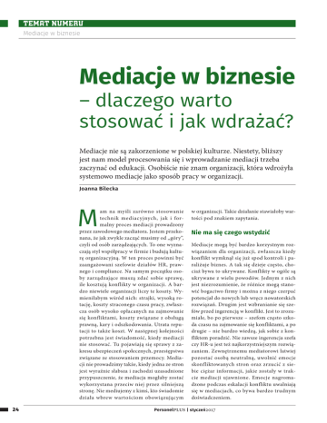 TEMAT NUMERU Mediacje w biznesie Mediacje w biznesie – dlaczego warto stosować i jak wdrażać? Mediacje nie są zakorzenione w polskiej kulturze. Niestety, bliższy jest nam model procesowania się i wprowadzanie mediacji trzeba zaczynać od edukacji. Osobiście nie znam organizacji, która wdrożyła systemowo mediacje jako sposób pracy w organizacji. Joanna Bilecka M am na myśli zarówno stosowanie technik mediacyjnych, jak i formalny proces mediacji prowadzony przez zawodowego mediatora. Jestem przekonana, że jak zwykle zacząć musimy od „góry”, czyli od osób zarządzających. To one wyznaczają styl współpracy w firmie i budują kulturę organizacyjną. W ten proces powinni być zaangażowani szefowie działów HR, prawnego i compliance. Na samym początku osoby zarządzające muszą zdać sobie sprawę, ile kosztują konflikty w organizacji. A bardzo niewiele organizacji liczy te koszty. Wymieniłabym wśród nich: strajki, wysoką rotację, koszty straconego czasu pracy, zwłaszcza osób wysoko opłacanych na zajmowanie się konfliktami, koszty związane z obsługą prawną, kary i odszkodowania. Utrata reputacji to także koszt. W następnej kolejności potrzebna jest świadomość, kiedy mediacji nie stosować. Tu pojawiają się sprawy z zakresu ubezpieczeń społecznych, przestępstwa związane ze stosowaniem przemocy. Mediacji nie prowadzimy także, kiedy jedna ze stron jest wyraźnie słabsza i zachodzi uzasadnione przypuszczenie, że mediacja mogłaby zostać wykorzystana przeciw niej przez silniejszą stronę. Nie mediujemy z kimś, kto świadomie działa wbrew wartościom obowiązującym 24 w organizacji. Takie działanie stawiałoby wartości pod znakiem zapytania. Nie ma się czego wstydzić Mediacje mogą być bardzo korzystnym rozwiązaniem dla organizacji, zwłaszcza kiedy konflikt wymknął się już spod kontroli i paraliżuje biznes. A tak się dzieje często, chociaż bywa to ukrywane. Konflikty w ogóle są ukrywane z wielu powodów. Jednym z nich jest niezrozumienie, że różnice mogą stanowić bogactwo firmy i można z niego czerpać potencjał do nowych lub wręcz nowatorskich rozwiązań. Drugim jest wzbranianie się szefów przed ingerencją w konflikt. Jest to zrozumiałe, bo po pierwsze – szefom często szkoda czasu na zajmowanie się konfliktami, a po drugie – nie bardzo wiedzą, jak sobie z konfliktem poradzić. Nie zawsze ingerencja szefa czy HR-u jest też najkorzystniejszym rozwiązaniem. Zewnętrznemu mediatorowi łatwiej pozostać osobą neutralną, uwolnić emocje skonfliktowanych stron oraz zrzucić z siebie ciężar informacji, jakie zostały w trakcie mediacji ujawnione. Emocje nagromadzone podczas eskalacji konfliktu uwalniają się w mediacjach, co bywa bardzo trudnym doświadczeniem. Personelplus | styczeń2017 Nastawienie na współpracę Warto przy tym podkreślić, że mediacja nie musi – a wręcz nie powinna – być ostatnią deską ratunku. Jeśli stosujemy techniki mediacyjne na co dzień w pracy, to oczywiście jest duża szansa, że unikniemy eskalacji i rodzące się konflikty zostaną po pierwsze – zauważone, po drugie – skutecznie, to znaczy z zadowoleniem stron i trwale, rozwiązane. Nie zawsze jest potrzebny zawodowy mediator. Wystarczy, żeby ludzie zatrudnieni w firmie znali techniki mediacyjne i mieli świadomość, że zamiast zaciekle bronić swoich stanowisk, lepiej rozmawiać o potrzebach i razem szukać korzystnych rozwiązań. Jeśli do tego dodamy kontekst biznesowy, wspólne cele oraz firmowe wartości i normy, mamy całkiem dużo zasobów, żeby zająć się konfliktem w sposób konstruktywny. Bardzo często konflikty w organizacjach mają swoje podłoże w braku informacji, złej informacji, złej strukturze pracy lub procesu. Zazwyczaj udaje się je rozwiązać dość łatwo. Można także stosować wiele innych sposobów, aby podnosić świadomość oraz umiejętności komunikacyjne i zarządzania potrzebami wśród pracowników, zarówno biznesowymi, jak i osobistymi, np. naukę Nonviolent Communication, coaching czy modną ostatnio naukę empatii. Natomiast jeśli sprawy stanęły już na ostrzu noża i przybrały formę otwartego konfliktu personalnego, lub pomiędzy działami, warto zaprosić mediatora, aby inne osoby z najbliższego otoczenia nie angażowały się w konflikt, aby nie blokować pracy i nie ryzykować utraty reputacji, sprawy w sądzie i tym podobnych konsekwencji. Ach te emocje Kluczowymi umiejętnościami mediatora są radzenie sobie z emocjami skonfliktowanych stron i uczenie stron krok po kroku, jak rozmawiać, żeby wypracować możliwie najlepsze rozwiązanie. Liderzy zarządzają energią ludzi. Czy nie lepiej energię poświęconą na walkę stron skierować na wypracowywanie dobrego rozwiązania? Zamiast patrzeć, jak energia skonfliktowanych stron się marnuje, liderzy mogą podjąć wysiłek, aby ją wykorzystać. Mediacja tym różni się od kompromisu, że w optymalnym przypadku pozwala wypracować rozwiązania dla obu stron lepsze od ich początkowych stanowisk. Po udanej mediacji, poza satysfakcją rzeczową, znacznie wyższa niż w kompromisie jest satysfakcja psychologiczna. Dzieje się tak dzięki uświadomieniu sobie rzeczywistych potrzeb i pracy obu stron nad rozwiązaniem satysfakcjonującym wszystkich uczestników konfliktu. Jest to ogromna zmiana, polegająca na traktowaniu – pomimo emocji – drugiej strony jako równoprawnego partnera. Działając w po- Konflikty w organizacjach mają swoje podłoże w braku informacji, złej informacji, złej strukturze pracy lub procesu. Zazwyczaj udaje się je rozwiązać dość łatwo. dobny sposób, liderzy mogą obudzić potencjał tkwiący w organizacji. Warunkiem do tego koniecznym jest przykład idący z góry, z zespołu zarządzającego. Podjęcie mediacji wymaga odwagi i bardziej otwartego komunikowania się. Jeśli liderzy nie wykazują odwagi i otwartości, nie budzą zaufania. Firma Kaiser L