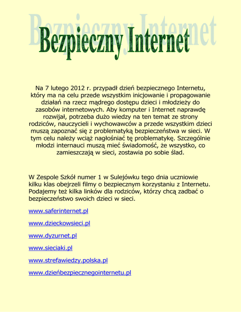 Na 7 lutego 2012 r. przypadł dzień bezpiecznego Internetu, który ma na celu przede wszystkim inicjowanie i propagowanie działań na rzecz mądrego dostępu dzieci i młodzieŜy do zasobów internetowych. Aby komputer i Internet naprawdę rozwijał, potrzeba duŜo wiedzy na ten temat ze strony rodziców, nauczycieli i wychowawców a przede wszystkim dzieci muszą zapoznać się z problematyką bezpieczeństwa w sieci. W tym celu naleŜy wciąŜ nagłośniać tę problematykę. Szczególnie młodzi internauci muszą mieć świadomość, Ŝe wszystko, co zamieszczają w sieci, zostawia po sobie ślad. W Zespole Szkół numer 1 w Sulejówku tego dnia uczniowie kilku klas obejrzeli filmy o bezpiecznym korzystaniu z Internetu. Podajemy teŜ kilka linków dla rodziców, którzy chcą zadbać o bezpieczeństwo swoich dzieci w sieci. www.saferinternet.pl www.dzieckowsieci.pl www.dyzurnet.pl www.sieciaki.pl www.strefawiedzy.polska.pl www.dzieńbezpiecznegointernetu.pl Zasady bezpieczeństwa w Internecie 1. Nie ufaj osobie poznanej przez Internet. Nigdy nie moŜesz być pewien, kim ona naprawdę jest. Mówi, Ŝe ma 8 lat, ale moŜe mieć 40! 2. Włączaj komputer tylko wtedy, gdy ktoś dorosły jest w domu. 3. Nie spotykaj się z osobami poznanymi przez Internet! Zawsze skonsultuj to z rodzicami 4. Gdy coś Cię przestraszy lub zaniepokoi, wyłącz monitor i powiedz o tym dorosłemu. Powiedz teŜ, jeśli szukając informacji, trafiłeś na stronę, która namawia do nienawiści lub do czegoś dziwnego. 5. Nie zdradzaj nikomu swojego imienia ani adresu! Nie mów teŜ, ile masz lat i do jakiej szkoły chodzisz. Nie podawaj numeru telefonu. 6. Wymyśl sobie jakiś fajny nick, czyli internetowy pseudonim. Nie podawaj w nim daty urodzenia ani wieku. Wykorzystaj imię bohatera ulubionego filmu lub słowo z piosenki. UŜyj swojej fantazji. Na pewno wymyślisz coś ciekawego! 7. Pomyśl kilka razy, zanim wyślesz wiadomość, e-mail czy smsa. Kiedy klikniesz „wyślij”, nie moŜna juŜ tego cofnąć. 8. Nie dokuczaj innym. Pamiętaj, Ŝe w Internecie obowiązuje zasada nie uŜywania brzydkich słów. Traktuj innych tak, jak byś chciał, Ŝeby Ciebie traktowano. 9. Długie korzystanie z komputera szkodzi zdrowiu i moŜe być przyczyną wielu innych problemów, np. w szkole. Nie zapominaj o sporcie i innych rozrywkach nie związanych z komputerami i Internetem. 10. Dbaj o swoje hasło jak o największą tajemnicę. Wymyśl takie, które będzie trudne do odgadnięcia. Niech to nie będzie Twoje imię ani imię najlepszej przyjaciółki. 11. Dbaj o bezpieczeństwo swoich przyjaciół. Nie podawaj nikomu ich danych, nie publikuj zdjęć bez ich zgody. Nie wiesz, jaki ktoś zrobi z nich uŜytek, a kiedy je wysyłasz lub umieszczasz w Internecie, nie masz juŜ nad nimi kontroli. 12. Zabezpiecz komputer. UŜywaj dobrego programu antywirusowego, dbaj, by baza wirusów była aktualna. Nie otwieraj e-maili od nieznajomych, nie klikaj na linki podesłane przez obcą osobę – mogą Ci zawirusować komputer! 13. Pamiętaj wszelkie przestępstwa dokonane przez Ciebie za pomocą Internetu (np. plotki na czyjś temat, szantaŜ ) są ścigane przez policję! Opracowanie kl.3a ZS nr 1 Klaudia Cherubińska Dominika Napiórkowska Łukasz Strupiechowski