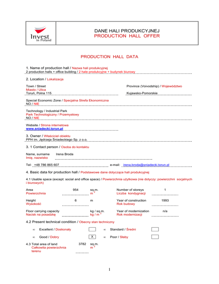 DANE HALI PRODUKCYJNEJ PRODUCTION HALL OFFER PRODUCTION HALL DATA 1. Name of production hall / Nazwa hali produkcyjnej 2 production halls + office building / 2 hale produkcyjne + budynek biurowy 2. Location / Lokalizacja Town / Street Miasto / Ulica Toruń, Polna 115 Province (Voivodship) / Województwo Kujawsko-Pomorskie Special Economic Zone / Specjalna Strefa Ekonomiczna NO / NIE Technology / Industrial Park Park Technologiczny / Przemysłowy NO / NIE Website / Strona internetowa www.sniadecki.torun.pl 3. Owner / Właściciel obiektu PPH im. Jędrzeja Śniadeckiego Sp. z o.o. 3. 1 Contact person / Osoba do kontaktu Name, surname Imię, nazwisko Irena Broda Tel: +48 786 865 607 e-mail: [email protected] 4. Basic data for production hall / Podstawowe dane dotyczące hali produkcyjnej 4.1 Usable space (except: social and office space) / Powierzchnia użytkowa (nie dotyczy: powierzchni socjalnych i biurowych) Area Powierzchnia Height Wysokość 954 6 Floor carrying capacity Nacisk na posadzkę sq.m. 2 m Number of storeys Liczba kondygnacji 1 m Year of construction Rok budowy 1993 kg / sq.m. 2 kg / m Year of modernization Rok modernizacji 4.2 Present technical condition / Obecny stan techniczny • Excellent / Doskonały • Good / Dobry 4.3 Total area of land Całkowita powierzchnia terenu X 3782 • Standard / Średni • Poor / Słaby sq.m. 2 m 1 n/a 5. Transport link / Połączenia transportowe • Nearest motorway / National road Najbliższa droga szybkiego ruchu / krajowa [km] Motoway: A1, 5 km; National Roads: DK 91, 2 km, DK 15, 3 km; DK 80, 4 km; DK 10, 4 km • Nearest voivodship city Najbliższe miasto wojewódzkie [km] Toruń, 0 km; Bydgoszcz, 50 km • Nearest international airport Najbliższe lotnisko międzynarodowe [km] Bydgoszcz, 60 km 6. Infrastructure / Infrastruktura • Power / Elektryczność X • Sewage system / Kanalizacja X • Water / Woda X • Access road for trucks / Dojazd dla ciężarówek X • Gas / Gaz X • Overhead cranes / Suwnice • Heating / Ogrzewanie X • Railway siding / Bocznica 7. Terms of acquisition / Warunki nabycia • Ownership / Własność • Perpetual usufruct / Użytkowanie wieczyste • Lease / Wynajem X 3.000.000,00 7.1 Price in PLN, including hall and land PLN Cena w pln, hali i działki 8. Additional information / Dodatkowe informacje The price above includes halls, office building and land. The price is negotiable. The office building has 3 storeys having total 693 sq.m. / Powyższa cena dotyczy całej nieruchomości, tzn. hal, budynku biurowego i działki. Cena do negocjacji. 2 Budynek biurowy ma 3 kondygnacje o łącznej powierzchni 693 m Date of the offer Data przygotowania oferty 17.10.2014 2