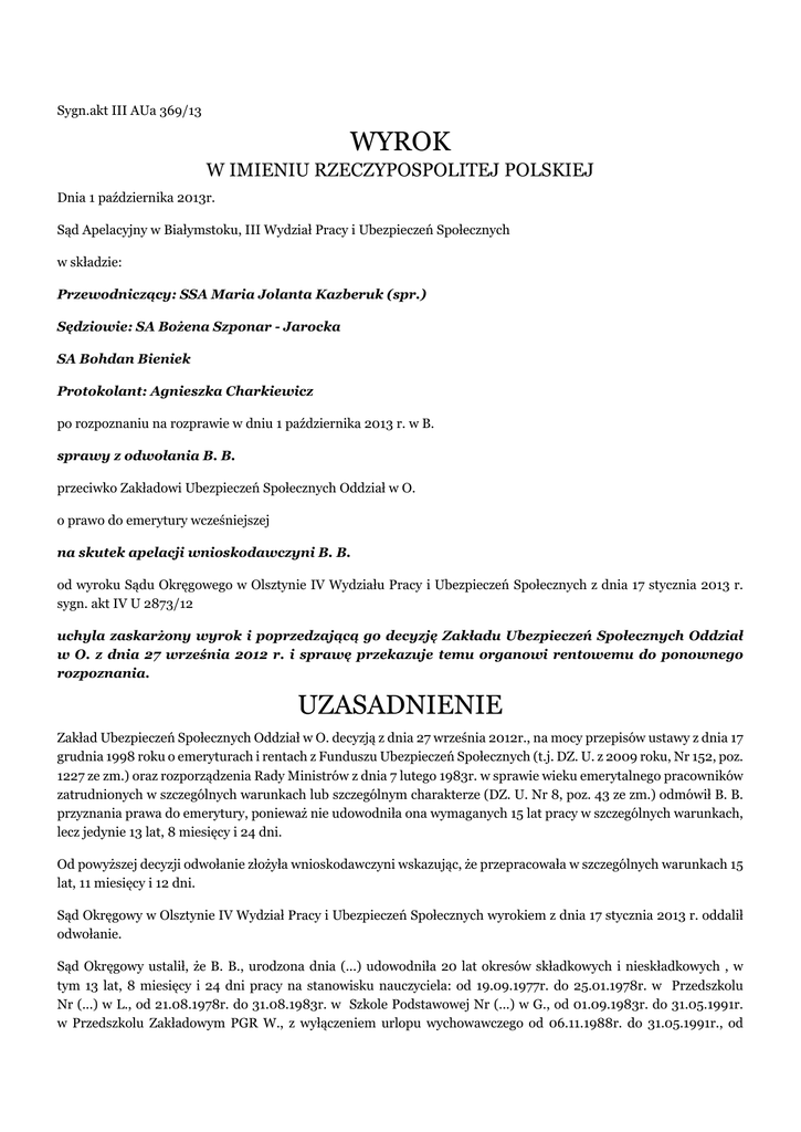 Sygn.akt III AUa 369/13 WYROK W IMIENIU RZECZYPOSPOLITEJ POLSKIEJ Dnia 1 października 2013r. Sąd Apelacyjny w Białymstoku, III Wydział Pracy i Ubezpieczeń Społecznych w składzie: Przewodniczący: SSA Maria Jolanta Kazberuk (spr.) Sędziowie: SA Bożena Szponar - Jarocka SA Bohdan Bieniek Protokolant: Agnieszka Charkiewicz po rozpoznaniu na rozprawie w dniu 1 października 2013 r. w B. sprawy z odwołania B. B. przeciwko Zakładowi Ubezpieczeń Społecznych Oddział w O. o prawo do emerytury wcześniejszej na skutek apelacji wnioskodawczyni B. B. od wyroku Sądu Okręgowego w Olsztynie IV Wydziału Pracy i Ubezpieczeń Społecznych z dnia 17 stycznia 2013 r. sygn. akt IV U 2873/12 uchyla zaskarżony wyrok i poprzedzającą go decyzję Zakładu Ubezpieczeń Społecznych Oddział w O. z dnia 27 września 2012 r. i sprawę przekazuje temu organowi rentowemu do ponownego rozpoznania. UZASADNIENIE Zakład Ubezpieczeń Społecznych Oddział w O. decyzją z dnia 27 września 2012r., na mocy przepisów ustawy z dnia 17 grudnia 1998 roku o emeryturach i rentach z Funduszu Ubezpieczeń Społecznych (t.j. DZ. U. z 2009 roku, Nr 152, poz. 1227 ze zm.) oraz rozporządzenia Rady Ministrów z dnia 7 lutego 1983r. w sprawie wieku emerytalnego pracowników zatrudnionych w szczególnych warunkach lub szczególnym charakterze (DZ. U. Nr 8, poz. 43 ze zm.) odmówił B. B. przyznania prawa do emerytury, ponieważ nie udowodniła ona wymaganych 15 lat pracy w szczególnych warunkach, lecz jedynie 13 lat, 8 miesięcy i 24 dni. Od powyższej decyzji odwołanie złożyła wnioskodawczyni wskazując, że przepracowała w szczególnych warunkach 15 lat, 11 miesięcy i 12 dni. Sąd Okręgowy w Olsztynie IV Wydział Pracy i Ubezpieczeń Społecznych wyrokiem z dnia 17 stycznia 2013 r. oddalił odwołanie. Sąd Okręgowy ustalił, że B. B., urodzona dnia (...) udowodniła 20 lat okresów składkowych i nieskładkowych , w tym 13 lat, 8 miesięcy i 24 dni pracy na stanowisku nauczyciela: od 19.09.1977r. do 25.01.1978r. w Przedszkolu Nr (...) w L., od 21.08.1978r. do 31.08.1983r. w Szkole Podstawowej Nr (...) w G., od 01.09.1983r. do 31.05.1991r. w Przedszkolu Zakładowym PGR W., z wyłączeniem urlopu wychowawczego od 06.11.1988r. do 31.05.1991r., od 22.02.1993r. do 02.08.1993r. w Szkole Podstawowej Nr (...) w G. oraz z wyłączeniem okresu pobierania świadczeń w razie choroby i macierzyństwa: 26-28.05., 31.05.-01.06., 7-12.07., 13-15.07.1993r., od 1.09.1993r. do 15.10.1993r. oraz od 22.03.1994r. do 18.07.1994r. w Szkole Podstawowej Nr (...) w G. oraz od 2.09.1996r. do 31.12.1998r. w Przedszkolu Samorządowym w W.. Zdaniem Sądu pierwszej instancji ZUS prawidłowo ustalił powyższe okresy, co potwierdziły akta osobowe skarżącej ze Szkół Podstawowych: Nr 1 i Nr 2 w G. (k.37), z Agencji Nieruchomości Rolnych Oddział w O. (k. 35), z Przedszkola Samorządowego w W. (k. 40) oraz akta ZUS. Były one także zgodne z wykazem pracy nauczycielskiej, sporządzonym przez skarżącą, w którym nie uwzględniła ona jednak okresu urlopu wychowawczego od 6.11.1988r. do 31.05.1991r. w trakcie zatrudnienia w Przedszkolu Zakładowym PGR W., w związku z urodzeniem córek: D. S. w dniu 25.05.1988r. i A. W. w dniu 17.08.1989r. Sąd podkreślił, że okres urlopu wychowawczego to okres zawieszenia wzajemnych praw i obowiązków stron stosunku pracy i okres niewykonywania pracy z powodu opieki nad dzieckiem, w rozumieniu art. 7 pkt 5 ustawy z dnia 17 grudnia 1998r. (okres nieskładkowy - do dnia 31 grudnia 1998r.). Stąd należało go odliczyć od stażu pracy w warunkach szczególnych, wskazanego przez skarżącą, przez co wyniósł on: 13 lat 9 miesięcy i 23 dni. Następnie Sąd pierwszej instancji wskazał na dwa obowiązujące systemy emerytalne nauczycieli: pierwszy związany z wykonywaniem pracy w szczególnym charakterze określonej w przepisach rozporządzenia Rady Ministrów z dnia 7 lutego 1983r. w sprawie wieku emerytalnego pracowników zatrudnionych w szczególnych warunkach lub w szczególnym charakterze (Dz. U. Nr 8, poz. 43 ze zm.) w związku z art. 32 i 46 ustawy z dnia 17 grudnia 1998r. oraz drugi, w którym warunki emerytalne regulowane są przepisami odrębnymi. Po czym zweryfikował sytuację wnioskodawczyni pod kątem warunków przyznania prawa do emerytury, o których mowa w przepisach rozporządzenia Rady Ministrów z dnia 7 lutego 1983r. w sprawie wieku emerytalnego pracowników zatrudnionych w szczególnych warunkach lub w szczególnym charakterze ( Dz. U. Nr 8, poz. 43 ze zm.). W rezultacie Sąd stwierdził, że wykazany przez skarżącą okres wykonywania pracy nauczycielskiej był niewystarczający do nabycia prawa do wcześniejszej emerytury. Wymagany był bowiem 15-letni staż pracy w szczególnych warunkach lub w szczególnym charakterze, wykonywanej stale i w pełnym wymiarze czasu pracy obowiązującym na danym stanowisku, zaś z materiału dowodowego zebranego w sprawie wynikało, że wnioskodawczyni w takich warunkach nie była zatrudniona w wymaganym okresie. Z tych względów nie spełniła przesłanki 15-letniego stażu pracy w szczególnym charakterze w pełnym wymiarze czasu pracy i nie nabyła prawa do wcześniejszej emerytury z tytułu tej pracy, w świetle art. 32 i art. 46 ustawy z dnia 17 grudnia 1998 r. o emeryturach i rentach z FUS. Apelację od powyższego wyroku wniosła B. B.. Wskazała w niej, iż ZUS rozważał jej sprawę, stosując tylko art. 32 ust. 4 ustawy emerytalnej. Wniosła o uwzględnienie także art. 32 ust. 5 tej ustawy, gwarantującego nabywanie prawa do emerytury bez względu na wiek, w warunkach określonych w art. 88 ustawy z dnia 26 stycznia 1982r. Karta Nauczyciela. Sąd Apelacyjny zważył, co następuje: Apelacja jest zasadna, gdyż uchybienia w niej wskazane uzasadniają uchylenie zaskarżonego wyroku i poprzedzającej go decyzji ZUS z dnia 27 września 2012r. i przekazanie sprawy do ponownego rozpoznania Zakładowi Ubezpieczeń Społecznych. Nale