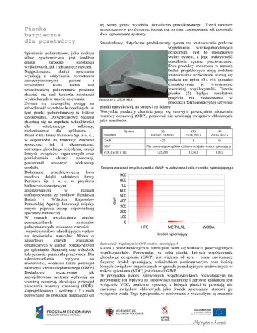 Spienianie poliuretanów, jako reakcja silnie egzotermiczna, jest źródłem emisji zarówno substancji wyjściowych, jak i ich zanieczyszczeń. Najgroźniejsze skutki spieniania wynikają z oddychania powietrzem zanieczyszczonymi parami i aerozolami. Istota badań nad szkodliwością poliuretanów powinna skupiać się nad kontrolą substancji wydzielanych w trakcie spieniania. Zwraca się szczególną uwagę na szkodliwość wyrobów budowlanych, w tym pianki poliuretanowej w trakcie użytkowania. Dotychczasowe badania skupiają się na aspekcie szkodliwości dla ostatecznego odbiorcy, niekoniecznie dla aplikatora. Dział R&D firmy Purinova Sp. z o. o., w odpowiedzi na tendencje zarówno społeczne, jak i ekonomiczne, dotyczące globalnego ocieplenia, emisji lotnych związków organicznych oraz powiększania dziury ozonowej, postanowił stworzyć adekwatny produkt. Dokonanie przedsięwzięcia było możliwe dzięki udziałowi firmy Purinova Sp. z o. o. w projekcie badawczo-rozwojowym, zrealizowanym w ramach dofinansowania ze środków Funduszu Badań i Wdrożeń KujawskoPomorskiej Agencji Innowacji między innymi poprzez zakup odpowiedniej aparatury badawczej. W ramach uwydatnienia atutów poszczególnych systemów poliuretanowych, wskazano wartości współczynników określających wpływ na środowisko naturalne. Mowa o zawartości lotnych związków organicznych w gazach poreakcyjnych po spienianiu. Stanowią one wskaźnik toksyczności pianki dla przetwórcy. Dla odzwierciedlenia wpływu na środowisko, oceniono także potencjał tworzenia efektu cieplarnianego (GWP) Dodatkowo oszacowano jak zaprojektowane systemy wpływają na warstwę ozonową, określając potencjał niszczenia warstwy ozonowej (ODP). Zaprojektowano 3 systemy i 2 z nich porównano do produktu należącego do tej samej grupy wyrobów, dotychczas produkowanego. Trzeci również umieszczono w porównaniu, jednak ma on inne zastosowanie niż pozostałe dwa opracowane systemy. Standardowy, dotychczas produkowany system ma zastosowanie podczas wypełniania wielkogabarytowych przestrzeni. Jest to stosunkowo wolny system, a jego reaktywność umożliwia ręczne przetwarzanie. Dwa produkty stworzone w ramach badań projektowych mają podobne zastosowanie aczkolwiek różnią się reakcją na ogień (3), (4), ponadto charakteryzują je wymienione wcześniej współczynniki. Trzecia pianka (2) będąca rezultatem projektu ma zastosowanie w Ilustracja 1: 25/35 NE/G produkcji termoizolacyjnej sztywnej pianki natryskowej, na stropy i na ściany. Wszystkie produkty charakteryzują się zerowym potencjałem niszczenia warstwy ozonowej (ODP), ponieważ nie zawierają związków chlorowych jako poroforów. System Parametr GWP ODP (2) 03/35N ECO/03 (3) 25/40 NE/T (4) 25/35 NE/G <25 0 0 Nie zawierają związków chlorowych jako środek spieniający 3 VOC [μ/m z 1g] 122,289 11,503 1,022 Zmiana wartości współczynnika GWP w zależności od czynnika spieniającego GWP Pianka bezpieczna dla przetwórcy 900 800 700 600 500 400 300 200 100 0 HFC METYLAL WODA Środek spieniający Ilustracja 2: Współczynniki GWP środków spieniających Każda z przedstawionych w tabeli pian różni się wartością poszczególnych współczynników. Porównując ze sobą pianki, których współczynnik globalnego ocieplenia (GWP) jest większy od zera – piany zawierające fizyczny środek spieniający, wskaźnikiem porównawczym poza ilością lotnych związków organicznych w gazach poreakcyjnych emitowanych w trakcie spieniania (VOC) jest również GWP. W przypadku pianek zalewowych współczynnikiem pozwalającym na porównanie ich wpływu na środowisko naturalne i zdrowie aplikatora jest wyłącznie VOC, ponieważ systemy, z których pianki te powstają nie zawierają związków chlorowych jako środek spieniający, stanowi go wyłącznie woda. Tego typu pianki, w porównaniu z pozostałymi są znacznie Zawartość [μ/m3 z 1g] bezpieczniejsze w aspekcie 03/35N/ECO/03 25/40 NE/T 25/35 NE/G środowiskowym. Ze względu na fakt, Parametr/System że żadna z pian nie zawiera jako środek Start [s] 5 25 25 spieniający związków chlorowych, 13 160 100 wyklucza się wartościowanie parametru Żelowanie [s] ODP. Gęstość pozorna 28-29 39-40 34-35 Współczynnik globalnego ocieplenia, [kg/m3] określający ilościowo wpływ danej substancji na efekt cieplarniany, jest Wytrzymałość na 217,2 165,7 122,8 tabelaryzowany. Między innymi ściskanie przy gęstości 35kg/m3 [mPas] Międzynarodowy Zespół ds. zmian klimatu ocenił wpływ szeregu Klasa palności F F E substancji na zjawisko podwyższania temperatury naszej planety, Współczynnik 22,561 26,158 27,833 powodowane obecnością gazów przewodzenia ciepła [mW/mK] cieplarnianych w atmosferze. Na podstawie tej oceny nadano wartości Tabela 1: Tabela porównawcza pian poliuretanowych powstałych w wyniku projektu. GWP dla szeregu substancji. Jego wartość zależy głównie od stopnia absorpcji promieniowania Zawartość lotnych związków organicznych w gazach poreakcyjnych podczerwonego przez klasyfikowaną 140 substancję chemiczną oraz czasu życia 120 tej substancji w atmosferze. 100 Piana zawierająca Metylal, ma prawie 80 32 razy niższą wartość GWP, niż piana 60 ze środkiem spieniającym typu HFC, co 40 oznacza że w ciągu 20 lat od 20 wprowadzenia go do atmosfery 0 zatrzymałby 32 razy mniejszą ilość 03/35N ECO/03 25/40 NE/T 25/35 NE/G ciepła. Niestety zastąpienie HFC Metylalem, podnosi znacząco ilość System gazów poreakcyjnych wydzielających się z piany. Wartość współczynnika Ilustracja 3: VOC utworzonych systemów poliuretanowych VOC wzrasta o 88 μ/m3 z 1g. Najlepszym możliwym rozwiązaniem jest zastąpienie fizycznych środków spieniających wodą. W tym przypadku obniża się współczynnik GWP do zera. Należy jednak wziąć pod uwagę preferencje potencjalnych klientów, dla części z nich istotnym aspektem zakupu pianki będą własności izolacyjne. P