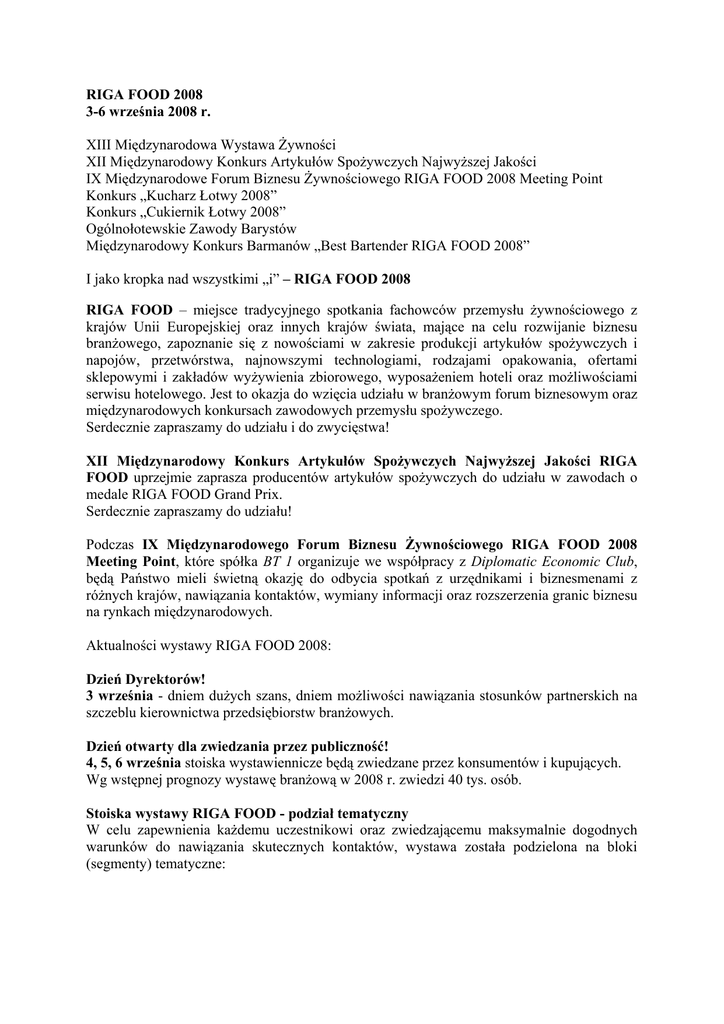 RIGA FOOD 2008 3-6 września 2008 r. XIII Międzynarodowa Wystawa Żywności XII Międzynarodowy Konkurs Artykułów Spożywczych Najwyższej Jakości IX Międzynarodowe Forum Biznesu Żywnościowego RIGA FOOD 2008 Meeting Point Konkurs „Kucharz Łotwy 2008” Konkurs „Cukiernik Łotwy 2008” Ogólnołotewskie Zawody Barystów Międzynarodowy Konkurs Barmanów „Best Bartender RIGA FOOD 2008” I jako kropka nad wszystkimi „i” – RIGA FOOD 2008 RIGA FOOD – miejsce tradycyjnego spotkania fachowców przemysłu żywnościowego z krajów Unii Europejskiej oraz innych krajów świata, mające na celu rozwijanie biznesu branżowego, zapoznanie się z nowościami w zakresie produkcji artykułów spożywczych i napojów, przetwórstwa, najnowszymi technologiami, rodzajami opakowania, ofertami sklepowymi i zakładów wyżywienia zbiorowego, wyposażeniem hoteli oraz możliwościami serwisu hotelowego. Jest to okazja do wzięcia udziału w branżowym forum biznesowym oraz międzynarodowych konkursach zawodowych przemysłu spożywczego. Serdecznie zapraszamy do udziału i do zwycięstwa! XII Międzynarodowy Konkurs Artykułów Spożywczych Najwyższej Jakości RIGA FOOD uprzejmie zaprasza producentów artykułów spożywczych do udziału w zawodach o medale RIGA FOOD Grand Prix. Serdecznie zapraszamy do udziału! Podczas IX Międzynarodowego Forum Biznesu Żywnościowego RIGA FOOD 2008 Meeting Point, które spółka BT 1 organizuje we współpracy z Diplomatic Economic Club, będą Państwo mieli świetną okazję do odbycia spotkań z urzędnikami i biznesmenami z różnych krajów, nawiązania kontaktów, wymiany informacji oraz rozszerzenia granic biznesu na rynkach międzynarodowych. Aktualności wystawy RIGA FOOD 2008: Dzień Dyrektorów! 3 września - dniem dużych szans, dniem możliwości nawiązania stosunków partnerskich na szczeblu kierownictwa przedsiębiorstw branżowych. Dzień otwarty dla zwiedzania przez publiczność! 4, 5, 6 września stoiska wystawiennicze będą zwiedzane przez konsumentów i kupujących. Wg wstępnej prognozy wystawę branżową w 2008 r. zwiedzi 40 tys. osób. Stoiska wystawy RIGA FOOD - podział tematyczny W celu zapewnienia każdemu uczestnikowi oraz zwiedzającemu maksymalnie dogodnych warunków do nawiązania skutecznych kontaktów, wystawa została podzielona na bloki (segmenty) tematyczne: RIGA FOOD Regular Expo Ogólne artykuły spożywcze – mięso, mleko, ryba, chleb, wyroby cukiernicze, mrożonki. świeże produkty, owoce i warzywa, garmażeria. Odzież robocza. RIGA FOOD Drinks Napoje alkoholowe i bezalkoholowe, piwa, wina, kawy, herbaty. W tym segmencie planujemy międzynarodowe konkursy napojów alkoholowych z udziałem międzynarodowych jurorów. Zawodowa degustacja napojów. RIGA FOOG Gourmet Delikatesy i napoje wytworne. RIGA FOOD Speciality Żywność zdrowa i funkcjonalna, produkty koszerne, halalne, wegetariańskie, bio żywność. RIGA FOOD Packing Tech Opakowanie, wyposażenie opakunkowe, urządzenia i surowce do produkcji materiałów opakunkowych. Etykiety. Znakowanie. RIGA FOOD Technology and Ingredients Wyposażenie do przetwórstwa i produkcji artykułów żywnościowych, surowce, przyprawy, dodatki żywnościowe. Przemysłowa automatyzacja w przemyśle żywnościowym. RIGA FOOD Catering and Retail Tech Wyposażenie i sprzęt dla zakładów wyżywienia zbiorowego oraz handlu. RIGA FOOD Hotel Expo Wyposażenie i sprzęt dla hoteli, meble, tekstylia, wzornictwo nakryć stołowych, dodatki, akcesoria. RIGA FOOD Clean Expo Urządzenia i środki do dezynfekcji. Wyposażenie laboratoryjne. Ekologia w przemyśle żywnościowym i wyżywieniu zbiorowym.