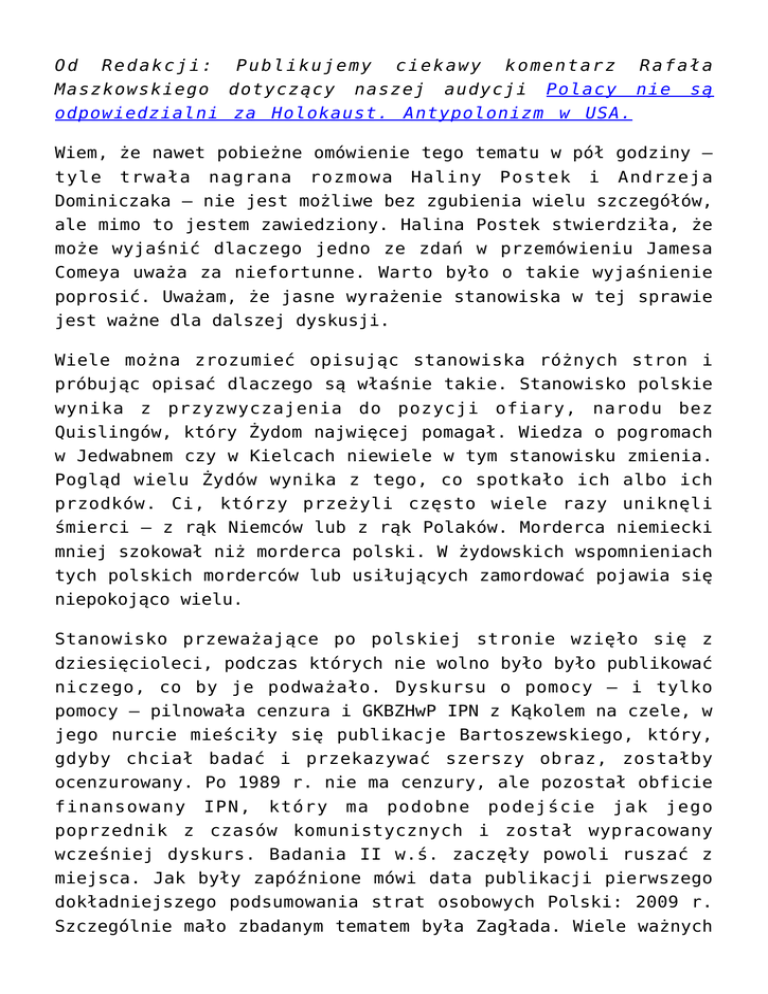 Od Redakcji: Publikujemy ciekawy komentarz Rafała Maszkowskiego dotyczący naszej audycji Polacy nie są odpowiedzialni za Holokaust. Antypolonizm w USA. Wiem, że nawet pobieżne omówienie tego tematu w pół godziny – tyle trwała nagrana rozmowa Haliny Postek i Andrzeja Dominiczaka – nie jest możliwe bez zgubienia wielu szczegółów, ale mimo to jestem zawiedziony. Halina Postek stwierdziła, że może wyjaśnić dlaczego jedno ze zdań w przemówieniu Jamesa Comeya uważa za niefortunne. Warto było o takie wyjaśnienie poprosić. Uważam, że jasne wyrażenie stanowiska w tej sprawie jest ważne dla dalszej dyskusji. Wiele można zrozumieć opisując stanowiska różnych stron i próbując opisać dlaczego są właśnie takie. Stanowisko polskie wynika z przyzwyczajenia do pozycji ofiary, narodu bez Quislingów, który Żydom najwięcej pomagał. Wiedza o pogromach w Jedwabnem czy w Kielcach niewiele w tym stanowisku zmienia. Pogląd wielu Żydów wynika z tego, co spotkało ich albo ich przodków. Ci, którzy przeżyli często wiele razy uniknęli śmierci – z rąk Niemców lub z rąk Polaków. Morderca niemiecki mniej szokował niż morderca polski. W żydowskich wspomnieniach tych polskich morderców lub usiłujących zamordować pojawia się niepokojąco wielu. Stanowisko przeważające po polskiej stronie wzięło się z dziesięcioleci, podczas których nie wolno było było publikować niczego, co by je podważało. Dyskursu o pomocy – i tylko pomocy – pilnowała cenzura i GKBZHwP IPN z Kąkolem na czele, w jego nurcie mieściły się publikacje Bartoszewskiego, który, gdyby chciał badać i przekazywać szerszy obraz, zostałby ocenzurowany. Po 1989 r. nie ma cenzury, ale pozostał obficie finansowany IPN, który ma podobne podejście jak jego poprzednik z czasów komunistycznych i został wypracowany wcześniej dyskurs. Badania II w.ś. zaczęły powoli ruszać z miejsca. Jak były zapóźnione mówi data publikacji pierwszego dokładniejszego podsumowania strat osobowych Polski: 2009 r. Szczególnie mało zbadanym tematem była Zagłada. Wiele ważnych kwestii z nim związanych zostało opisanych też dopiero w tym okresie. Wiedza o wojennej kolaboracji jest bardzo nikła, rzadko w ogóle wymieniana jest wprost nazwa największej kolaborującej formacji – PPGG. Jeszcze mniej wiadomo o zabijaniu Żydów przez Polaków. Pojawienie się „Sąsiadów” było wielkim zaskoczeniem. Praca ta jest już w zasadzie przyswojona, ale zapewne nie każdy zdaje sobie sprawę, że 1941 r. było kilkadziesiąt takich pogromów. Pogrom kielecki, chociaż kiedyś niechętnie widziany przez cenzurę, jest lepiej znany, ale też rzadko wiedza ta obejmuje pozostałe setki żydowskich ofiar powojennych zabójstw. To wszystko razem – mniej lub bardziej masowe mordy z 1941 i 1945-8 r. to w gruncie rzeczy niewiele, w sumie chyba kilka tysięcy ofiar i jakkolwiek te mniej liczne powojenne ofiary bolą bardziej, jest to znacznie mniej niż liczba cywilnych Ukraińców zabitych przez Polaków w czasie wojny (kilkanaście tysięcy, przez AK i BCh). Mając taką świadomość można czuć dyskomfort kiedy ktoś mówi w jednym zdaniu o niemieckich i polskich mordercach. Ale to było niezupełnie tak. W pierwszych dwóch fazach Zagłady – uwięzieniu w gettach, które skutkowało śmiercią z głodu ok. 100 osób, a potem przemysłowym mordowaniu sprawcami byli prawie wyłącznie Niemcy, Polacy mieli mało do powiedzenia. Po II fazie Zagłady zostało w Polsce na wolności ok. 100-200 tys. Żydów. Trudno dokładniej policzyć ilu z nich zabili Niemcy, a ilu Polacy – PPGG czy OSP, które były podporządkowane Niemcom, ale często działały na własną rękę, niezależne od Niemców NSZ, AK, BCh, AL i inne formacje zbrojne, czy wreszcie osoby prywatne. Ważne jest również to, że pomaganie Żydom i ich zabijanie często było powiązane. Większość Żydów ukrywała się płacąc znaczące kwoty (ci którzy ich nie mieli, rzadziej podejmowali próby uratowania się). Z tej grupy mało kto się uratował. Mniejszość Żydów była ukrywana po kosztach lub bezpłatnie. Z tej grupy przeżyło ok. 50%, liczebnie znacznie więcej niż w przypadku pierwszej grupy. Znaczna część z kilkudziesięciu tysięcy powojennych procesów kolaborantów dotyczyła odpowiedzialności za mordowanie lub doprowadzenie do śmierci Żydów. Na podstawie tych akt naukowcy szacują na razie liczbę ofiar bardzo zgrubnie na „co najmniej kilkadziesiąt tysięcy”. Oczywiście trudno porównywać te ok. 20 tys. uratowanych (i może jeszcze 10 lub więcej tysięcy ratowanych nieskutecznie, zwłaszcza w Warszawie, z powodu powstania w 1944 r.) z 50 czy 100 tysiącami zamordowanych. Do ratowania trzeba było mieć odwagę i zasoby, zabijanie było znacznie łatwiejsze. Ale z drugiej strony, poza obławami, do których zmuszane były przez Niemców PPGG i OSP, pod groźbą zabicia zakładników, nie było obowiązkowe. Wieś, która wspólnie ukrywała Żyda jest wspomniana w klasycznej pracy, której autorką jest A. Cała. Częściej jednak intensywność mordowania była na tyle duża, że i podejrzani Polacy mogli zostać zabici z rozpędu. Tak skończyli dwaj inżynierowie, którzy wybrali się na niedzielę na wieś – historia została opisana w podziemnej prasie. Liczby ratowanych i ratujących mają swoją historię. W różnych publikacjach, zwłaszcza ta druga, rosła czasem do milionów. Zawyżona liczba uratowanych, mnożona przez 2, 5, 10… Myślę jednak, że liczba ratujących nie była znacznie większa od liczby ratowanych. Widziałem nawet jakieś cząstkowe dane, w dodatku podawane za IPN-em, w których ten współczynnik był mniejszy od 1. Czasem jedna osoba ratowała całą rodzinę, a bywało, że i dziesiątki osób, czasem wiele osób pomagało jednej, chociaż ci skłonni do pomocy chwilowej pewnie w wielu przypadkach nie ograniczali się pomocy tylko jednej osobie. Równi