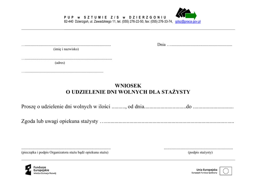 P U P w S Z T U M I E Z / S w D Z I E R Z G O N I U 82-440 Dzierzgoń, ul. Zawadzkiego 11, tel. (055) 276-22-50, fax: (055) 276-33-74, [email protected] …............................................................................ (imię i nazwisko) Dnia …...................................................... …............................................................................. (adres) …................................................................................ WNIOSEK O UDZIELENIE DNI WOLNYCH DLA STAŻYSTY Proszę o udzielenie dni wolnych w ilości .........., od dnia...............................do .............................. Zgoda lub uwagi opiekuna stażysty …............................................................................................... ............................................................................... (pieczątka i podpis Organizatora stażu bądź opiekuna stażu) ............................................................. (podpis stażysty) P U P w S Z T U M I E Z / S w D Z I E R Z G O N I U 82-440 Dzierzgoń, ul. Zawadzkiego 11, tel. (055) 276-22-50, fax: (055) 276-33-74, [email protected] …............................................................................ (imię i nazwisko) Dnia …...................................................... …............................................................................. (adres) …................................................................................ WNIOSEK O UDZIELENIE DNI WOLNYCH DLA STAŻYSTY Proszę o udzielenie dni wolnych w ilości .........., od dnia...............................do .............................. Zgoda lub uwagi opiekuna stażysty …............................................................................................... ............................................................................... (pieczątka i podpis Organizatora stażu bądź opiekuna stażu) ............................................................. (podpis stażysty) P U P w S Z T U M I E Z / S w D Z I E R Z G O N I U 82-440 Dzierzgoń, ul. Zawadzkiego 11, tel. (055) 276-22-50, fax: (055) 276-33-74, [email protected] …............................................................................ (imię i nazwisko) Dnia …...................................................... …............................................................................. (adres) …................................................................................ WNIOSEK O UDZIELENIE DNI WOLNYCH DLA STAŻYSTY Proszę o udzielenie dni wolnych w ilości .........., od dnia...............................do .............................. Zgoda lub uwagi opiekuna stażysty …............................................................................................... ............................................................................... (pieczątka i podpis Organizatora stażu bądź opiekuna stażu) ............................................................. (podpis stażysty) P U P w S Z T U M I E Z / S w D Z I E R Z G O N I U 82-440 Dzierzgoń, ul. Zawadzkiego 11, tel. (055) 276-22-50, fax: (055) 276-33-74, [email protected] …............................................................................ (imię i nazwisko) Dnia …...................................................... …............................................................................. (adres) …................................................................................ WNIOSEK O UDZIELENIE DNI WOLNYCH DLA STAŻYSTY Proszę o udzielenie dni wolnych w ilości .........., od dnia...............................do .............................. Zgoda lub uwagi opiekuna stażysty …............................................................................................... ............................................................................... (pieczątka i podpis Organizatora stażu bądź opiekuna stażu) ............................................................. (podpis stażysty)
