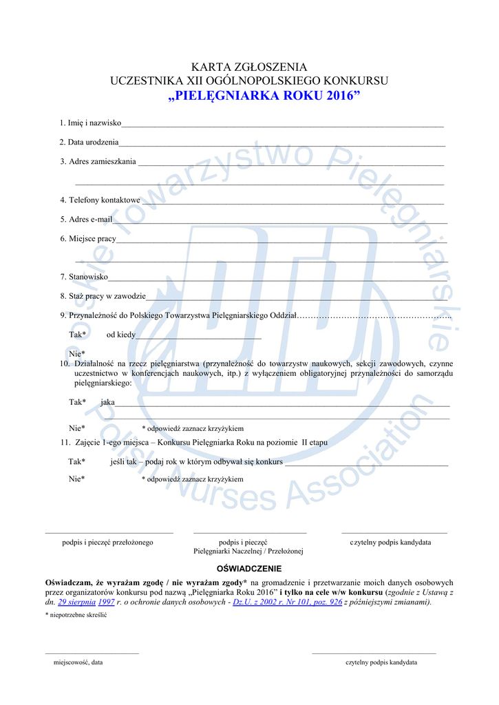 KARTA ZGŁOSZENIA UCZESTNIKA XII OGÓLNOPOLSKIEGO KONKURSU „PIELĘGNIARKA ROKU 2016” 1. Imię i nazwisko_____________________________________________________________________________ 2. Data urodzenia______________________________________________________________________________ 3. Adres zamieszkania _________________________________________________________________________ ________________________________________________________________________________________ 4. Telefony kontaktowe ________________________________________________________________________ 5. Adres e-mail________________________________________________________________________________ 6. Miejsce pracy_______________________________________________________________________________ _________________________________________________________________________________________ 7. Stanowisko_________________________________________________________________________________ 8. Staż pracy w zawodzie________________________________________________________________________ 9. Przynależność do Polskiego Towarzystwa Pielęgniarskiego Oddział……………………………………………….. Tak* od kiedy______________________________ Nie* 10. Działalność na rzecz pielęgniarstwa (przynależność do towarzystw naukowych, sekcji zawodowych, czynne uczestnictwo w konferencjach naukowych, itp.) z wyłączeniem obligatoryjnej przynależności do samorządu pielęgniarskiego: Tak* jaka________________________________________________________________________________ _______________________________________________________________________________________________________ * odpowiedź zaznacz krzyżykiem Nie* 11. Zajęcie 1-ego miejsca – Konkursu Pielęgniarka Roku na poziomie II etapu Tak* jeśli tak – podaj rok w którym odbywał się konkurs _______________________________________ Nie* * odpowiedź zaznacz krzyżykiem __________________________________ ______________________________ podpis i pieczęć przełożonego podpis i pieczęć Pielęgniarki Naczelnej / Przełożonej ____________________________ czytelny podpis kandydata OŚWIADCZENIE Oświadczam, że wyrażam zgodę / nie wyrażam zgody* na gromadzenie i przetwarzanie moich danych osobowych przez organizatorów konkursu pod nazwą „Pielęgniarka Roku 2016” i tylko na cele w/w konkursu (zgodnie z Ustawą z dn. 29 sierpnia 1997 r. o ochronie danych osobowych - Dz.U. z 2002 r. Nr 101, poz. 926 z późniejszymi zmianami). * niepotrzebne skreślić ____________________________ miejscowość, data _____________________________________ czytelny podpis kandydata