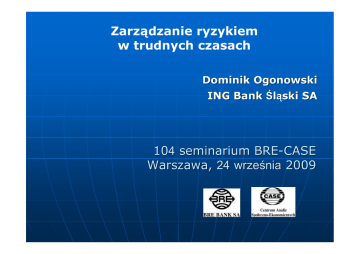 Zarządzanie ryzykiem w trudnych czasach Dominik Ogonowski ING Bank Śląski SA 104 seminarium BRE-CASE Warszawa, 24 września 2009 Ryzyko w banku Kredytowe Operacyjne Rynkowe Reputacyjne Prawne Inne Ryzyko Kredytowe Korporacyjne Rynkowe Detaliczne – Osoby fizyczne: – Hipoteki Kredyty niezabezpieczone takie jak poŜyczki gotówkowe, karty kredytowe i linie w koncie osobistym Małe i średnie firmy Filary detalicznego ryzyka kredytowego Zdolność kredytowa – Wiarygodność kredytowa – – Formuła zdolności kredytowej Historia kredytowa Scoring kredytowy Zabezpieczenie Warunki kredytowania w tym cena kredytu Kryzys a filary ryzyka kredytowego Zdolność kredytowa (1/4) – – – – Zaostrzenie wymagań - niŜsze kwoty kredytu Zwykle max 50% dochodu rozporządzalnego na raty kredytów (w tym juŜ obsługiwane) Weryfikacja zarobków/zatrudnienia Ryzyko utraty pracy – korelacja ze wskaźnikami bezrobocia Kryzys a filary ryzyka kredytowego Wiarygodność kredytowa (2/4) – – – – Historia kredytowa (scoring) – czy i jak będzie przewidywał ryzyko braku spłaty? Regularna walidacja decyzyjnych modeli skoringowych Własna historia kredytowa w porównaniu do historii w innych bankach Punkty odcięcia - weryfikacja Kryzys a filary ryzyka kredytowego Zabezpieczenie (3/4) – – – – Ceny nieruchomości w przypadku nierównowagi popytu i podaŜy Aktualizacja wyceny nieruchomości Cena przy sprzedaŜy wymuszonej Wartość zabezpieczenia – do weryfikacji Kryzys a filary ryzyka kredytowego Warunki kredytowania (4/4) – – – – Cena kredytu w porównaniu do oczekiwanej straty. Czy marŜa pokryje przyszłe ryzyko? Okres kredytowania Kredytowanie inwestycji w budowie Ubezpieczenia kredytu (pomostowe, wysoki wkład własny, od utraty pracy itd.) Kryzys na rynku hipotecznym w USA Określony rynek docelowy – „subprime” Liberalne zasady liczenia zdolności kredytowej (brak weryfikacji zarobków, oświadczenia) Wiarygodność kredytowa – liberalne zasady udzielania (niŜsze punkty odcięcia, zła historia kredytowa w biurach kredytowych) Zabezpieczenie – liberalne zasady wyceny nieruchomości Warunki kredytowania – preferencyjna stopa % przez 2,3 lata później podniesienie marŜy. Rata kredytu po podniesieniu marŜy przewyŜsza zdolność kredytową. Myślenie konsumentów „Skoro ceny nieruchomości rosną, to teraz muszę kupić - bo stracę” Podsumowanie Kryzys ma znaczący wpływ na filary oceny ryzyka kredytowego Zdolność i wiarygodność kredytowa – najwaŜniejsze elementy oceny ryzyka Interes ekonomiczny banku a interes klienta – jak pomóc w przetrwaniu trudnego okresu?