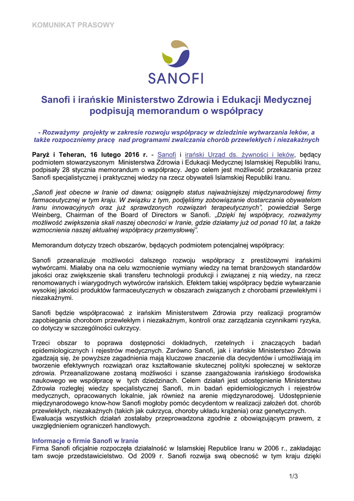 KOMUNIKAT PRASOWY Sanofi i irańskie Ministerstwo Zdrowia i Edukacji Medycznej podpisują memorandum o współpracy - Rozważymy projekty w zakresie rozwoju współpracy w dziedzinie wytwarzania leków, a także rozpoczniemy pracę nad programami zwalczania chorób przewlekłych i niezakaźnych Paryż i Teheran, 16 lutego 2016 r. - Sanofi i irański Urząd ds. żywności i leków, będący podmiotem stowarzyszonym Ministerstwa Zdrowia i Edukacji Medycznej Islamskiej Republiki Iranu, podpisały 28 stycznia memorandum o współpracy. Jego celem jest możliwość przekazania przez Sanofi specjalistycznej i praktycznej wiedzy na rzecz obywateli Islamskiej Republiki Iranu. „Sanofi jest obecne w Iranie od dawna; osiągnęło status najważniejszej międzynarodowej firmy farmaceutycznej w tym kraju. W związku z tym, podjęliśmy zobowiązanie dostarczania obywatelom Iranu innowacyjnych oraz już sprawdzonych rozwiązań terapeutycznych”, powiedział Serge Weinberg, Chairman of the Board of Directors w Sanofi. „Dzięki tej współpracy, rozważymy możliwość zwiększenia skali naszej obecności w Iranie, gdzie działamy już od ponad 10 lat, a także wzmocnienia naszej aktualnej współpracy przemysłowej”. Memorandum dotyczy trzech obszarów, będących podmiotem potencjalnej współpracy: Sanofi przeanalizuje możliwości dalszego rozwoju współpracy z prestiżowymi irańskimi wytwórcami. Miałaby ona na celu wzmocnienie wymiany wiedzy na temat branżowych standardów jakości oraz zwiększenie skali transferu technologii produkcji i związanej z nią wiedzy, na rzecz renomowanych i wiarygodnych wytwórców irańskich. Efektem takiej współpracy będzie wytwarzanie wysokiej jakości produktów farmaceutycznych w obszarach związanych z chorobami przewlekłymi i niezakaźnymi. Sanofi będzie współpracować z irańskim Ministerstwem Zdrowia przy realizacji programów zapobiegania chorobom przewlekłym i niezakaźnym, kontroli oraz zarządzania czynnikami ryzyka, co dotyczy w szczególności cukrzycy. Trzeci obszar to poprawa dostępności dokładnych, rzetelnych i znaczących badań epidemiologicznych i rejestrów medycznych. Zarówno Sanofi, jak i irańskie Ministerstwo Zdrowia zgadzają się, że powyższe zagadnienia mają kluczowe znaczenie dla decydentów i umożliwiają im tworzenie efektywnych rozwiązań oraz kształtowanie skutecznej polityki społecznej w sektorze zdrowia. Przeanalizowane zostaną możliwości i szanse zaangażowania irańskiego środowiska naukowego we współpracę w tych dziedzinach. Celem działań jest udostępnienie Ministerstwu Zdrowia rozległej wiedzy specjalistycznej Sanofi, m.in badań epidemiologicznych i rejestrów medycznych, opracowanych lokalnie, jak również na arenie międzynarodowej. Udostępnienie międzynarodowego know-how Sanofi mogłoby pomóc decydentom w realizacji założeń dot. chorób przewlekłych, niezakaźnych (takich jak cukrzyca, choroby układu krążenia) oraz genetycznych. Ewaluacja wszystkich działań zostałaby przeprowadzona zgodnie z obowiązującym prawem, z uwzględnieniem ograniczeń handlowych. Informacje o firmie Sanofi w Iranie Firma Sanofi oficjalnie rozpoczęła działalność w Islamskiej Republice Iranu w 2006 r., zakładając tam swoje przedstawicielstwo. Od 2009 r. Sanofi rozwija swą obecność w tym kraju dzięki 1/3 nawiązaniu współpracy wytwórczej w odniesieniu do niektórych swoich ważnych produktów farmaceutycznych z istotnymi lokalnymi partnerami irańskimi. - W ten sposób firma zaangażowała się w znaczący transfer technologii i wiedzy praktycznej. W rezultacie 55% wolumenu sprzedaży firmy Sanofi na rynku irańskim stanowią produkty wytworzone w tym kraju. Informacje o firmie Sanofi Firma Sanofi, działający na skalę globalną lider sektora farmaceutycznego, zajmuje się odkrywaniem, opracowywaniem i upowszechnianiem rozwiązań terapeutycznych, które zaspokajają potrzeby pacjentów. Sanofi rozwija pozycję lidera w siedmiu głównych obszarach terapeutycznych: rozwiązania dla cukrzyków, szczepionki dla ludzi, innowacyjne leki, środki ochrony zdrowia, rynki wschodzące, zdrowie zwierząt oraz nowa spółka Genzyme. Firma Sanofi jest notowana na giełdach w Paryżu (EURONEXT: SAN) i Nowym Jorku (NYSE: SNY). Do Grupy Sanofi w Polsce należą: Sanofi-Aventis Sp. z o.o. – producent leków innowacyjnych i OTC (bez recepty), Sanofi Pasteur, największy na świecie producent szczepionek, Zentiva – lider produkcji leków generycznych w Europie Środkowo-Wschodniej, Nepentes Pharma, uznana spółka działająca w branży dermokosmetycznej, Genzyme, producent leków stosowanych w chorobach rzadkich oraz Merial, światowy lider w branży weterynaryjnej. Jedna z 112 fabryk Grupy Sanofi na świecie, jest zlokalizowana w Rzeszowie. Grupa Sanofi w Polsce zatrudnia ponad 1000 pracowników. Według danych IMS Health Polska, Grupa zajmuje jedno z wiodących miejsc w krajowym rankingu największych firm farmaceutycznych. Więcej informacji na: www.sanofi.pl Stwierdzenia odnoszące się do przyszłości Niniejszy komunikat prasowy zawiera stwierdzenia odnoszące się do przyszłości w rozumieniu amerykańskiej ustawy o reformie postępowania sądowego w sprawach związanych z prywatnymi papierami wartościowymi z roku 1995 (Private Securities Litigation Reform) w aktualnie obowiązującej wersji. W myśl tej definicji stwierdzenia odnoszące się do przyszłości nie stanowią faktów historycznych. Stwierdzenia te zawierają przewidywania i oszacowania wraz z założeniami będącymi podstawą do ich wysnuwania, a także obejmują stwierdzenia dotyczące planów, celów, zamiarów i oczekiwań związanych z przyszłymi wynikami finansowymi, zdarzeniami, działaniami, usługami, opracowywaniem produktów i możliwości, oraz stwierdzenia dotyczące przyszłych wyników. Stwierdzenia odnoszące się do przyszłości zazwyczaj zawierają czasowniki typu „spodziewać się”, „oczekiwa