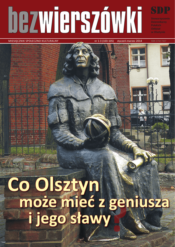 bezwierszówki MIESIĘCZNIK SPOŁECZNO-KULTURALNY nr 1-3 (103-105) Co Olsztyn styczeń-marzec 2014 SDP Stowarzyszenie Dziennikarzy Polskich Oddział w Olsztynie ISSN 1732-7327 może mieć z geniusza i jego sławy Pagina na górze lewa nr 1-3 (103-105) BEZWIERSZÓWKI BEZWIERSZÓWKI w numerze styczeń-marzec 2014 Rocznica Lubię rocznice, oczywiście za wyjątkiem rocznicy własnych urodzin. A już szczególnie cieszy mnie rocznica, której poświęcam ten tekścik. O tóż równo dziesięć lat temu, w marcu 2004 roku Zarząd olsztyńskiego Oddziału Stowarzyszenia Dziennikarzy Polskich podjął uchwałę o wydawaniu własnego pisma, adresowanego do dziennikarzy. Wówczas byłam prezeską tego Oddziału – i od razu „kupiłam” pomysł, z którym przyszedł do mnie Tadeusz Prusiński. Tytuł urodził się sam: mieliśmy pisać do naszej gazety jedynie z potrzeby serca, za darmo, a więc pismo nazwaliśmy „Bez Wierszówki”. Był to czas kiedy wielu naszych dziennikarzy lądowało na bruku, zamykano bowiem kolejne tytuły prasowe. Stołek redaktora naczelnego miał być przechodni, przeznaczony bowiem był dla dziennikarza, który powiększał grono bezrobotnych. Tak zapisaliśmy w uchwale. To go miało podtrzymywać na duchu, bo nie ma nic gorszego jak znalezienie się z dnia na dzień w pustce (czytaj: na bezrobociu), w czarnej dziurze, z której nie widzi się wyjścia. Pierwszym naszym naczelnym został Tadeusz Prusiński, a po znalezieniu pracy pałeczkę przekazał Jurkowi Pantakowi, ten z kolei Ryśkowi Borkowskiemu. Niedługo potem zwolnił on stołek naczelnego dla Krzysztofa Panasika, który też czuł się wyobcowany, jak to każdy świeżo upieczony emeryt. Każdy z nich odcisnął własne piętno zmieniając nieco charakter pisma. Tego żeby wychodziło pismo pilnował Zbyszek Wytrążek, facet z przysłowiową głową na karku, który w największych zapaściach finansowych potrafił zdobyć pieniądze by kolejne numery mogły ujrzeć światło dzienne. A był to nie lada wyczyn skoro pojawiały się i znikały jak meteoryty różne dzienniki, tygodniki, miesięczniki, padając niekiedy już po pierwszym czy dziesiątym numerze. A my trwaliśmy. I dobrze, bo przecież nagłaśnialiśmy na łamach naszego pisemka („miesięcznika, koleżanko, miesięcznika społeczno-kulturalnego” – poprawiał mnie Wytrążek), a więc nagłaśnialiśmy wszystkie procesy wytaczane nam, dziennikarzom. Relacjonowaliśmy ich przebieg, organizowaliśmy obronę dziennikarzy sięgając niekiedy po pomoc prawników z Zarządu Głównego SDP i opisywaliśmy nasze starania. Pisaliśmy o marnowanym potencjale demokracji obywatelskiej, czyli wycinaniu w pień gazetek lokalnych przez agresywne duże wydawnictwa prasowe. I ani jak nie chcieliśmy przyjąć do wiadomości, że takie są prawa wolnego rynku. Opisywaliśmy nasze projekty realizowane z funduszy przewidzianych dla organizacji pozarządowych, w tym szkolenia dla liderów tych organizacji w występowaniu przed kamerami telewizyjnymi, mikrofonami radiowców. To wtedy oddaliśmy – aczkolwiek z bólem, lecz nie za darmo – naszą rozkładówkę dla Rady Organizacji Pozarządowych, z którą nawiązaliśmy współpracę. Pisaliśmy o naszych nagrodach i konkursach. I o przyjmowanych do Stowarzyszenia nowych dziennikarzach. Mało? Jeśli mało to kłaniam się potencjalnym sponsorom. Możemy pisać więcej i dłużej. Nawet przez kolejne dziesięć lat. Wszystkim im, jak też kolejnym redaktorom naczelnym, serdecznie dziękuję. JOANNA WAŃKOWSKA-SOBIESIAK Jubileusze w 2014 roku • 70. urodzin - Krzysztof Panasik (8 stycznia) • 65 urodzin - Andrzej Badurek (9 stycznia) • 60 urodzin - Zbigniew E. Połoniewicz (24 stycznia), Tamara Jesionowska (11 września) • 55 urodzin - Grzegorz Radzicki (11 lutego), Jacek Hopfer (30 kwietnia), Wiesław Brzozowski (9 grudnia) • 50 urodzin - Mariusz Wadas (5 lipca) • 30-lecie pracy dziennikarskiej - Ewa Domaradzka-Ziarek, Ireneusz St. Bruski • 20-lecie pracy dziennikarskiej - Andrzej Pawlik Ad multos annos! Od naczelnego Rok 2014 K olejne trzysta sześćdziesiąt pięć dni przed nami. W ich kontekście snujemy plany, wyznaczamy cele, myślimy z nadzieją... Co dobrego przyniosą, czym zaowocują w naszym życiu osobistym i zawodowym? Co przyniosą całemu Stowarzyszeniu Dziennikarzy Polskich, oraz tej jego części, którą stanowią dziennikarze Warmii, Mazur i Powiśla... W skali ogólnokrajowej, jesienią 2014 roku czeka nas Zjazd Krajowy SDP. Oddział olsztyński reprezentować będzie czworo delegatów. Będziemy dyskutować, wyznaczać kierunek Stowarzyszeniu na kolejne lata i wybierać nowych reprezentantów dziennikarskiego środowiska na szczeblu krajowym. Obyśmy tylko umieli się pięknie różnić... W skali regionalnej, kontynuujemy pierwszy rok działalności nowych władz kadencji 2013-2016. Poprzeczkę chcemy postawić wysoko. Mamy wiele planów, m. in. rozpoczynamy dwa projekty. Pierwszy, którego celem są media lokalne naszej małej ojczyzny oraz drugi – niezwykle ważny we współczesnej polskiej rzeczywistości – dotyczący dziennikarstwa obywatelskiego. Pragniemy stworzyć prężny Oddział, mówiący odważnie o sprawach, które nurtują nasze środowisko. Zatem Koleżanki i Kolegów – dziennikarzy Warmii, Mazur i Powiśla, którzy oprócz codziennej pracy zawodowej pragną poświęcić swój czas, zdolności i pasję na rzecz środowiska dziennikarskiego, zapraszamy do współpracy w ramach Stowarzyszenia Dziennikarzy Polskich. Zapraszamy również do współtworzenia „Bez Wierszówki”. Nasz miesięcznik po wizualnym liftingu, ma być nadal pismem, którego cele zostały określone przed dziesięcioma laty przez jego Twórców. Ma być czasopismem tworzonym przez dziennikarzy, dla dziennikarzy, o sprawach, które dziennikarzy nurtują; tworzonym – jak podkreśla prezes Joanna w tekście „Rocznica” – „z potrzeby serca, za darmo”. Stąd takie i d