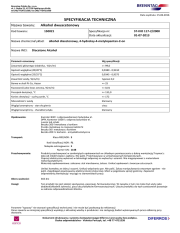 Brenntag Polska Sp. z.o.o. ul. J. Bema 21, 47-224 Kędzierzyn-Koźle tel (48/77)4721500, fax (48/77)4721600 Data wydruku: 15.06.2016 SPECYFIKACJA TECHNICZNA Nazwa towaru: Alkohol dwuacetonowy Kod towaru: 150021 Nazwa chemiczna\skład: Nazwa INCI: Specyfikacja nr: Data aktualizacji: alkohol diacetonowy, 4-hydroksy-4-metylopentan-2-on Diacetone Alcohol Parametr oznaczony: Wg specyfikacji: Zawartość głównego składnika, %(m/m) >= 99,0 Gęstość względna (20/20°C) 0,9380 - 0,9410 Gęstość względna (25/25°C) 0,9345 - 0,9375 Zawartość wody, %(m/m) typowo 0,2 Barwa w skali Pt-Co, Hazen <= 25 Kwasowość jako kwas octowy, %(m/m) <= 0,01 Początek destylacji, °C >= 135,0 Koniec destylacji - suchy punkt, °C <= 172 Mieszalność z wodą klarowny Wygląd zewnętrzny - stan skupienia ciecz Wygląd zewnętrzny - charakterystyka klarowny Opakowania: Kanister B30l z odprowadzeniem ładunków el. DPPL Kontener 1000 l z odprow.ładunków el. Luzem lub sztuki Beczka 200 l metalowa z korkiem Puszka metalowa na rozpuszczalniki 5l Beczka 50 l metalowa z korkiem Beczka 200 l z korkami - antyelektostatyczna Transport: Przechowywanie: ST-IXO 117-2/2000 01-07-2013 Klasa RID/ADR: 3 Kod klasyfikacji ADR: F1 Nalepka ostrzegawcza: 3 Numer UN: 1148 Produkt przechowywać w zamkniętych opakowaniach w chłodnym pomieszczeniu z dobrą wentylacją.Trzymać z dala od źródeł ciepla i zapłonu. Nie palić. Przechowywac w umiarkowanych temperaturach. Osprzęt elektryczny wykonać w tehnologii odpornej na wybuchy i uziemić. Nie magazynować z materiałami niekompatybilnymi. Materiały opakowaniowe: zalecane: stal nierdzewna, żelazo. Unikać opakowań z tworzyw sztucznych. Unikać kontaktu ze skórą i oczami. Unikać wdychania par. Nie palić. Zakaz manipulowania otwartym ogniem - nie palić. Zapobiegać powstawaniu elektryczności statycznej. Mieć w pogotowiu sprzęt gaśniczy. Zapewnić odpowiednią wentylację i wyciągi na stanowiskach pracy. Okres ważności: 365 dni Uwagi: Ten produkt nie jest jakości spożywczej, paszowej, farmaceutycznej. W związku z tym nie może być użyty jako dodatek/składnik żywności, pasz lub produktów farmaceutycznych. Użycie produktu do tych zastosowań pozostaje w zakresie odpowiedzialności klienta. Parametr "typowy" nie stanowi specyfikacji technicznej i nie może być podstawą do reklamacji Dane zawarte w niniejszej specyfikacji wynikają z aktualnej wiedzy o produkcie i nie zastępują badań wykonywanych przez odbiorcę przy dostawie. Dokument drukowany z systemu komputerowego Diferros i jest ważny bez podpisu. Osoba odpowiedzialna - Violetta Pańczyk, tel. +48 77 4721538