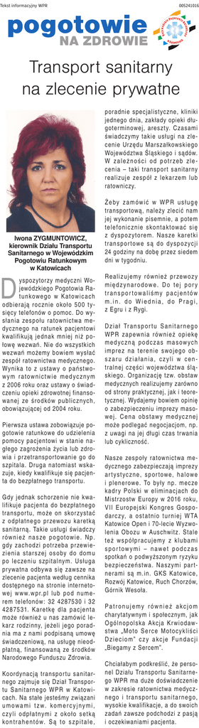 Tekst informacyjny WPR 005241016 pogotowie NA ZDROWIE Transport sanitarny na zlecenie prywatne poradnie specjalistyczne, kliniki jednego dnia, zakłady opieki długoterminowej, areszty. Czasami świadczymy takie usługi na zlecenie Urzędu Marszałkowskiego Województwa Śląskiego i sądów. W z a l e ż n o ś c i o d p o t r ze b z l e cenia – taki transpor t sanitarny realizuje zespół z lekarzem lub ratowniczy. Iwona ZYGMUNTOWICZ, kierownik Działu Transportu Sanitarnego w Wojewódzkim Pogotowiu Ratunkowym w Katowicach D yspozytorzy medyczni Wojewódzkiego Pogotowia Rat u n kowe g o w Ka tow i c a c h odbierają rocznie około 500 t ysięcy telefonów o pomoc. Do wysłania zespołu ratownictwa medycznego na ratunek pacjentowi kwalifikują jednak mniej niż połowę wezwań. Nie do wszystkich wezwań możemy bowiem wysłać zespół ratownictwa medycznego. Wynika to z ustawy o państwowym ratownictwie medycznym z 2006 roku oraz ustawy o świadczeniu opieki zdrowotnej finansowanej ze środków publicznych, obowiązującej od 2004 roku. Pierwsza ustawa zobowiązuje pogotowie ratunkowe do udzielenia pomocy pacjentowi w stanie nagłego zagrożenia życia lub zdrowia i przetranspor towanie go do szpitala. Druga natomiast wskazuje, kiedy kwalifikuje się pacjenta do bezpłatnego transportu. Gdy jednak schorzenie nie kwalifikuje pacjenta do bezpłatnego transpor tu, może on skorzystać z odpłatnego przewozu karetką sanitarną. Takie usługi świadczy r ó w n i e ż n a s ze p o g o t o w i e . N p . gdy zachodzi potrzeba przewiez i e n i a st a r s zej o s o by d o d o m u po leczeniu szpitalnym. Usługa pr ywatna odbywa się zawsze na zlecenie pacjenta według cennika dostępnego na stronie internetowe j w w w. w p r. p l l u b p o d n u m e rem telefonów : 32 4287530 i 32 4 2 875 31. Ka ret kę d l a p a c j e n t a może również u nas zamówić lekarz rodzinny, jeżeli jego poradnia ma z nami podpisaną umowę świadczeniową, na usługę nieodpłatną, finansowaną ze środków Narodowego Funduszu Zdrowia. Koordynacją transpor tu sanitarnego zajmuje się Dział Transportu Sanitarnego WPR w Katowicach. Na stałe jesteśmy związani u m o w a m i t z w. k o m e r c y j n y m i , c z y l i o d p ł a t ny m i z o ko ł o s et ką k o n t r a h e n t ó w. S ą t o s z p i t a l e , Żeby zamówić w WPR usługę transportową, należy zlecić nam jej wykonanie pisemnie, a potem te l e fo n i c z n i e s ko n t a k towa ć s i ę z d ys p o z y to re m . Na s ze ka retk i t r a n s p o r towe s ą d o d ys p o z yc j i 24 godziny na dobę przez siedem dni w tygodniu. Re a l i z u j e my rów n i e ż p r zewo z y międzynarodowe. Do tej pory transpor towaliśmy pacjentów m.in. do Wiednia, do Pragi, z Egru i z Rygi. D z i a ł Tr a n s p o r t u S a n i t a r n e g o W P R z a p ew n i a rów n i e ż o p i e kę medyczną podczas masowych i m p re z n a te re n i e s wo j e g o o b szaru działania, czyli w centralnej części województwa śląskiego. Organizację tzw. obstaw medycznych realizujemy zarówno od strony praktycznej, jak i teoretycznej. Wydajemy bowiem opinię o zabezpieczeniu imprezy masow e j . C e n a o b s t aw y m e d yc z n e j może podlegać negocjacjom, np. z uwagi na jej długi czas trwania lub cykliczność. Nasze zespoły ratownictwa medycznego zabezpieczają imprezy a r t yst yc z n e , s p o r towe , h a l owe i plenerowe. To były np. mecze kadr y Polski w eliminacjach do Mistrzostw Europy w 2016 roku, VII Europejski Kongres Gospod a rc z y, a o st a t n i o t u r n i e j W TA Katowice Open i 70-lecie Wyzwolenia Obozu w Auschwitz. Stale t e ż w s p ó ł p r a c u j e my z k l u b a m i sportowymi – nawet podczas spotkań o podwyższonym ryzyku bezpieczeństwa. Naszymi par tnerami są m.in. GKS Katowice, Rozwój Katowice, Ruch Chorzów, Górnik Wesoła. Patronujemy również akcjom charytatywnym i społecznym, jak Og ólnopolska Akcja Kr wiodaw st wa „ M oto S e rc e M oto c y k l i ś c i D z i e c i o m ” c z y a k c j e Fu n d a c j i „Biegamy z Sercem”. Chciałabym podkreślić, że personel Działu Transportu Sanitarnego WPR ma duże doświadczenie w zakresie ratownictwa medycznego i transportu sanitarnego, wysokie kwalifikacje, a do swoich zadań zawsze podchodzi z pasją i oczekiwaniami pacjenta.