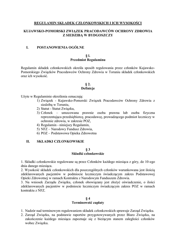REGULAMIN SKŁADEK CZŁONKOWSKICH I ICH WYSOKOŚCI KUJAWSKO-POMORSKI ZWIĄZEK PRACODAWCÓW OCHRONY ZDROWIA Z SIEDZIBĄ W BYDGOSZCZY I. POSTANOWIENIA OGÓLNE § l. Przedmiot Regulaminu Regulamin składek członkowskich określa sposób regulowania przez członków KujawskoPomorskiego Związków Pracodawców Ochrony Zdrowia w Toruniu składek członkowskich oraz ich wysokość. § 2. Definicje Użyte w Regulaminie określenia oznaczają: 1) Związek - Kujawsko-Pomorski Związek Pracodawców Ochrony Zdrowia z siedzibą w Toruniu, 2) Statut - Statut Związku, 3) Członek – umocowana prawnie osoba prawna lub osoba fizyczna reprezentująca przedsiębiorcę, pracodawcę, prowadzącego podmiot leczniczy w ochronie zdrowia, w zakresie POZ, 4) Regulamin - niniejszy Regulamin, 5) NFZ – Narodowy Fundusz Zdrowia, 6) POZ – Podstawowa Opieka Zdrowotna II. SKŁADKI CZŁONKOWSKIE §3 Składki członkowskie 1. Składki członkowskie regulowane są przez Członków każdego miesiąca z góry, do 10-ego dnia danego miesiąca. 2. Wysokość składek członkowskich dla poszczególnych członków warunkowana jest ilością zdeklarowanych pacjentów w podmiocie leczniczym świadczącym zakres Podstawowej Opieki Zdrowotnej w ramach Kontraktu z Narodowym Funduszem Zdrowia. 3. Na wniosek Zarządu Związku, członek obowiązany jest złożyć oświadczenie, o ilości zdeklarowanych pacjentów w podmiocie leczniczym świadczącym zakres POZ w ramach kontraktu z NFZ. §4 Terminowość zapłaty 1. Nadzór nad terminowym regulowaniem składek członkowskich sprawuje Zarząd Związku. 2. Zarząd Związku, na podstawie raportów przygotowywanych przez Biuro Związku, na zakończenie każdego miesiąca zapoznaje się z bieżącym stanem zaległości członków wobec Związku. 3. W sytuacji, w której zaległości Członka wobec Związku będą równe lub wyższe wysokości jego 3-miesięcznej składki członkowskiej, Zarząd Związku podejmuje uchwałę o zawieszeniu lub wykluczeniu Członka. 4. Zakres zawieszenia w prawach członkowskich określa każdorazowo uchwała Zarządu Związku. 5. Zawieszenie może dotyczyć zarówno praw danego Członka, jak i osób wchodzących w skład organów Związku oraz Delegatów, którzy reprezentują danego Członka. 6. Zawieszenie członka nie zwalnia go z obowiązku regulowania kolejnych składek członkowskich w pełnej wysokości również za okres zawieszenia. 7. Powyższe zapisy nie wykluczają innych metod dyscyplinowania członków nie regulujących składek członkowskich. W szczególności, Zarząd Związku ma prawo do: 1) sprzedaży wierzytelności wynikającej z zaległych składek członkowskich, 2) skierowania sprawy do firmy windykacyjnej, 3) skierowania sprawy na drogę postępowania sądowego, a następnie komorniczego, 4) informowania innych członków o wysokości zadłużenia. III. POSTANOWIENIA KOŃCOWE. § 5. Zasada subsydiarności W sprawach nie objętych Regulaminem mają odpowiednie zastosowanie właściwe przepisy prawa oraz postanowienia Statutu i innych regulaminów wewnętrznych Związku. § 6. Tekst jednolity Regulaminu W przypadku zmiany Regulaminu, Zarząd Związku w terminie 30 dni od uchwalenia zmiany, sporządza jego tekst jednolity. § 7. Wejście w życie Regulamin wchodzi w życie z chwilą jego uchwalenia. Załącznik nr 1 REGULAMINU SKŁADEK CZŁONKOWSKICH I ICH WYSOKOŚCI WYSOKOŚĆ SKŁADEK CZŁONKOWSKICH KUJAWSKO-POMORSKI ZWIĄZEK PRACODAWCÓW OCHRONY ZDROWIA Z SIEDZIBĄ W BYDGOSZCZY Składkę nalicza się według zasady: do 2500 - 100 zł do 5000 - 160 zł do 7500 - 220 zł do 10000 - 280 zł do 12500 - 340 zł do 15000 - 400 zł do 17500 - 460 zł do 20000 - 520 zł do 22500 - 580 zł do 25000 - 640 zł Składki należy wpłacać na konto: Getin Noble Bank S.A 43 156 0 0 013 2 0 0 0 1701 4757 23 0 0 W tytule przelewu należy wyszczególnić miesiąc, którego dotyczy składka. Do kosztów uzyskania przychodów zaliczana jest również składka na rzecz Związku pracodawców utworzonego na podstawie ustawy z dnia 23 maja 1991 r. o organizacjach pracodawców (Dz.U. Nr 55, poz. 235 ze zm.). Podstawę prawną zaliczenia tej składki do kosztów stanowi art. 6 ust. 2 wspomnianej ustawy, z tym że - zgodnie z § 1 rozporządzenia Rady Ministrów z dnia 12 marca 2002 r. (Dz.U. Nr 34, poz. 310) - składka ta odliczana jest od przychodu przy ustaleniu dochodu tylko do wysokości 0,15% kwoty wynagrodzeń wypłaconych w roku poprzednim, stanowiącym podstawę wymiaru składek na ubezpieczenie społeczne.