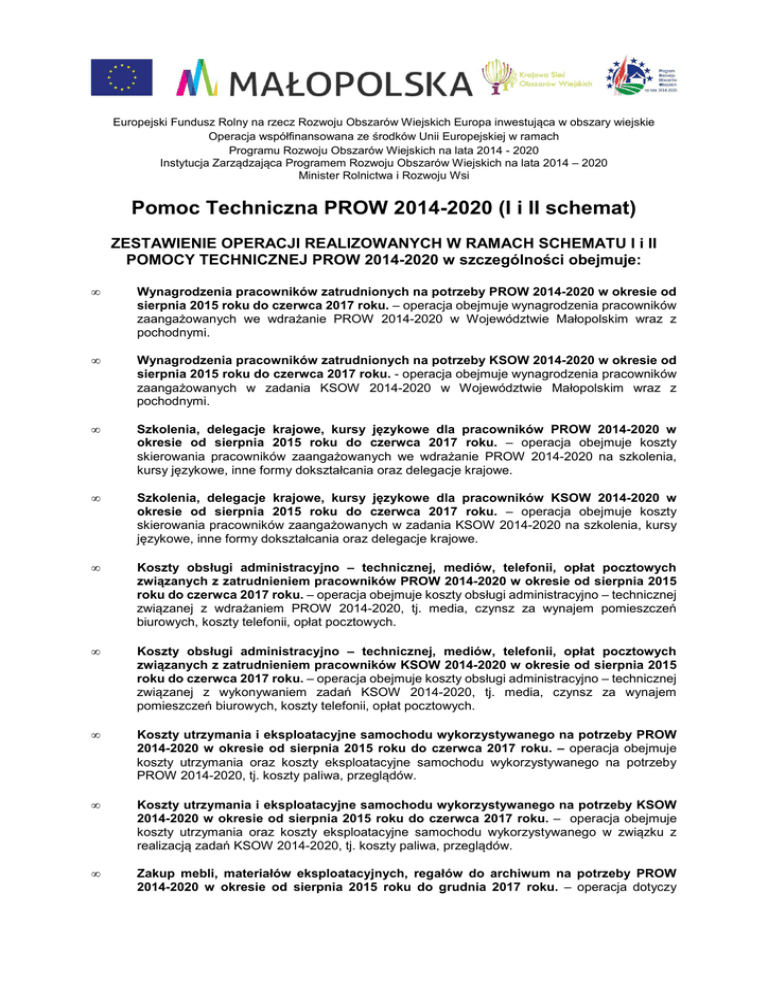Europejski Fundusz Rolny na rzecz Rozwoju Obszarów Wiejskich Europa inwestująca w obszary wiejskie Operacja współfinansowana ze środków Unii Europejskiej w ramach Programu Rozwoju Obszarów Wiejskich na lata 2014 - 2020 Instytucja Zarządzająca Programem Rozwoju Obszarów Wiejskich na lata 2014 – 2020 Minister Rolnictwa i Rozwoju Wsi Pomoc Techniczna PROW 2014-2020 (I i II schemat) ZESTAWIENIE OPERACJI REALIZOWANYCH W RAMACH SCHEMATU I i II POMOCY TECHNICZNEJ PROW 2014-2020 w szczególności obejmuje: • Wynagrodzenia pracowników zatrudnionych na potrzeby PROW 2014-2020 w okresie od sierpnia 2015 roku do czerwca 2017 roku. – operacja obejmuje wynagrodzenia pracowników zaangażowanych we wdrażanie PROW 2014-2020 w Województwie Małopolskim wraz z pochodnymi. • Wynagrodzenia pracowników zatrudnionych na potrzeby KSOW 2014-2020 w okresie od sierpnia 2015 roku do czerwca 2017 roku. - operacja obejmuje wynagrodzenia pracowników zaangażowanych w zadania KSOW 2014-2020 w Województwie Małopolskim wraz z pochodnymi. • Szkolenia, delegacje krajowe, kursy językowe dla pracowników PROW 2014-2020 w okresie od sierpnia 2015 roku do czerwca 2017 roku. – operacja obejmuje koszty skierowania pracowników zaangażowanych we wdrażanie PROW 2014-2020 na szkolenia, kursy językowe, inne formy dokształcania oraz delegacje krajowe. • Szkolenia, delegacje krajowe, kursy językowe dla pracowników KSOW 2014-2020 w okresie od sierpnia 2015 roku do czerwca 2017 roku. – operacja obejmuje koszty skierowania pracowników zaangażowanych w zadania KSOW 2014-2020 na szkolenia, kursy językowe, inne formy dokształcania oraz delegacje krajowe. • Koszty obsługi administracyjno – technicznej, mediów, telefonii, opłat pocztowych związanych z zatrudnieniem pracowników PROW 2014-2020 w okresie od sierpnia 2015 roku do czerwca 2017 roku. – operacja obejmuje koszty obsługi administracyjno – technicznej związanej z wdrażaniem PROW 2014-2020, tj. media, czynsz za wynajem pomieszczeń biurowych, koszty telefonii, opłat pocztowych. • Koszty obsługi administracyjno – technicznej, mediów, telefonii, opłat pocztowych związanych z zatrudnieniem pracowników KSOW 2014-2020 w okresie od sierpnia 2015 roku do czerwca 2017 roku. – operacja obejmuje koszty obsługi administracyjno – technicznej związanej z wykonywaniem zadań KSOW 2014-2020, tj. media, czynsz za wynajem pomieszczeń biurowych, koszty telefonii, opłat pocztowych. • Koszty utrzymania i eksploatacyjne samochodu wykorzystywanego na potrzeby PROW 2014-2020 w okresie od sierpnia 2015 roku do czerwca 2017 roku. – operacja obejmuje koszty utrzymania oraz koszty eksploatacyjne samochodu wykorzystywanego na potrzeby PROW 2014-2020, tj. koszty paliwa, przeglądów. • Koszty utrzymania i eksploatacyjne samochodu wykorzystywanego na potrzeby KSOW 2014-2020 w okresie od sierpnia 2015 roku do czerwca 2017 roku. – operacja obejmuje koszty utrzymania oraz koszty eksploatacyjne samochodu wykorzystywanego w związku z realizacją zadań KSOW 2014-2020, tj. koszty paliwa, przeglądów. • Zakup mebli, materiałów eksploatacyjnych, regałów do archiwum na potrzeby PROW 2014-2020 w okresie od sierpnia 2015 roku do grudnia 2017 roku. – operacja dotyczy Europejski Fundusz Rolny na rzecz Rozwoju Obszarów Wiejskich Europa inwestująca w obszary wiejskie Operacja współfinansowana ze środków Unii Europejskiej w ramach Programu Rozwoju Obszarów Wiejskich na lata 2014 - 2020 Instytucja Zarządzająca Programem Rozwoju Obszarów Wiejskich na lata 2014 – 2020 Minister Rolnictwa i Rozwoju Wsi zakupu mebli, materiałów eksploatacyjnych, biurowych, komputerów i sprzętu biurowego niezbędnego do wykonywania zadań związanych z wdrażaniem PROW 2014-2020. • Zakup mebli, materiałów eksploatacyjnych na potrzeby KSOW 2014-2020 w okresie od sierpnia 2015 roku do grudnia 2017 roku. – operacja dotyczy zakupu mebli, materiałów eksploatacyjnych, biurowych, komputerów i sprzętu biurowego niezbędnego do wykonywania zadań związanych z KSOW 2014-2020. • Wynagrodzenia osób zatrudnionych na umowy cywilno – prawne na potrzeby PROW 2014-2020 oraz obsługa komisji eksperckich. – operacja obejmuje wynagrodzenia osób zatrudnionych na umowy cywilno – prawne na potrzeby wdrażania PROW 2014-2020, wynagrodzenia ekspertów zatrudnionych do oceny LSR, koszty opinii eksperckich, koszty obsługi posiedzeń ekspertów, członków grup roboczych. Planuje się, iż operacja zapewni możliwość funkcjonowania podmiotu odpowiedzialnego za realizację zadań określonych w Programie Rozwoju Obszarów Wiejskich na lata 2014-2020. Operacja pn.: „Realizacja przedsięwzięć informacyjno-promocyjnych PROW na lata 2014-2020 w Województwie Małopolskim w okresie 2015-2017” Obejmuje ona w szczególności: • szkolenia dla beneficjentów Programu, • przedsięwzięcia w mediach (telewizja, prasa, radio, Internet), • realizacja innych przedsięwzięć wymienionych w Planie Komunikacyjnym PROW na lata 2014-2020. Planuje się, iż operacja zapewni sprawny przepływ informacji względem beneficjentów, jak też ogółu społeczeństwa. Operacja pn.: „Realizacja przedsięwzięć KSOW w Województwie Małopolskim w okresie 2015-2017” Obejmuje ona w szczególności: • szkolenia, warsztaty, konferencje, seminaria, • konkursy, • wystawy, udział w przedsięwzięciach wystawienniczych, • przedsięwzięcia o charakterze edukacyjnym, • aktywizację środowisk lokalnych, • sieciowanie i animowanie współpracy międzyinstytucjonalnej, • inne przedsięwzięcia wynikające z Planu Operacyjnego KSOW na lata 20142015 oraz Planu Operacyjnego 2016-2017, które dotyczą obszarów wiejskich. Europejski Fundusz Rolny na rzecz Rozwoju Obszarów Wiejskich Europa inwestująca w obszary wiejskie Operacja współfinansowana ze środków Unii Europejskiej w ramach Programu Rozwoju Obszarów Wiejskich na lata 2014 - 2020 Instytucja Zarz