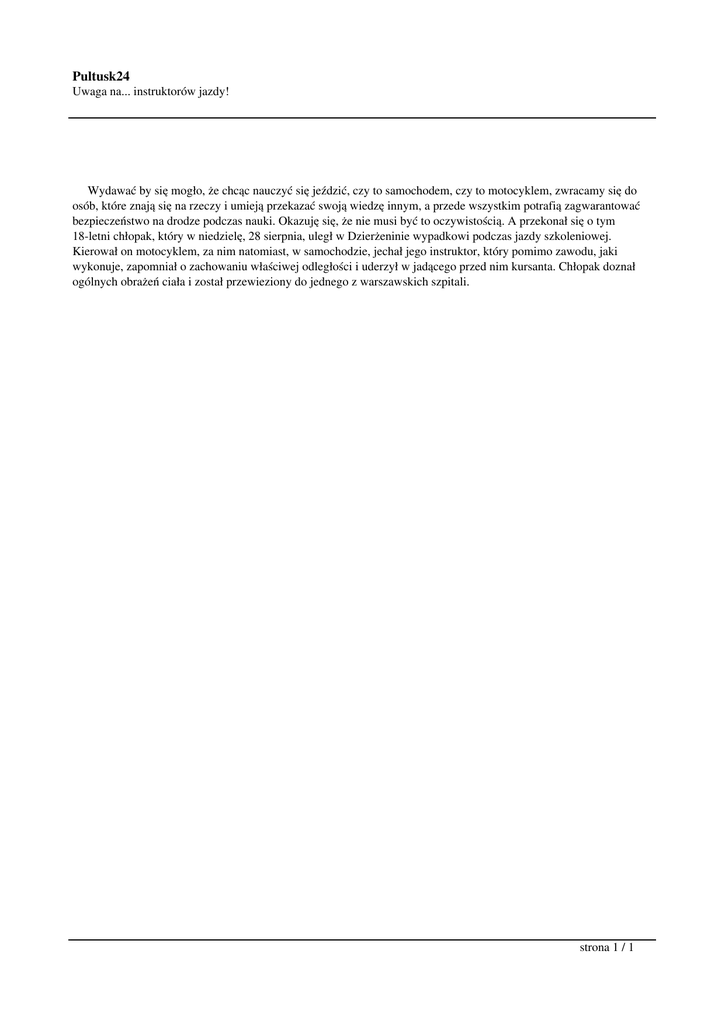 Pultusk24 Uwaga na... instruktorów jazdy! Wydawać by się mogło, że chcąc nauczyć się jeździć, czy to samochodem, czy to motocyklem, zwracamy się do osób, które znają się na rzeczy i umieją przekazać swoją wiedzę innym, a przede wszystkim potrafią zagwarantować bezpieczeństwo na drodze podczas nauki. Okazuję się, że nie musi być to oczywistością. A przekonał się o tym 18-letni chłopak, który w niedzielę, 28 sierpnia, uległ w Dzierżeninie wypadkowi podczas jazdy szkoleniowej. Kierował on motocyklem, za nim natomiast, w samochodzie, jechał jego instruktor, który pomimo zawodu, jaki wykonuje, zapomniał o zachowaniu właściwej odległości i uderzył w jadącego przed nim kursanta. Chłopak doznał ogólnych obrażeń ciała i został przewieziony do jednego z warszawskich szpitali. strona 1 / 1