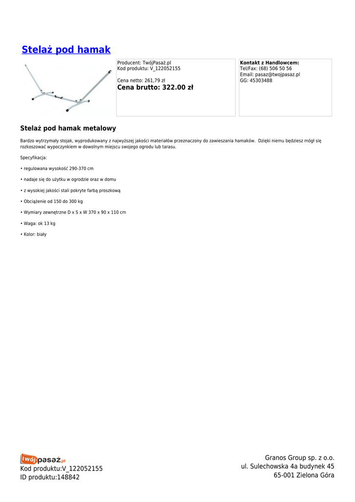 Stelaż pod hamak Producent: TwójPasaż.pl Kod produktu: V_122052155 Cena netto: 261,79 zł Kontakt z Handlowcem: Tel/Fax: (68) 506 50 56 Email: [email protected] GG: 45303488 Cena brutto: 322.00 zł Stelaż pod hamak metalowy Bardzo wytrzymały stojak, wyprodukowany z najwyższej jakości materiałów przeznaczony do zawieszania hamaków. Dzięki niemu będziesz mógł się rozkoszować wypoczynkiem w dowolnym miejscu swojego ogrodu lub tarasu. Specyfikacja: • regulowana wysokość 290-370 cm • nadaje się do użytku w ogrodzie oraz w domu • z wysokiej jakości stali pokryte farbą proszkową • Obciążenie od 150 do 300 kg • Wymiary zewnętrzne D x S x W 370 x 90 x 110 cm • Waga: ok 13 kg • Kolor: biały Kod produktu:V_122052155 ID produktu:148842 Granos Group sp. z o.o. ul. Sulechowska 4a budynek 45 65-001 Zielona Góra