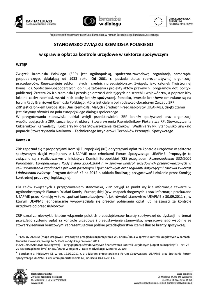 STANOWISKO ZWIĄZKU RZEMIOSŁA POLSKIEGO w sprawie opłat za kontrole urzędowe w sektorze spożywczym WSTĘP Związek Rzemiosła Polskiego (ZRP) jest ogólnopolską, społeczno-zawodową organizacją samorządu gospodarczego, działającą od 1933 roku. Od 2001 r. posiada status reprezentatywnej organizacji pracodawców. Reprezentuje sektor małych i średnich przedsiębiorstw. Związek, jako członek Trójstronnej Komisji ds. Społeczno-Gospodarczych, opiniuje założenia i projekty aktów prawnych i programów dot. polityki publicznej. Zrzesza 26 izb rzemiosła i przedsiębiorczości działających na szczeblu województw, a poprzez izby lokalne cechy rzemiosł, wśród nich cechy branży spożywczej. Ponadto, kwestie branżowe omawiane są na forum Rady Branżowej Rzemiosła Polskiego, która jest ciałem opiniodawczo-doradczym Zarządu ZRP. ZRP jest członkiem Europejskiej Unii Rzemiosła, Małych i Średnich Przedsiębiorstw (UEAPME), dzięki czemu jest aktywny również na polu europejskiego dialogu społecznego. W przygotowaniu stanowiska udział wzięli przedstawiciele ZRP branży spożywczej oraz organizacji współpracujących z ZRP, spoza jego struktury: Stowarzyszenia Rzemieślników Piekarstwa RP; Stowarzyszenia Cukierników, Karmelarzy i Lodziarzy RP oraz Stowarzyszenia Rzeźników i Wędliniarzy RP. Stanowisko uzyskało poparcie Stowarzyszenia Naukowo – Technicznego Inżynierów i Techników Przemysłu Spożywczego. Kontekst ZRP zapoznał się z propozycjami Komisji Europejskiej (KE) dotyczącymi opłat za kontrole urzędowe w sektorze spożywczym dzięki współpracy z UEAPME oraz członkami Forum Spożywczego UEAPME. Propozycje te związane są z realizowanym z inicjatywy Komisji Europejskiej (KE) przeglądem Rozporządzenia 882/2004 Parlamentu Europejskiego i Rady z dnia 29.04.2004 r. w sprawie kontroli urzędowych przeprowadzanych w celu sprawdzenia zgodności z prawem paszowym i żywnościowym oraz regułami dotyczącymi zdrowia zwierząt i dobrostanu zwierząt. Program działań KE na 2012 r. zakłada finalizację przygotowań i złożenie przez Komisję konkretnej propozycji legislacyjnej. Dla celów związanych z przygotowaniem stanowiska, ZRP przyjął za punkt wyjścia informacje zawarte w ogólnodostępnych Planach Działań Komisji Europejskiej (tzw. mapach drogowych1) oraz informacje przekazane UEAPME przez Komisję w toku spotkań konsultacyjnych2, jak również stanowisko UEAPME z 30.09.2011 r., w którym UEAPME jednoznacznie wypowiedziała się przeciw pobieraniu opłat lub należności za kontrole urzędowe od przedsiębiorców. ZRP uznał za niezwykle istotne włączenie polskich przedsiębiorców branży spożywczej do dyskusji na temat przyszłego systemu opłat za kontrole urzędowe i przedstawienie stanowiska, wypracowanego wspólnie ze stowarzyszeniami branżowymi reprezentującymi polskie przedsiębiorstwa rzemieślnicze branży spożywczej. 1 PLAN DZIAŁANIA (Mapa Drogowa) - Propozycja przeglądu rozporządzenia WE nr 882/2004 w sprawie kontroli urzędowych w ramach łańcucha żywności; Wersja Nr 5; Data modyfikacji czerwiec 2011. PLAN DZIAŁANIA (Mapa Drogowa) - Przegląd przepisów dotyczących finansowania kontroli urzędowych („opłat za inspekcje”) – art. 2629 Rozporządzenia (WE) nr 882/2004; Wersja nr 2; Data modyfikacji: 12 marca 2010 r. 2 Spotkanie z inicjatywy KE w dn. 19.09.2011 r. z udziałem przedstawiciela Forum Spożywczego UEAPME oraz Spotkanie Forum Spożywczego UEAPME z udziałem przedstawiciela KE, Bruksela 10.11.2011 r. Aktualna sytuacja w Polsce W Polsce kontrole urzędowe i ich koszty regulowane są szeregiem przepisów krajowych: 1. Kontrole ze strony Głównego Inspektora Sanitarnego (GIS) - Ustawą z 14.03.1985 r. o Państwowej Inspekcji Sanitarnej (Dz.U. 1985 nr 12 poz. 49 z późn. zmianami); - Ustawą z 25.08.2006 r. o bezpieczeństwie żywności i żywienia (Dz.U. 2006 nr 171 poz. 1225 z późn. zmianami) - aktami wykonawczymi /m.in. Rozporządzenie Ministra Zdrowia w sprawie opłat za czynności wykonywane przez organy Państwowej Inspekcji Sanitarnej w ramach urzędowych kontroli żywności; Dz.U. 2009 nr 78 poz. 656; Dz.U. 2011 nr 18 poz. 95/. 2. Kontrole3 ze strony Inspekcji Jakości Handlowej Artykułów Rolno-Spożywczych (IJHARS) - Ustawą z 21.12.2000 r. o jakości handlowej artykułów rolno-spożywczych (Dz.U. 2001 nr 5 poz. 44 z późn. zmianami) 3. Kontrole ze strony Głównego Inspektoratu Weterynarii (GIW) - Ustawą z 29.01.2004 r. o Inspekcji Weterynaryjnej (Dz.U. 2004 Nr 33 poz. 287 z późn. zmianami) - Zarządzeniem Nr 34 Ministra Rolnictwa i Rozwoju Wsi z 30.12.2008 r. w sprawie nadania statutu Głównemu Inspektoratowi Weterynarii (Dz.Urzędowy MRiRW z 31.12.2008 r. Nr 31, poz. 38). 4. Kontrole strony Urzędu Ochrony Konsumentów i Konkurencji (UOKiK) - Ustawą z 12.01.2007 r. o zmianie ustawy o ogólnym bezpieczeństwie produktów (Dz.U. 2007 nr 35 poz. 215)4 Ponadto, zgodnie z art. 26 Rozporządzenia WE nr 882/2004 Polska jest zobligowana do zapewnienia środków finansowych na przeprowadzanie kontroli urzędowych, w sposób uznany za właściwy. W praktyce, opłaty za kontrole urzędowe oraz nadzór z urzędu w zakładzie (np. podczas uboju, znakowania mięsa), pobierane są od przedsiębiorców branży mleczarskiej, paszowej oraz uboju i przetwórstwa mięsnego bez względu na to czy w ramach kontroli wykazano czy nie uchybienia ze strony przedsiębiorcy. W odniesieniu do pozostałych przedsiębiorstw branży spożywczej, opłaty występują w przypadku re-kontroli związanych z nieprawidłowościami stwierdzonymi podczas rutynowych kontroli. Jeśli inspektorzy GIS, GIW, IJHARS, UOKiK nie stwierdzą w trakcie rutynowej kontroli żadnych uchybień, przedsiębiorca nie jest obciążany żadnymi kosztami. Jeśli natomiast zostaną stwierdzone nieprawidłowości, to poza kosztami ich usunięcia oraz mandatu, poniesie on także koszty re-kontroli, w tym koszty dojazdu inspektorów. 3 Zgodni