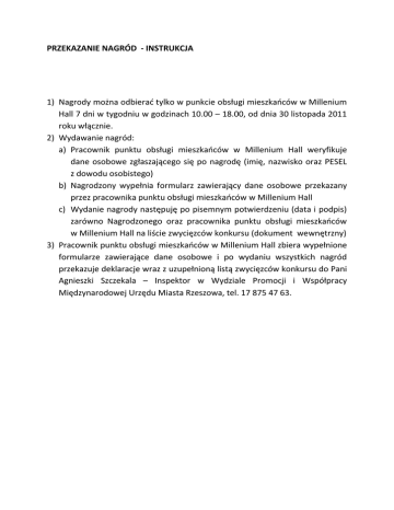 PRZEKAZANIE NAGRÓD - INSTRUKCJA 1) Nagrody można odbierać tylko w punkcie obsługi mieszkańców w Millenium Hall 7 dni w tygodniu w godzinach 10.00 – 18.00, od dnia 30 listopada 2011 roku włącznie. 2) Wydawanie nagród: a) Pracownik punktu obsługi mieszkańców w Millenium Hall weryfikuje dane osobowe zgłaszającego się po nagrodę (imię, nazwisko oraz PESEL z dowodu osobistego) b) Nagrodzony wypełnia formularz zawierający dane osobowe przekazany przez pracownika punktu obsługi mieszkańców w Millenium Hall c) Wydanie nagrody następuję po pisemnym potwierdzeniu (data i podpis) zarówno Nagrodzonego oraz pracownika punktu obsługi mieszkańców w Millenium Hall na liście zwycięzców konkursu (dokument wewnętrzny) 3) Pracownik punktu obsługi mieszkańców w Millenium Hall zbiera wypełnione formularze zawierające dane osobowe i po wydaniu wszystkich nagród przekazuje deklaracje wraz z uzupełnioną listą zwycięzców konkursu do Pani Agnieszki Szczekala – Inspektor w Wydziale Promocji i Współpracy Międzynarodowej Urzędu Miasta Rzeszowa, tel. 17 875 47 63.