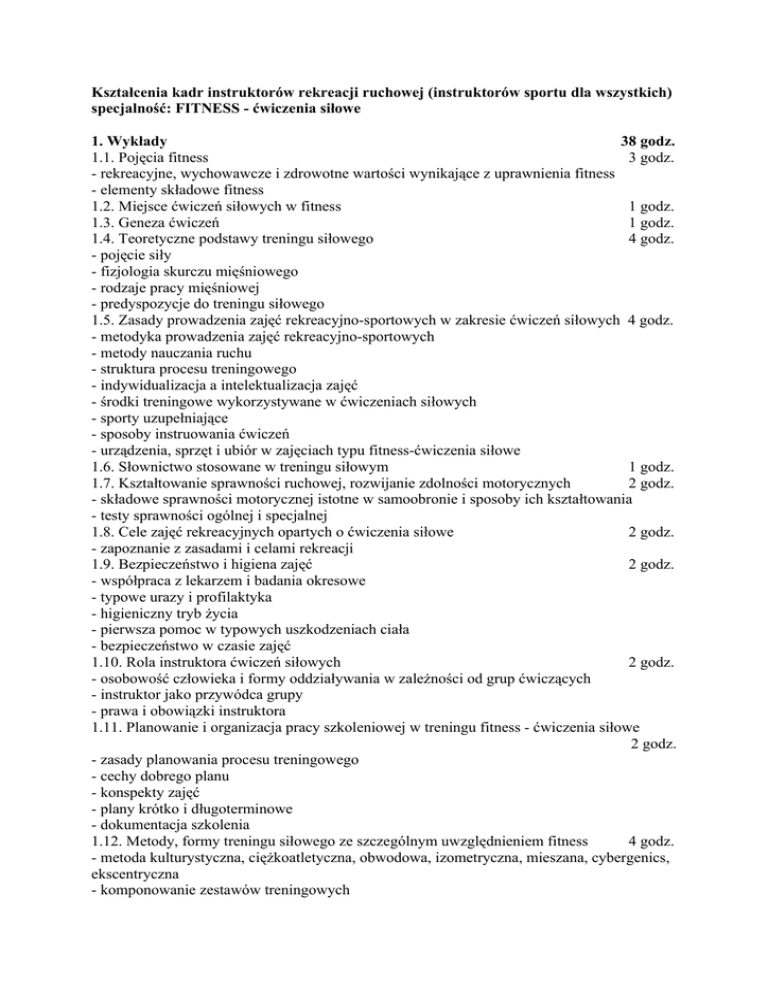 Kształcenia kadr instruktorów rekreacji ruchowej (instruktorów sportu dla wszystkich) specjalność: FITNESS - ćwiczenia siłowe 1. Wykłady 38 godz. 1.1. Pojęcia fitness 3 godz. - rekreacyjne, wychowawcze i zdrowotne wartości wynikające z uprawnienia fitness - elementy składowe fitness 1.2. Miejsce ćwiczeń siłowych w fitness 1 godz. 1.3. Geneza ćwiczeń 1 godz. 1.4. Teoretyczne podstawy treningu siłowego 4 godz. - pojęcie siły - fizjologia skurczu mięśniowego - rodzaje pracy mięśniowej - predyspozycje do treningu siłowego 1.5. Zasady prowadzenia zajęć rekreacyjno-sportowych w zakresie ćwiczeń siłowych 4 godz. - metodyka prowadzenia zajęć rekreacyjno-sportowych - metody nauczania ruchu - struktura procesu treningowego - indywidualizacja a intelektualizacja zajęć - środki treningowe wykorzystywane w ćwiczeniach siłowych - sporty uzupełniające - sposoby instruowania ćwiczeń - urządzenia, sprzęt i ubiór w zajęciach typu fitness-ćwiczenia siłowe 1.6. Słownictwo stosowane w treningu siłowym 1 godz. 1.7. Kształtowanie sprawności ruchowej, rozwijanie zdolności motorycznych 2 godz. - składowe sprawności motorycznej istotne w samoobronie i sposoby ich kształtowania - testy sprawności ogólnej i specjalnej 1.8. Cele zajęć rekreacyjnych opartych o ćwiczenia siłowe 2 godz. - zapoznanie z zasadami i celami rekreacji 1.9. Bezpieczeństwo i higiena zajęć 2 godz. - współpraca z lekarzem i badania okresowe - typowe urazy i profilaktyka - higieniczny tryb życia - pierwsza pomoc w typowych uszkodzeniach ciała - bezpieczeństwo w czasie zajęć 1.10. Rola instruktora ćwiczeń siłowych 2 godz. - osobowość człowieka i formy oddziaływania w zależności od grup ćwiczących - instruktor jako przywódca grupy - prawa i obowiązki instruktora 1.11. Planowanie i organizacja pracy szkoleniowej w treningu fitness - ćwiczenia siłowe 2 godz. - zasady planowania procesu treningowego - cechy dobrego planu - konspekty zajęć - plany krótko i długoterminowe - dokumentacja szkolenia 1.12. Metody, formy treningu siłowego ze szczególnym uwzględnieniem fitness 4 godz. - metoda kulturystyczna, ciężkoatletyczna, obwodowa, izometryczna, mieszana, cybergenics, ekscentryczna - komponowanie zestawów treningowych 1.13. Sposoby treningu siłowego w fitness według zasad Weidera 4 godz. - sposoby treningu początkujących, średniozaawansowanych i zaawansowanych 1.14. Trening gibkości jako uzupełnienie ćwiczeń siłowych fitness 1 godz. 1.15. Podstawowe zasady treningu aerobowego dla potrzeb fitness - ćwiczenia siłowe 1 godz. 1.16. Zalecenia dietetyczne dla osób uprawiających ćwiczenia siłowe w treningu fitness 3 godz. 1.17. Ogólne założenia innych form aktywności ruchowej opartych o ćwiczenia siłowe 1 godz. - kulturystyka - fitness sportowy - trójbój siłowy - konkursy siłaczy - podnoszenie ciężarów 2. Ćwiczenia 40 godz. 2.1. Znaczenie rozgrzewki i jej charakter w zależności od tematu zajęć 1 godz. - rodzaje ćwiczeń rozgrzewających - kolejność ćwiczeń - pomiar tętna jako wskaźnik adaptacji organizmu 2.2. Formy ćwiczeń ogólnorozwojowych i specjalistycznych w poszczególnych okresach treningowych z uwzględnieniem prawności fizycznej uczestników, ich wieku oraz warunków lokalowych lub terenowych 2 godz. 2.3. Zasób ćwiczeń kształtujących motorykę 6 godz. - ćwiczenia wytrzymałości (metody ciągłe i przerywane, formy treningu aerobowego w treningu siłowym) - uzupełniające ćwiczenia szybkości, zwinności i koordynacji - ćwiczenia gibkości (statyczne, dynamiczne, bierne, czynne, samodzielne i z partnerem, stretching) 2.4. Ćwiczenia oddechowe 1godz. - specyfika ćwiczeń oddechowych - oddech w czasie treningu 2.5. Podstawowe ćwiczenia siłowe - systematyka, technika wykonania i metodyka nauczania 10 godz. - ćwiczenia z pokonywaniem oporu własnego ciała - ćwiczenia z partnerem - ćwiczenia z przyborami i na przyrządach - ćwiczenia mięśni klatki piersiowej, ramion, obręczy barkowej, grzbietu, brzucha, nóg z wykorzystaniem oporu zewnętrznego (wolny ciężar i maszyny) 2.6. Trening siły - przykładowe jednostki dla poszczególnych metod treningowych (trening obwodowy, body building, ciężkoatletyczny, ćwiczenia w parach, cybergenics, ćwiczenia izometryczne) 6 godz. 2.7. Ćwiczenia korekcyjne, uzupełniające i pomocnicze 2 godz. 2.8. Doskonalenie techniczne i metodyczne w obrębie ćwiczeń siłowych 4 godz. - doskonalenie wykonania - poprawa błędów - wyrabianie nawyków ruchowych - zasady doboru ćwiczeń - demonstracja i poprawa błędów - bezpieczeństwo zajęć 2.9. Prowadzenie przez kursantów treningów na zadane tematy - zasoby ćwiczeń - przykładowe zestawy ćwiczeń - realizacja założonych zadań treningowych 8 godz. 3. Seminarium 1 godz. 4. Praca samokształcąca - tematyka prac kontrolnych 4.1. Przygotowanie konspektów zajęć wg podanego tematu (dla grup początkujących i zaawansowanych) 4.2. Opracowanie rocznego planu pracy w zajęciach fitness-ćwiczenia siłowe 4.3. Walory rekreacyjne oraz utylitarno-zdrowotne zajęć rekreacyjnych w zakresie fitnessćwiczenia siłowe 4.4. Ćwiczenia ogólnorozwojowe i specjalistyczne 4.5. Opracowanie programu dwutygodniowego obozu z podaniem zasad organizacyjnych, sposobu naboru, kadry szkoleniowej i potrzebnego sprzętu 4.6. Przygotowanie zestawu zabaw i gier pomocniczych w treningu siłowym 4.7. Zestawy treningowe 4.8. Przykładowe diety, zasady obniżania masy ciała