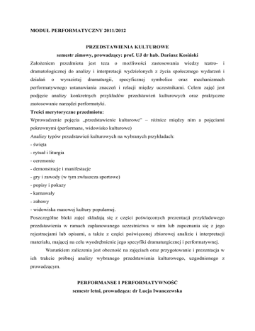 MODUŁ PERFORMATYCZNY 2011/2012 PRZEDSTAWIENIA KULTUROWE semestr zimowy, prowadzący: prof. UJ dr hab. Dariusz Kosiński Założeniem przedmiotu jest teza o możliwości zastosowania wiedzy teatro- i dramatologicznej do analizy i interpretacji wydzielonych z życia społecznego wydarzeń i działań o wyrazistej dramaturgii, specyficznej symbolice oraz mechanizmach performatywnego ustanawiania znaczeń i relacji między uczestnikami. Celem zajęć jest podjęcie analizy konkretnych przykładów przedstawień kulturowych oraz praktyczne zastosowanie narzędzi performatyki. Treści merytoryczne przedmiotu: Wprowadzenie pojęcia „przedstawienie kulturowe” – różnice między nim a pojęciami pokrewnymi (performans, widowisko kulturowe) Analizy typów przedstawień kulturowych na wybranych przykładach: - święta - rytuał i liturgia - ceremonie - demonstracje i manifestacje - gry i zawody (w tym zwłaszcza sportowe) - popisy i pokazy - karnawały - zabawy - widowiska masowej kultury popularnej. Poszczególne bloki zajęć składają się z części poświęconych prezentacji przykładowego przedstawienia w ramach zaplanowanego uczestnictwa w nim lub zapoznania się z jego rejestracjami lub opisami, a także z części poświęconej zbiorowej analizie i interpretacji materiału, mającej na celu wyodrębnienie jego specyfiki dramaturgicznej i performatywnej. Warunkiem zaliczenia jest obecność na zajęciach oraz przygotowanie i prezentacja w ich trakcie próbnej analizy wybranego przedstawienia kulturowego, uzgodnionego z prowadzącym. PERFORMANSE I PERFORMATYWNOŚĆ semestr letni, prowadząca: dr Łucja Iwanczewska Celem zajęć jest zapoznanie studentów z podstawowymi aspektami współczesnych performansów kulturowych, a także nauczenie ich rozpoznawania strategii performatywnych w najnowszej kulturze, sztuce i literaturze. Zajęcia będą polegały na przeprowadzeniu szeregu analiz szerokiej gamy zjawisk społecznych oraz kulturowych, do których wprowadzeniem będzie lektura oraz krytyczna dyskusja tekstów poświęconych teorii performansu oraz najnowszej kultury. Analizy wykorzystujące kategorie wypracowane przez performatykę obejmą zjawiska społeczne z zakresu kultury, polityki, nauki, życia społecznego i rodzinnego, praktykę czytania i pisania performatywnego, strategie zmysłowego i materialnego ustanawiania i porządkowania historii i rzeczywistości społecznej, a także przegląd miejsc i instytucji wytwarzających performatywne reguły bycia. Źródłem analiz omawianych zagadnień będą dokumenty historyczne, materialne przedmioty, dzieła sztuki, teksty literackie, a także obszar przedstawień medialnych. Wybrane do dyskusji kwestie będą analizowane w pierwszym rzędzie pod kątem ich zdolności do ustanawiania nowego porządku oraz burzenia starego. Rozpoznane w ten sposób zjawiska będą następnie podlegały głębszej analizie, której zadaniem będzie rekonstrukcja ich genealogii oraz rozpoznanie ich funkcjonowania w ramach szerszych ujęć tychże zagadnień sformułowanych przez kulturoznawcze opracowania teoretyczne oraz opisowe. Literatura podstawowa: G. Debord, Społeczeństwo spektaklu, słowo/obraz terytoria, 1998; M. Foucault, Porządek dyskursu, słowo/obraz, terytoria, 2002; R. Schechner, Performatyka. Wstęp, Ośrodek Badań Twórczości Jerzego Grotowskiego i Poszukiwań Teatralno-Kulturowych, 2006 (wybrane rozdziały); V. Turner, Gry społeczne, pola i metafory. Symboliczne działania w społeczeństwie, Wydawnictwo Uniwersytetu Jagiellońskiego 2005. Literatura uzupełniająca: J. Wachowski, Performans, słowo/obraz terytoria, 2011 Rzeczy i ludzie. Humanistyka wobec materialności, red. J. Kowalewski, W. Piasek, M. Śliwa, Colloquia Humaniorum, 2008