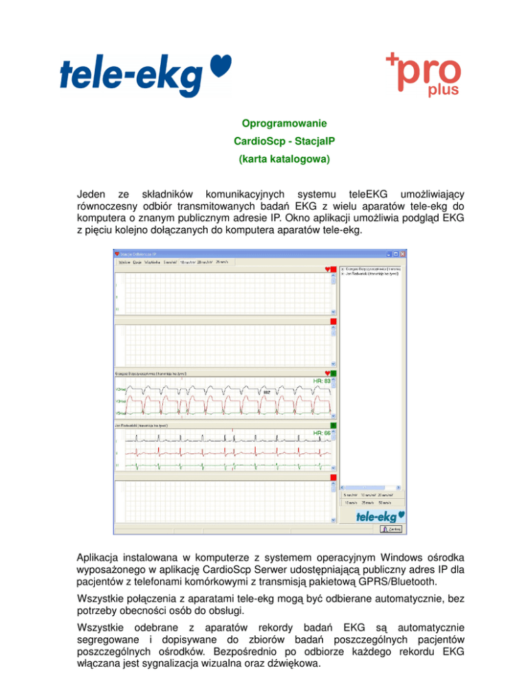 Oprogramowanie CardioScp - StacjaIP (karta katalogowa) Jeden ze składników komunikacyjnych systemu teleEKG umożliwiający równoczesny odbiór transmitowanych badań EKG z wielu aparatów tele-ekg do komputera o znanym publicznym adresie IP. Okno aplikacji umożliwia podgląd EKG z pięciu kolejno dołączanych do komputera aparatów tele-ekg. Aplikacja instalowana w komputerze z systemem operacyjnym Windows ośrodka wyposażonego w aplikację CardioScp Serwer udostępniającą publiczny adres IP dla pacjentów z telefonami komórkowymi z transmisją pakietową GPRS/Bluetooth. Wszystkie połączenia z aparatami tele-ekg mogą być odbierane automatycznie, bez potrzeby obecności osób do obsługi. Wszystkie odebrane z aparatów rekordy badań EKG są automatycznie segregowane i dopisywane do zbiorów badań poszczególnych pacjentów poszczególnych ośrodków. Bezpośrednio po odbiorze każdego rekordu EKG włączana jest sygnalizacja wizualna oraz dźwiękowa.
