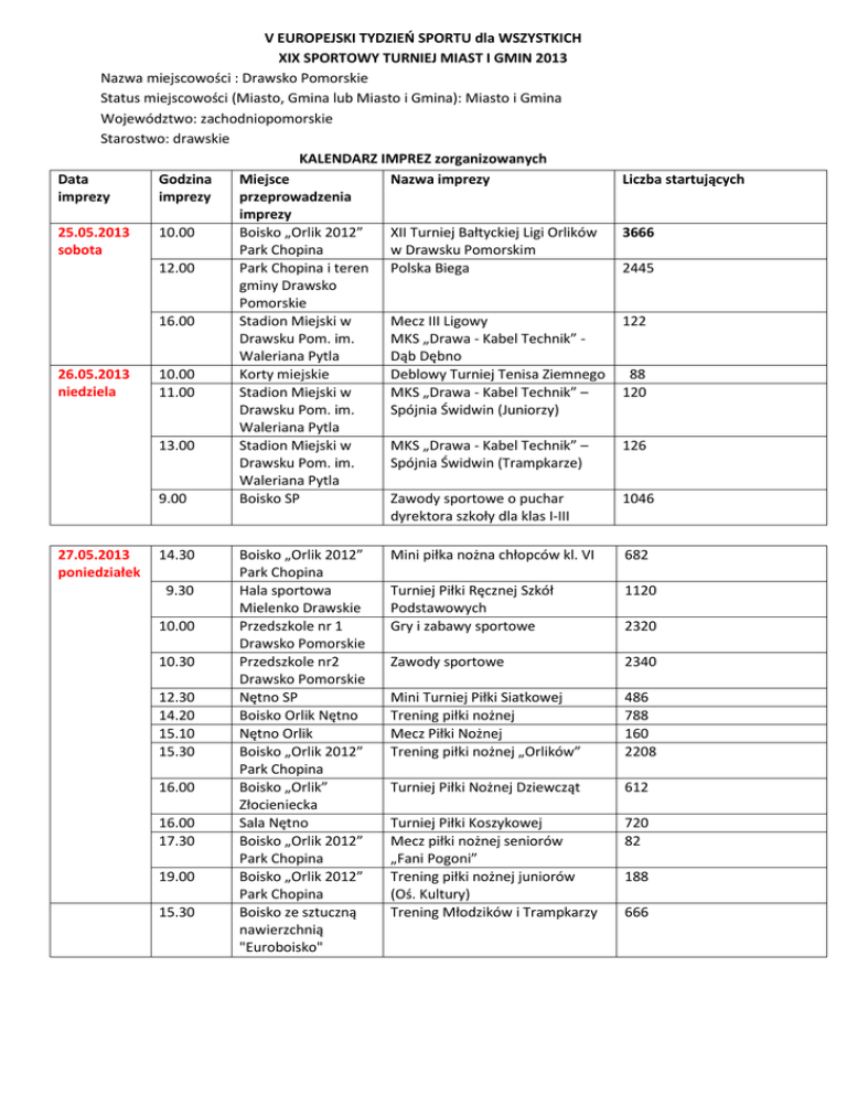 V EUROPEJSKI TYDZIEŃ SPORTU dla WSZYSTKICH XIX SPORTOWY TURNIEJ MIAST I GMIN 2013 Nazwa miejscowości : Drawsko Pomorskie Status miejscowości (Miasto, Gmina lub Miasto i Gmina): Miasto i Gmina Województwo: zachodniopomorskie Starostwo: drawskie KALENDARZ IMPREZ zorganizowanych Data Godzina Miejsce Nazwa imprezy imprezy imprezy przeprowadzenia imprezy 25.05.2013 10.00 Boisko „Orlik 2012” XII Turniej Bałtyckiej Ligi Orlików sobota Park Chopina w Drawsku Pomorskim 12.00 Park Chopina i teren Polska Biega gminy Drawsko Pomorskie 16.00 Stadion Miejski w Mecz III Ligowy Drawsku Pom. im. MKS „Drawa - Kabel Technik” Waleriana Pytla Dąb Dębno 26.05.2013 10.00 Korty miejskie Deblowy Turniej Tenisa Ziemnego niedziela 11.00 Stadion Miejski w MKS „Drawa - Kabel Technik” – Drawsku Pom. im. Spójnia Świdwin (Juniorzy) Waleriana Pytla 13.00 Stadion Miejski w MKS „Drawa - Kabel Technik” – Drawsku Pom. im. Spójnia Świdwin (Trampkarze) Waleriana Pytla 9.00 Boisko SP Zawody sportowe o puchar dyrektora szkoły dla klas I-III 27.05.2013 poniedziałek 14.30 9.30 10.00 10.30 12.30 14.20 15.10 15.30 16.00 16.00 17.30 19.00 15.30 Boisko „Orlik 2012” Park Chopina Hala sportowa Mielenko Drawskie Przedszkole nr 1 Drawsko Pomorskie Przedszkole nr2 Drawsko Pomorskie Nętno SP Boisko Orlik Nętno Nętno Orlik Boisko „Orlik 2012” Park Chopina Boisko „Orlik” Złocieniecka Sala Nętno Boisko „Orlik 2012” Park Chopina Boisko „Orlik 2012” Park Chopina Boisko ze sztuczną nawierzchnią "Euroboisko" Liczba startujących 3666 2445 122 88 120 126 1046 Mini piłka nożna chłopców kl. VI 682 Turniej Piłki Ręcznej Szkół Podstawowych Gry i zabawy sportowe 1120 Zawody sportowe 2340 Mini Turniej Piłki Siatkowej Trening piłki nożnej Mecz Piłki Nożnej Trening piłki nożnej „Orlików” 486 788 160 2208 Turniej Piłki Nożnej Dziewcząt 612 Turniej Piłki Koszykowej Mecz piłki nożnej seniorów „Fani Pogoni” Trening piłki nożnej juniorów (Oś. Kultury) Trening Młodzików i Trampkarzy 720 82 2320 188 666 28.05.2013 wtorek 16.00 13.00 10.30 12.00 13.30 14.30 13.30 15.10 16.30 16.00 17.00 14.00 10.00 – 13.00 15.30 17.00 29.05.2013 środa 14.00 10.00 10.00 11.45 12.30 15.30 14.30 16.00 11.00 14.30 15.00 17.00 17.00 17.30 17.00 Sala SP Drawsko Pomorskie Przedszole nr1 Drawsko Pomorskie Przedszkole nr 2 Drawsko Pomorskie Teren Nętna Sala Nętno Boisko „Orlik 2012” Park Chopina Boisko Nętno Nętno SP Orlik Boisko ze sztuczną nawierzchnią "Eruoboisko" Teren sołectwa Nętno Boisko „Orlik 2012” Park Chopina Boisko„Orlik” Złocieniecka Hala sportowa w Mielenku Drawskim Boisko „Orlik 2012” Park Chopina Boisko „Orlik 2012” Park Chopina Korty miejskie Przedszkole nr 1 Drawsko Pomorskie Przedszkole nr 2 Drawsko Pomorskie Hala Mielenko Drawskie Boisko Nętno Boisko ze sztuczną nawierzchnią "Eruoboisko" Nętno SP Sala SP Drawsko Pomorskie Sala SP Drawsko Pomorskie Sala SP Drawsko Pomorskie Boisko „Orlik 2012” Park Chopina Teren gminy Drawsko Pomorskie Boisko „Orlik 2012” Boisko „Orlik 2012” Drawsko Pomorskie Boisko „Orlik 2012” Zawody mini piłki siatkowej chłopców kl. V-VI(dwójki) Gry i zabawy sportowe 198 Konkurencje sportowe 1987 Biegi Przełajowe Turniej Dwa Ognie dla kl. II - III Trójbój lekkoatletyczny dla klas IV dziewcząt i chłopców Turniej w dwa ognie Mecz piłki nożnej dziewczęta kontra chłopcy Trening Seniorów i Juniorów 704 88 1289 Rodzinne biegi Przełajowe 433 Trening MMA 612 Turniej Piłki Nożnej Chłopców 412 Szkolna Liga Mini Piłki Ręcznej Klas III i IV Trening piłki nożnej „Orlików” 366 Zajęcia rekreacyjne z tenisa stołowego i piłkarzyków 688 Trening Tenisa Ziemnego Gry i zabawy 108 3688 Konkurencje sportowe 2266 Turniej Jedynek Siatkarskich dziewcząt Konkurencje sportowe kl. I-III Trening Młodzików i Trampkarzy 66 Konkurencje sportowe dla kl. IV-VI Zawody mini piłki siatkowej chłopców kl. V-VI(dwójki) Trzecioolimpijczyk - konkurencje sportowe Turniej „Trojek koszykarskich” dla dziewcząt klas V - VI Trening piłki nożnej „Orlików” 2224 487 Rajd Rowerowy 1287 Trening MMA Trening BJJ 688 2188 Mikstowy Turniej Piłki Siatkowej 1160 2184 286 122 368 1208 1240 644 8429 466 1276 18.00 17.00 30.05.2013 czwartek 14.30 11.00 13.30 16.00 15.00 15.30 17.00 17.30 18.30 16.30 31.05.2013 piątek 13.30 10.00 10.00 8.00 Sz.P. Nętno Boisko „Orlik 2012” Park Chopina Boisko ze sztuczną nawierzchnią "Euroboisko" Boisko „Orlik 2012” w Parku Chopina Teren miasta Drawsko Pomorskie I kościoły gminne Boisko Nętno Sala Nętno Boisko sportowe Linowno Boisko „Orlik 2012” Park Chopina Boisko „Orlik 2012” Park Chopina Teren SP Nętno Boisko „Orlik 2012” Park Chopina Boisko ze sztuczną nawierzchnią "Eruoboisko" Sala SP Drawsko Pomorskie Przedszkole nr 1 Drawsko Pomorskie Przedszkole nr 2 Drawsko Pomorskie Teren sołectwa Nętno 12.40 Boisko Nętno 14.00 14.20 14.00 Korty miejskie Boisko Nętno Plac przy Ośrodku Kultury Boisko „Orlik 2012” Park Chopina Świetlica wiejska Nętno Boisko „Orlik 2012” Park Chopina Boisko ze sztuczną nawierzchnią "Eruoboisko" Boisko ze sztuczną nawierzchnią "Eruoboisko" 15.30 17.00 17.30 15.30 17.00 Mecz piłki siatkowej 88 Trening Seniorów i Juniorów 688 Zawody piłki nożnej dla uczniów klas IV-V Procesja 1383 Mini turniej unihokeja Mecz piłki siatkowej Chłopcydziewczęta Turniej Piłki Siatkowej 444 168 Trening piłki nożnej „Orlików” 1276 Mecz piłki nożnej seniorów „Fani Pogoni” Aerobic dla aktywnych Mecz Piłki Nożnej Prawników 123 Trening Seniorów 444 Zawody mini piłki siatkowej dziewcząt III-IV Gry i zabawy sportowe 876 Gry i zabawy 2644 Wędrujemy po regionie- rajd pieszy dla najmłodszych z konkurencjami sportowymi Mini Turniej Piłki Nożnej dla Najmłodszych Trening Tenisa Ziemnego Trening piłki nożnej dla chętnych Zabawy i konkursy ruchowe dla dzieci i młodzieży Trening piłki nożnej „Orlików”